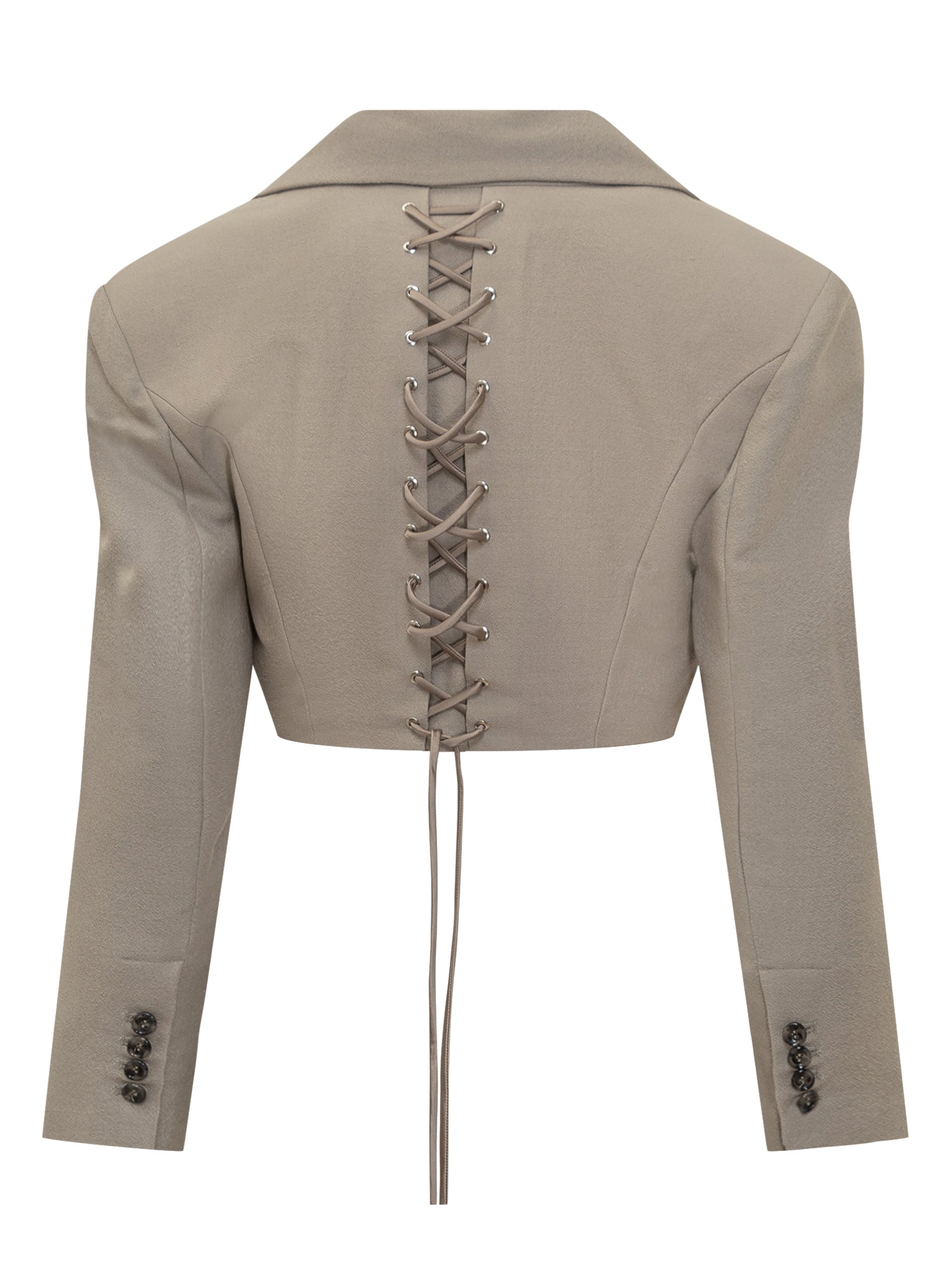 Marella Co-Design cropped beige jacket with classic lapel, hook closure and side lace-up details.