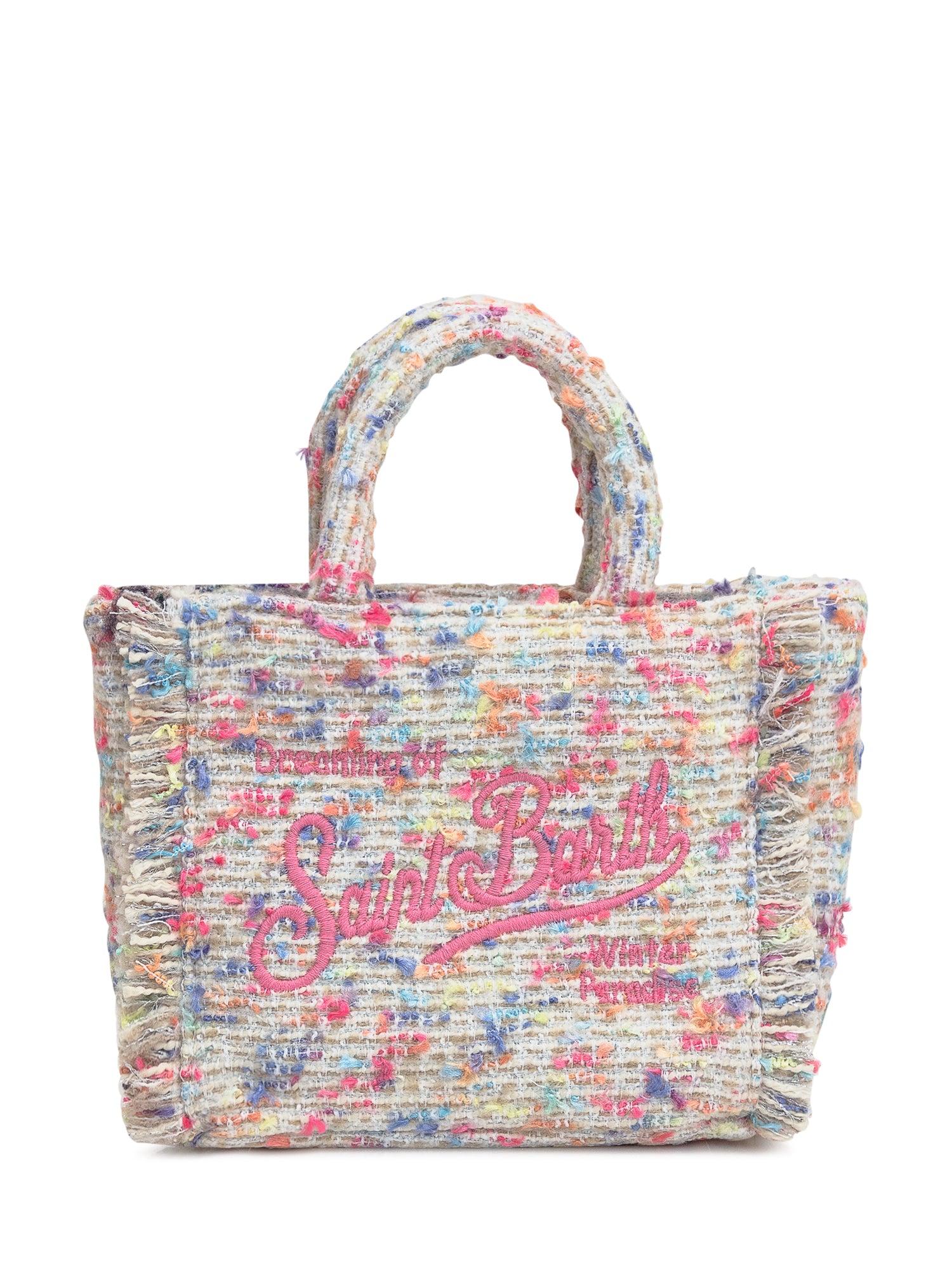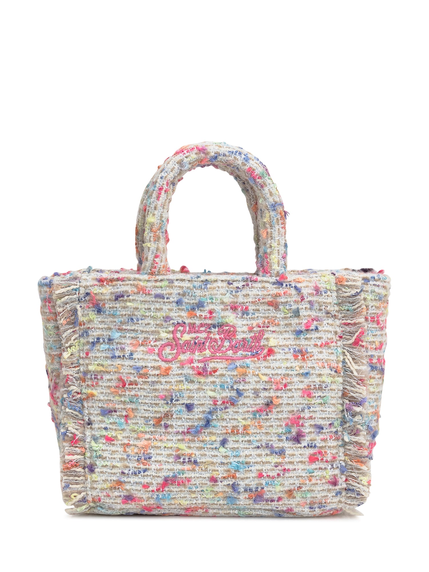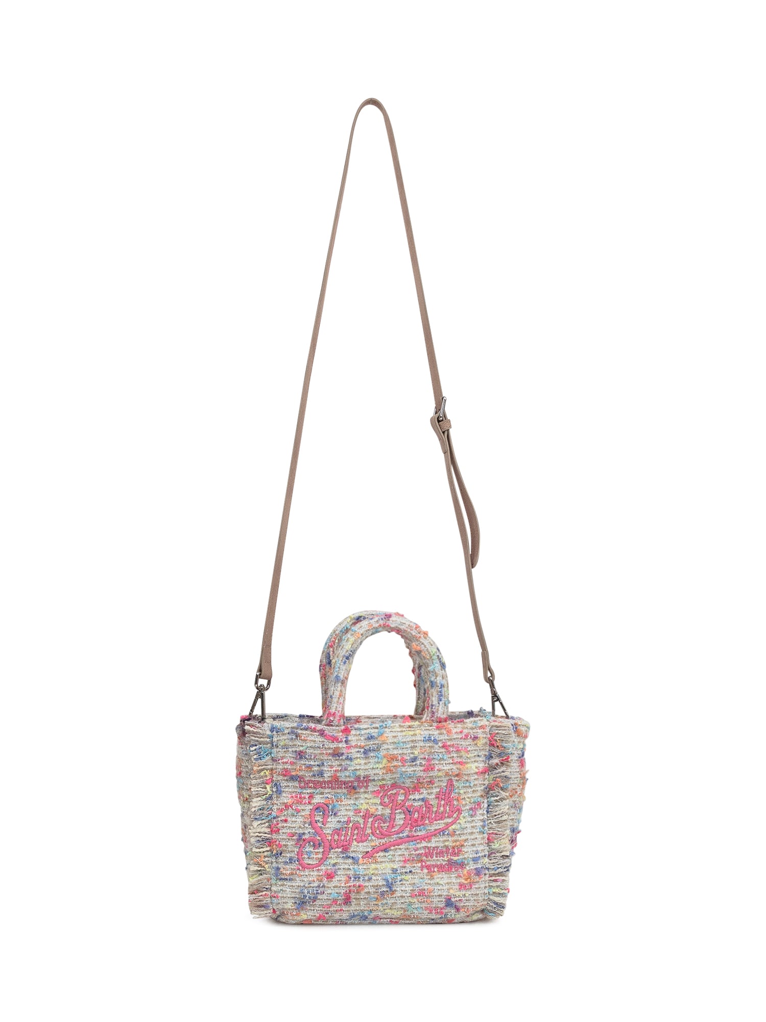 Multicolor wool blend hand bag. Zipper closure. Adjustable and removable shoulder strap. Inside pocket with zipper. Woven tweed motif. Embroidered logo on front and back.