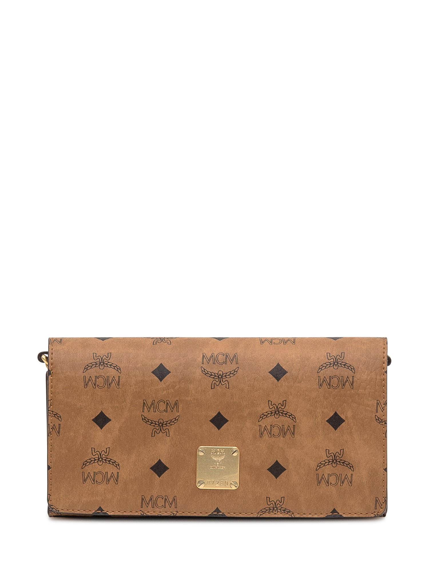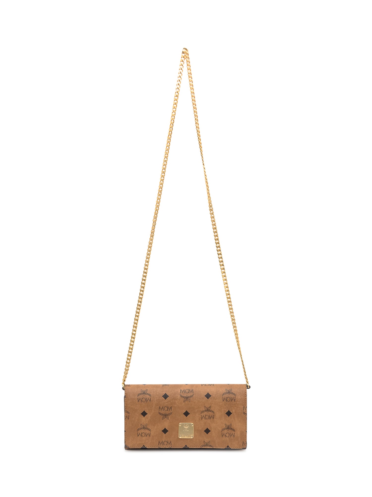 MCM crossbody bag in Cognac. Compact and elegant, it features the iconic all-over MCM monogram, a gold-tone chain strap, and a front logo plaque.