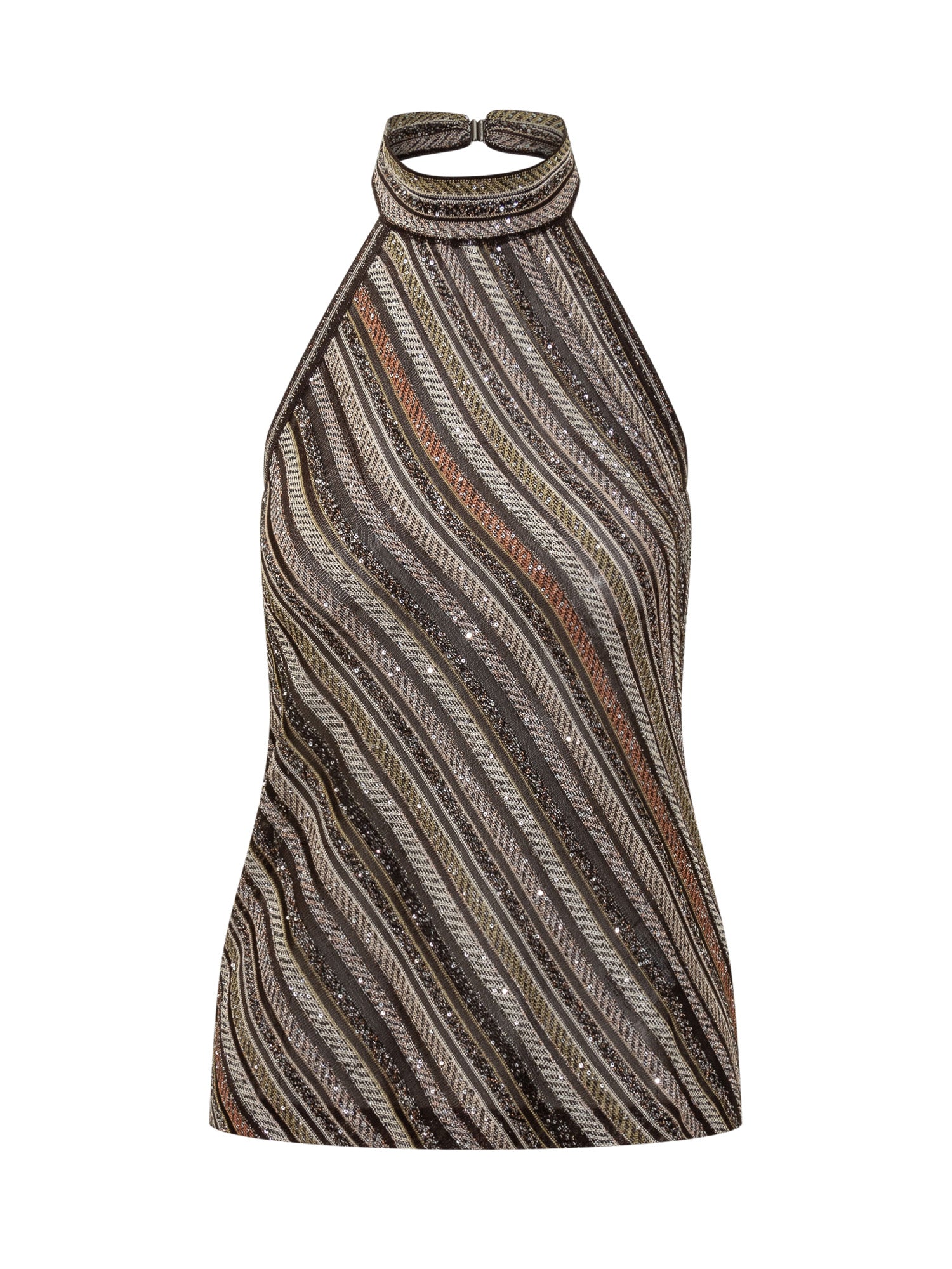 Missoni lurex knit top with multicolor diagonal stripes. Halterneck with back hook closure.