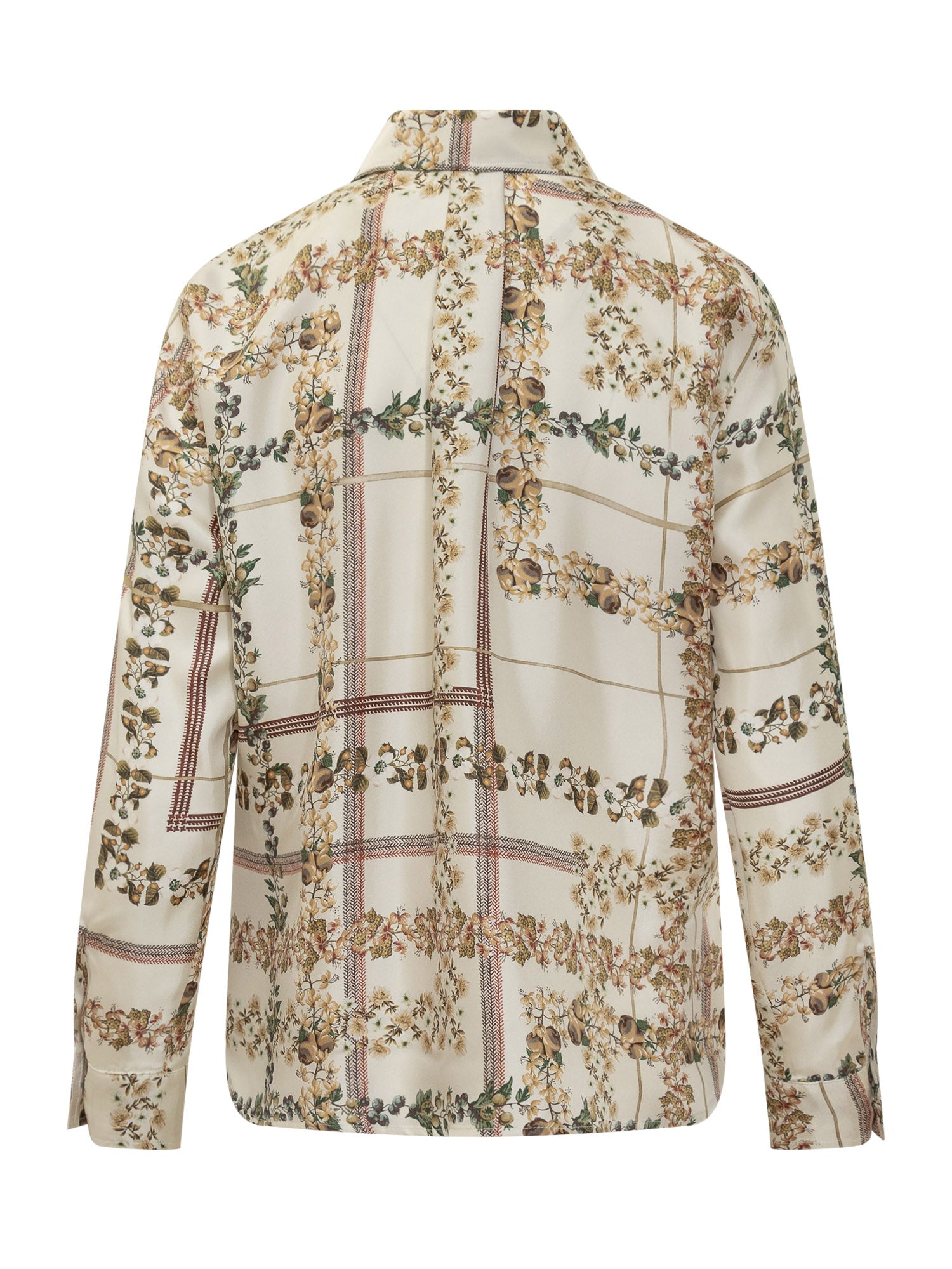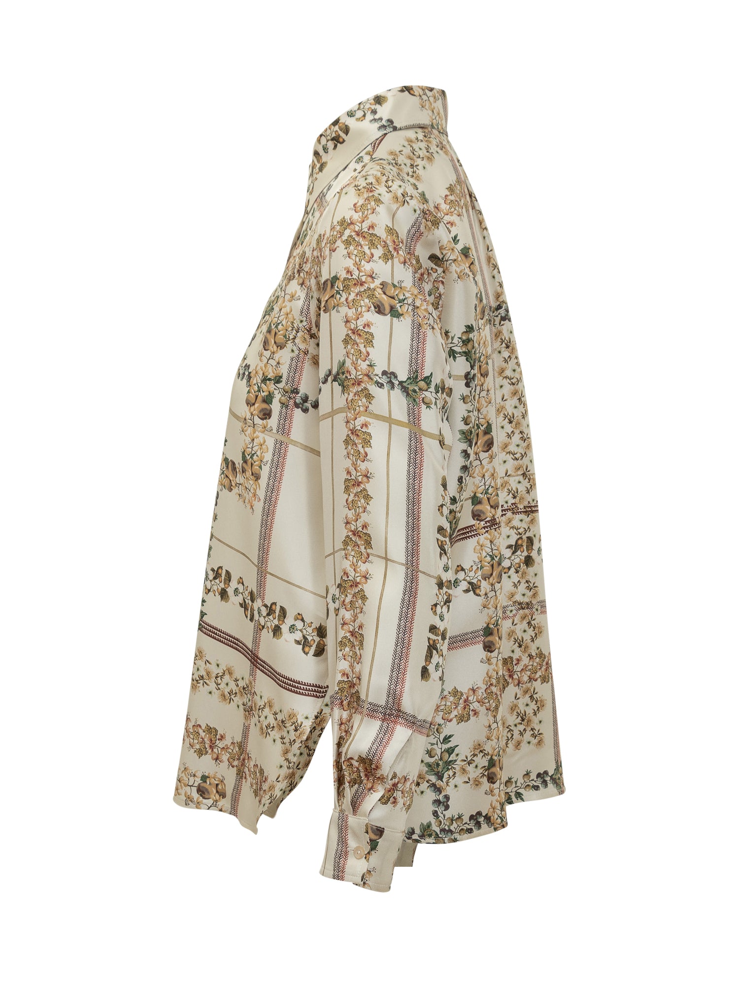 Monomì satin shirt with floral print on light base, classic collar and hidden front buttons.