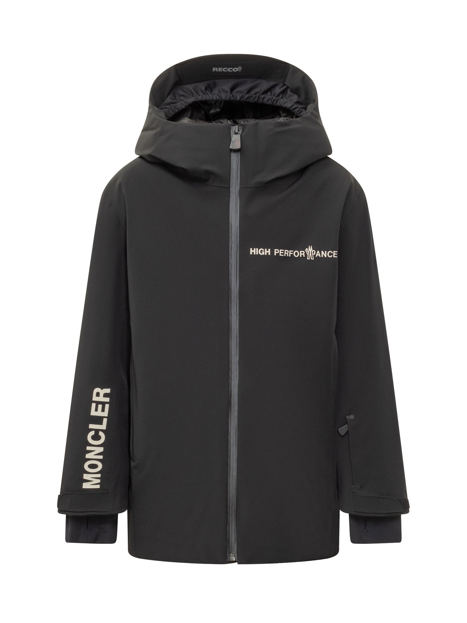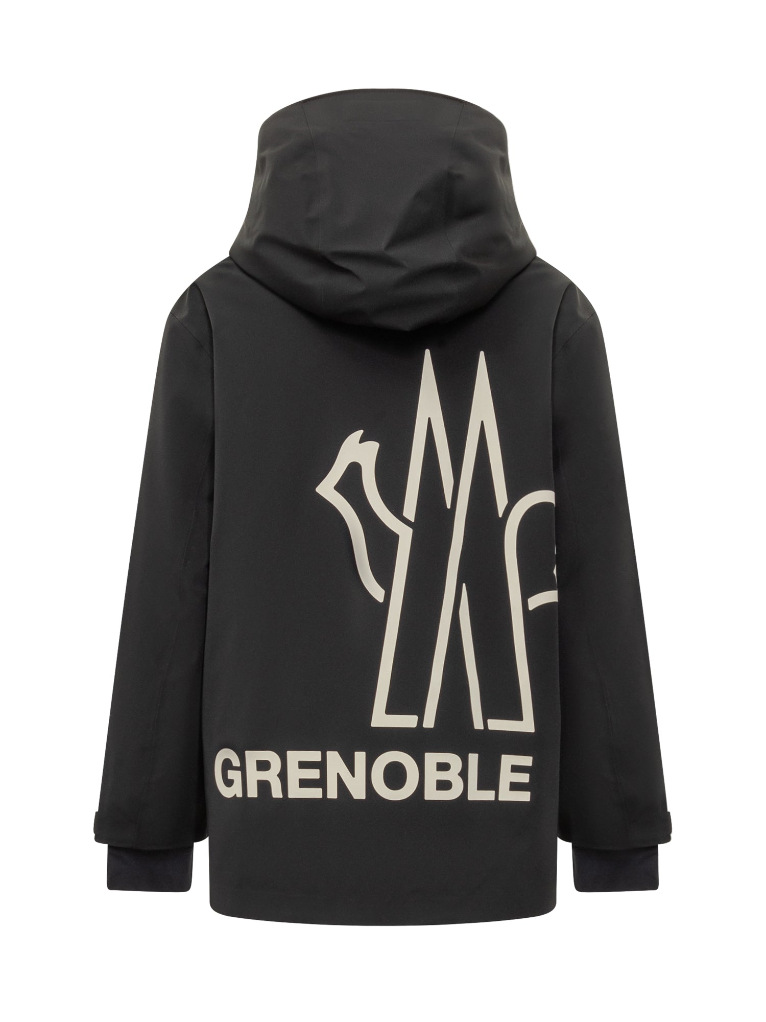 Hooded jacket with high collar. Zipper closure. Elasticized hems. Three pockets. Logo printed on sleeve.