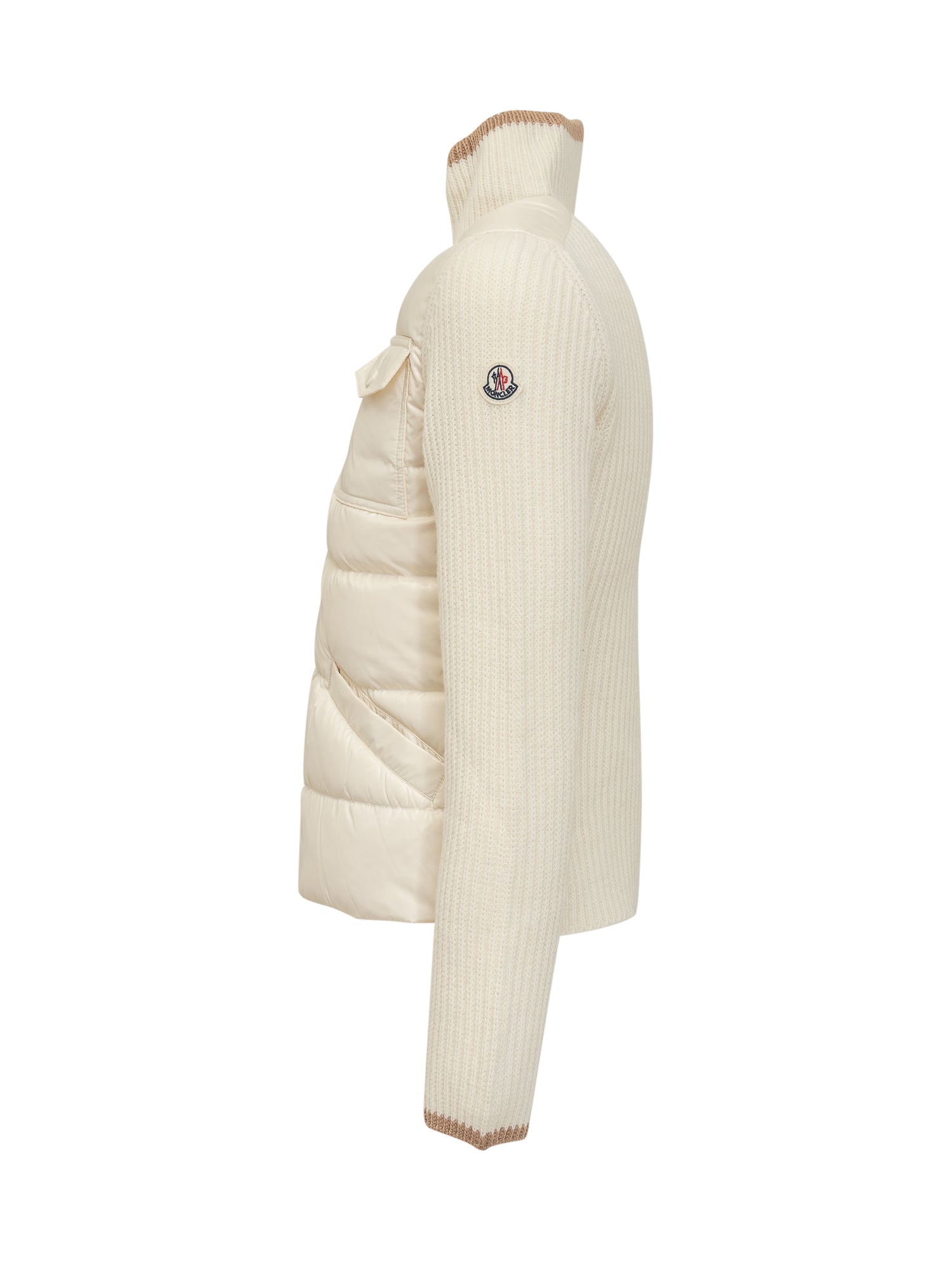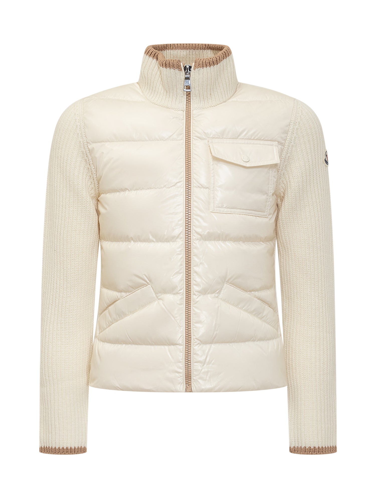 Padded jersey with long sleeves. Knitted sleeves. High collar. Zipper closure. Ribbed cuffs. Three pockets on front. Logo patch on sleeve.