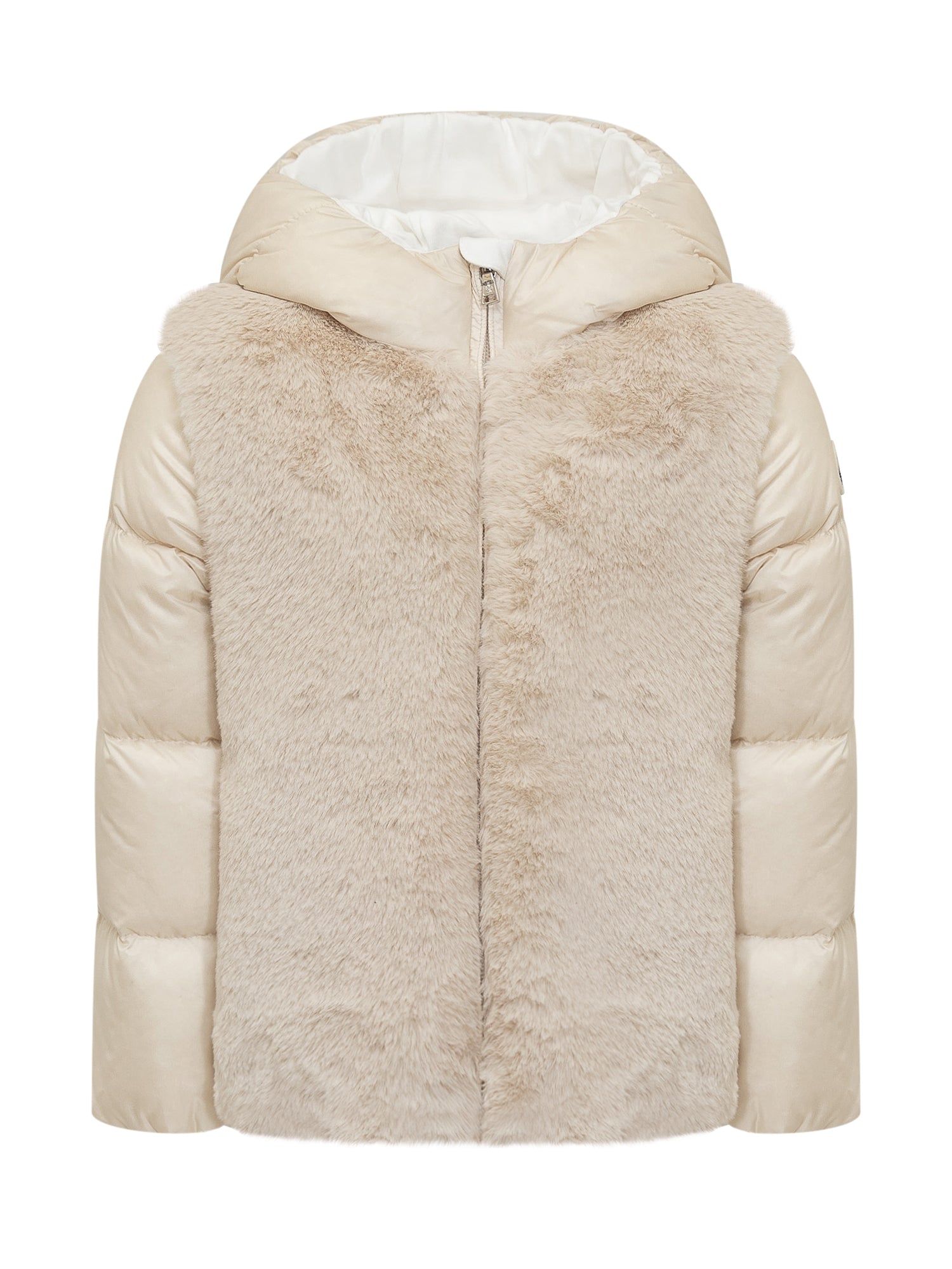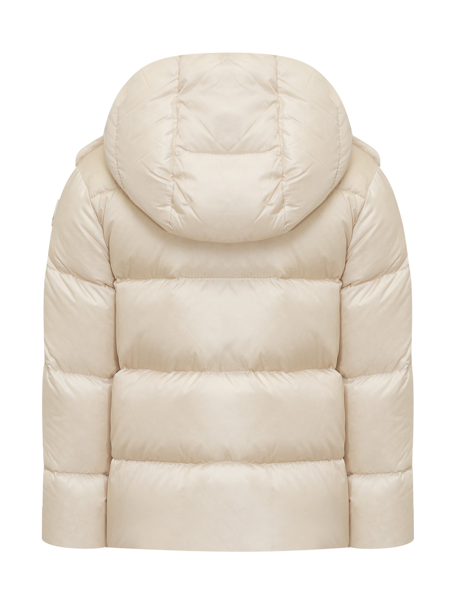 Beige down jacket with hood. Long sleeves. Logo on the sleeve. Zipper front closure. Flush pockets with stitched flap. Quilted fabric. Fabric detail on front.