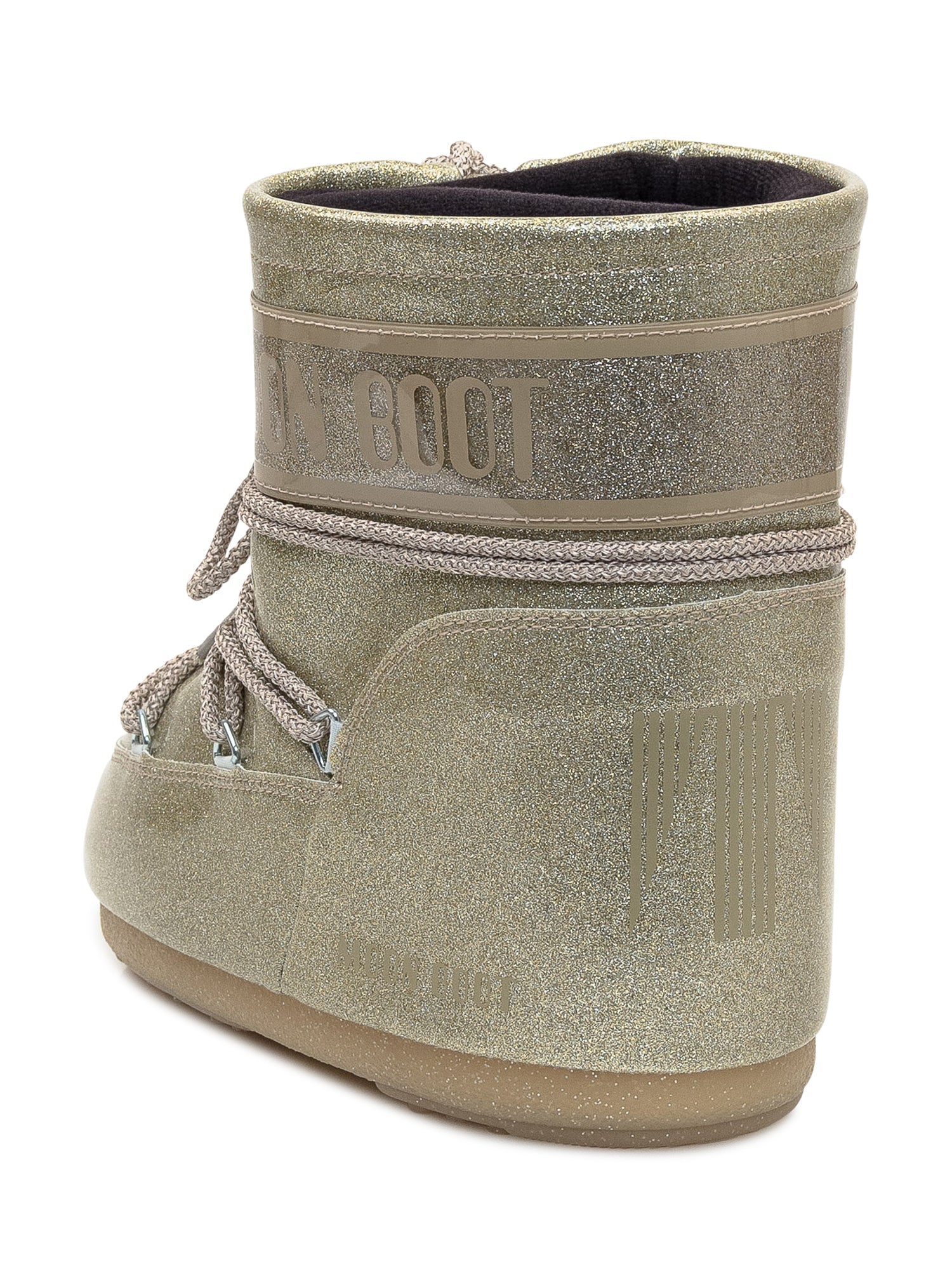 Gold glitter boot. Closure with laces. Moon Boot lettering on the sides and ankle. Graphic logo on the back.