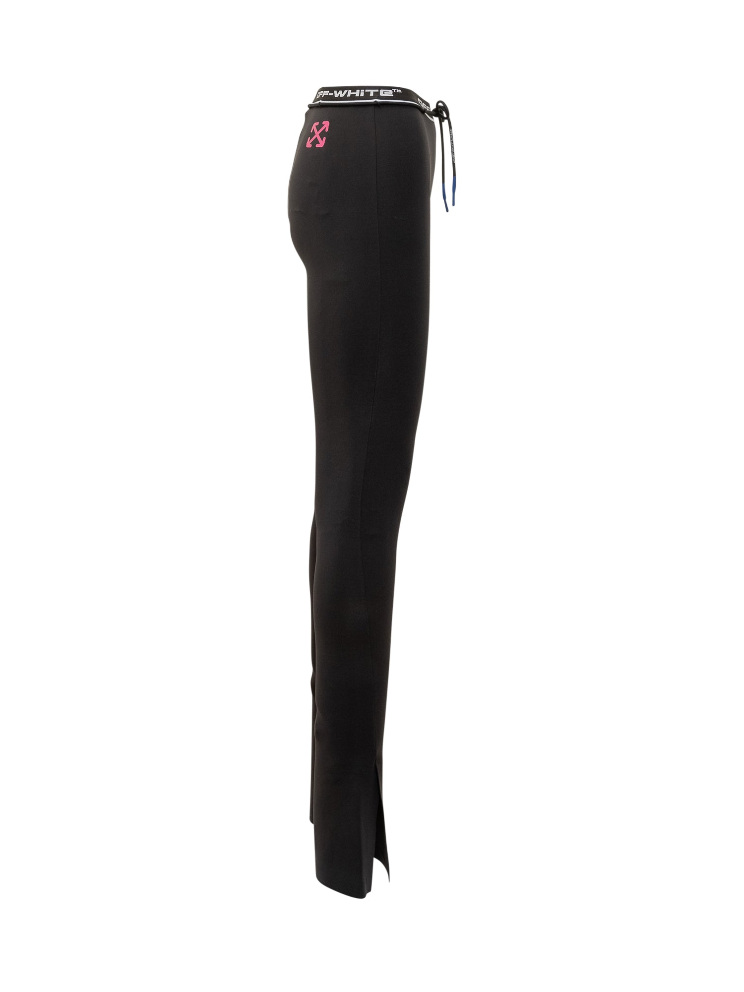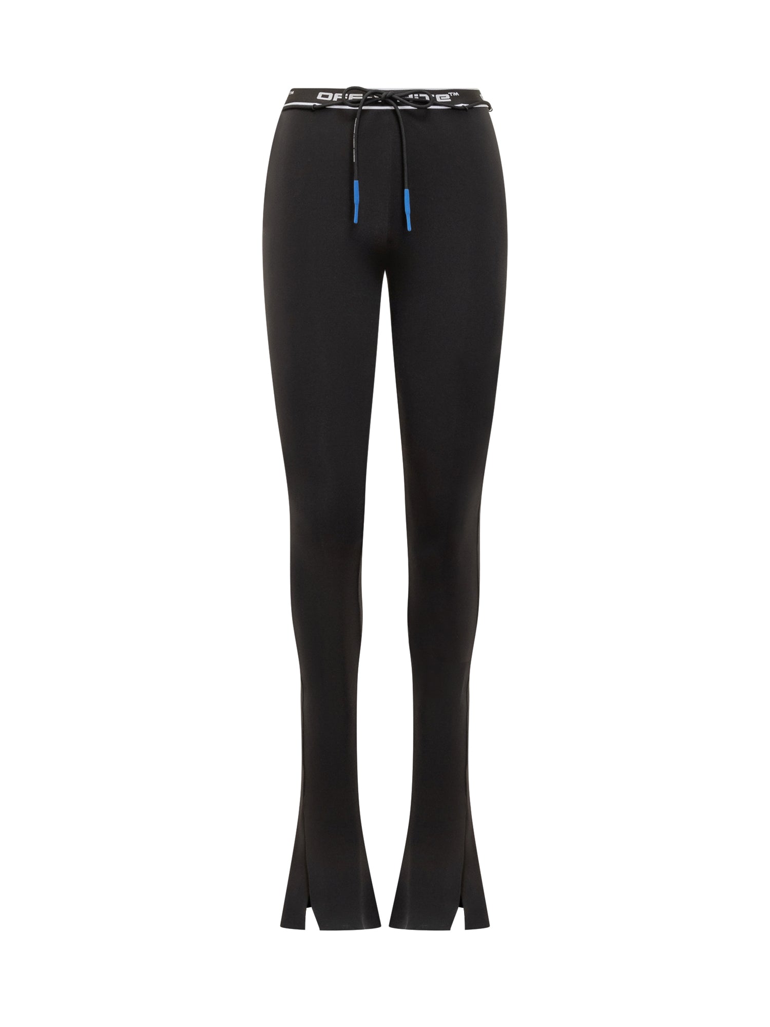 Off-White black stretch leggings featuring a logo elastic waistband, blue-tipped drawstring, and front slits at the hem.