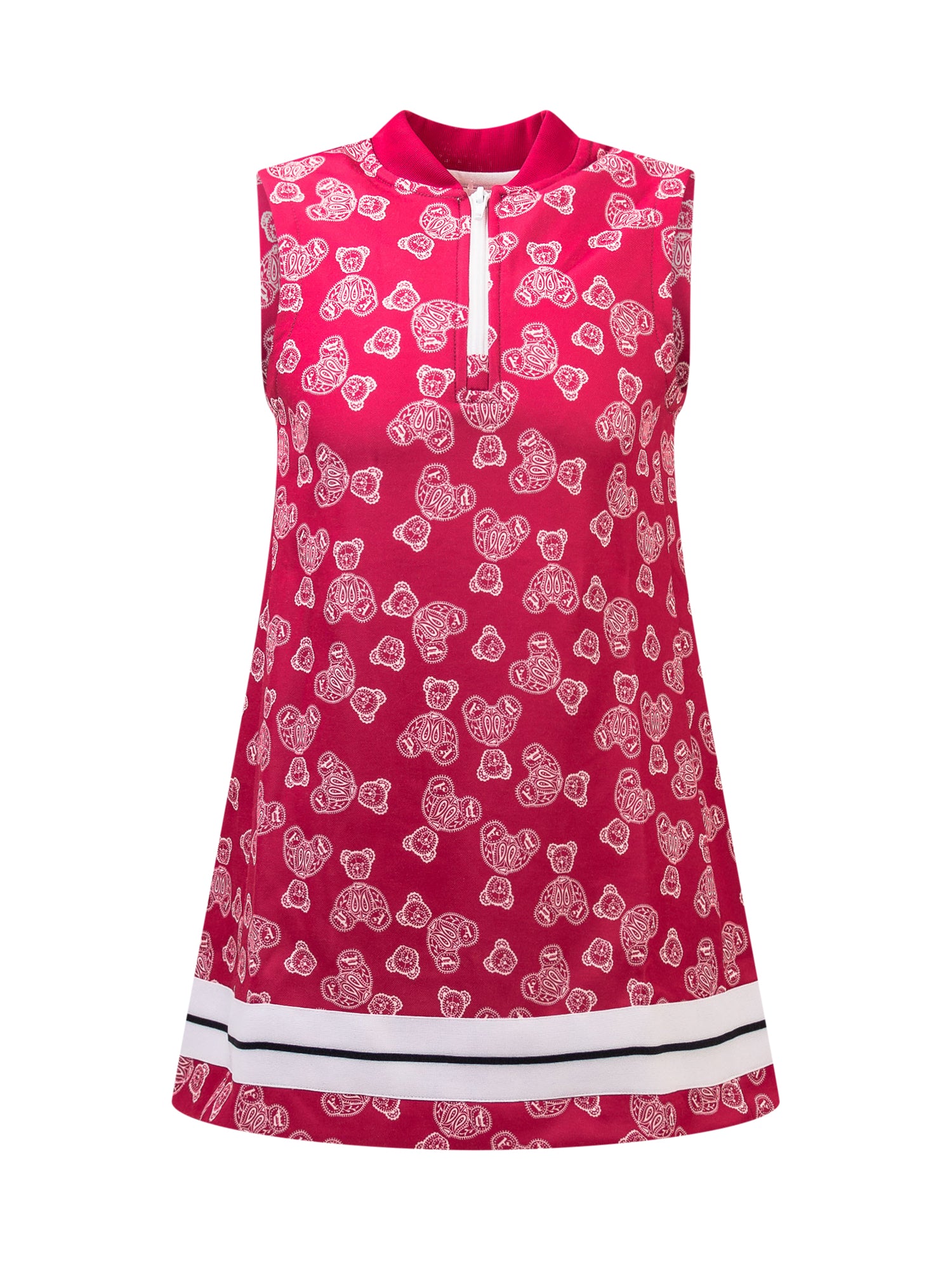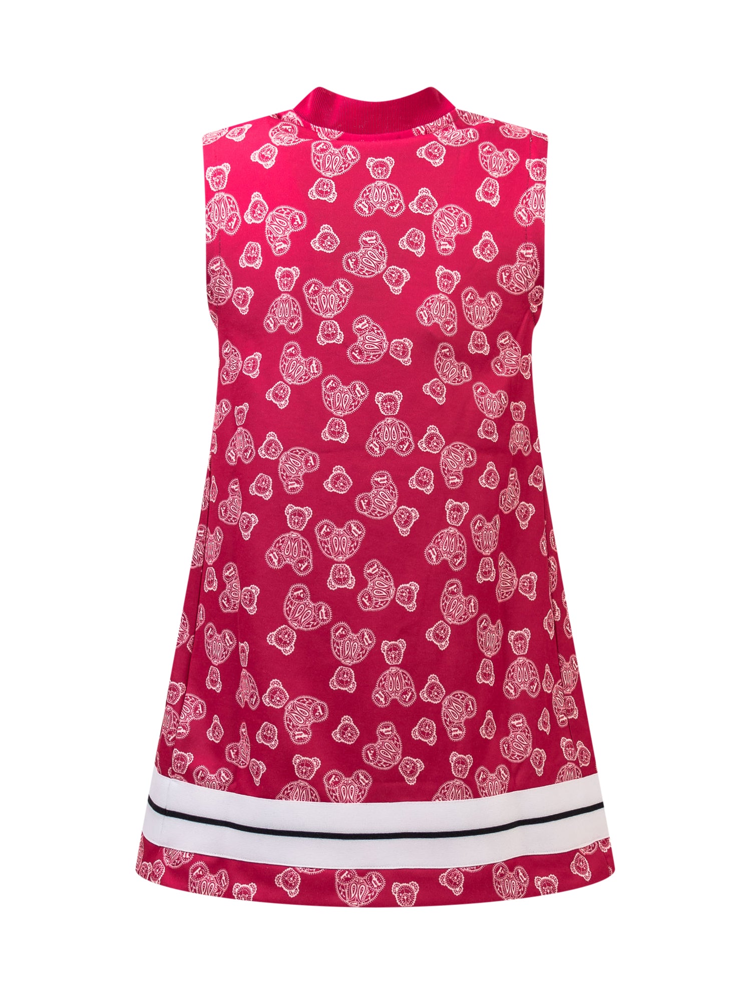 Pink sleeveless dress with all-over Paisley Bear pattern. Ribbed collar. Zip closure on the front.