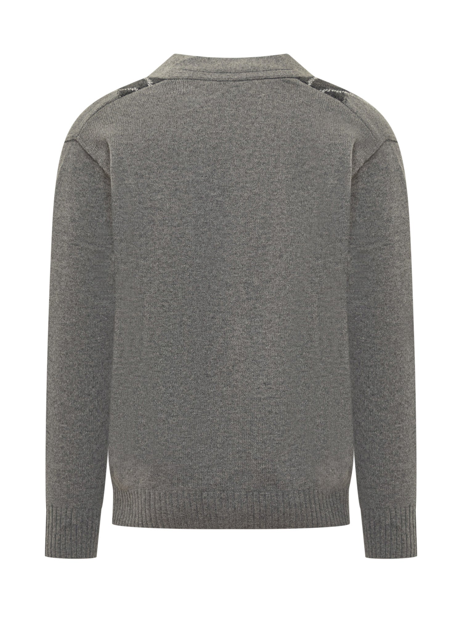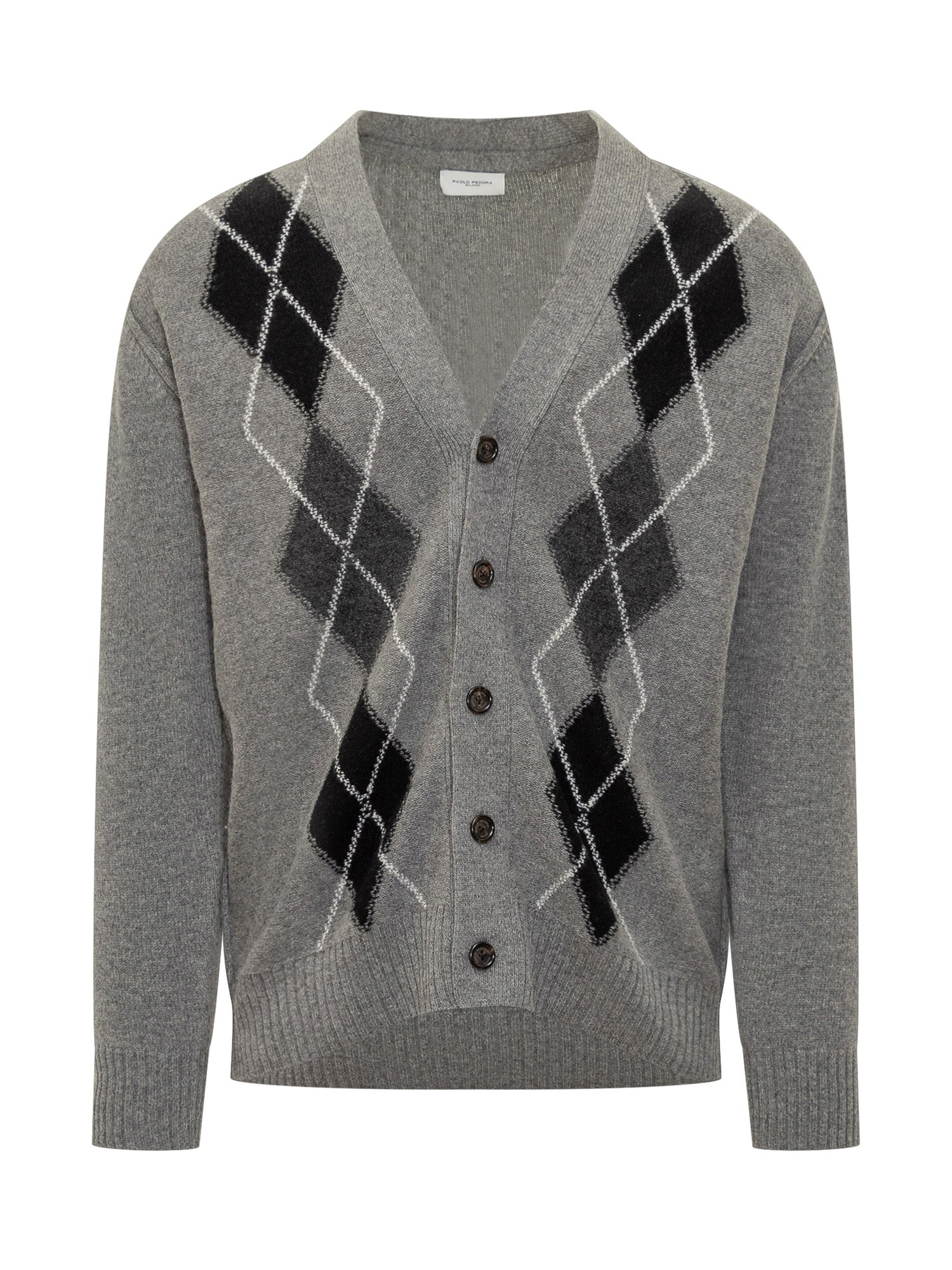 Paolo Pecora gray wool cardigan featuring a classic argyle pattern in black and charcoal tones. Button closure.