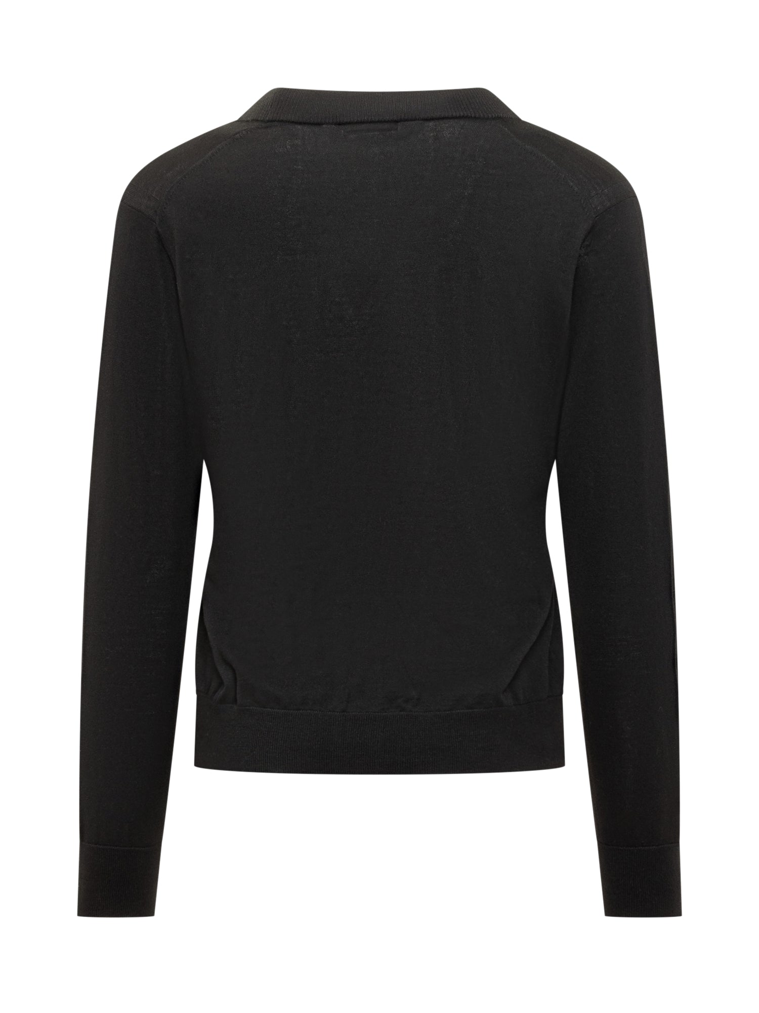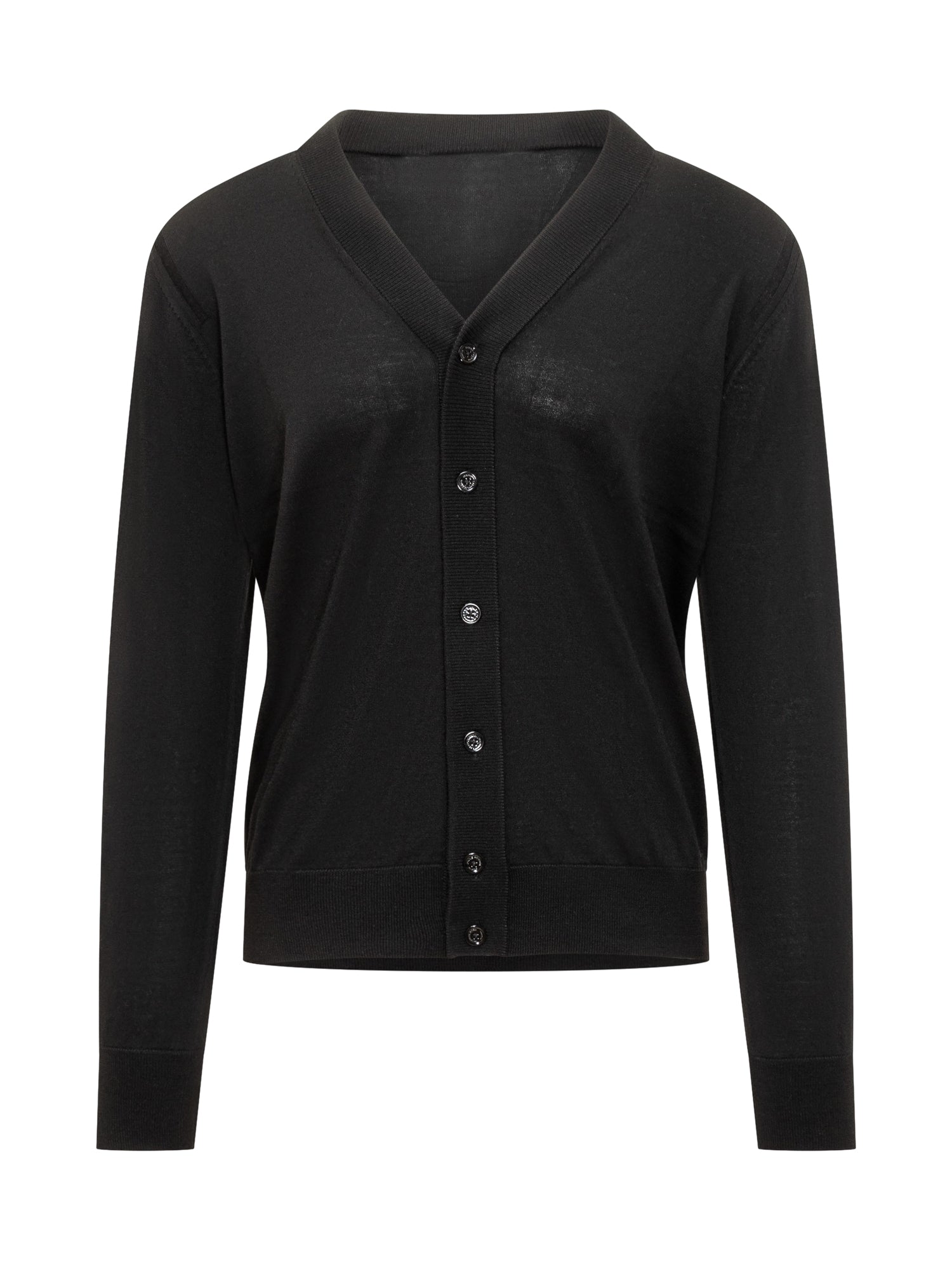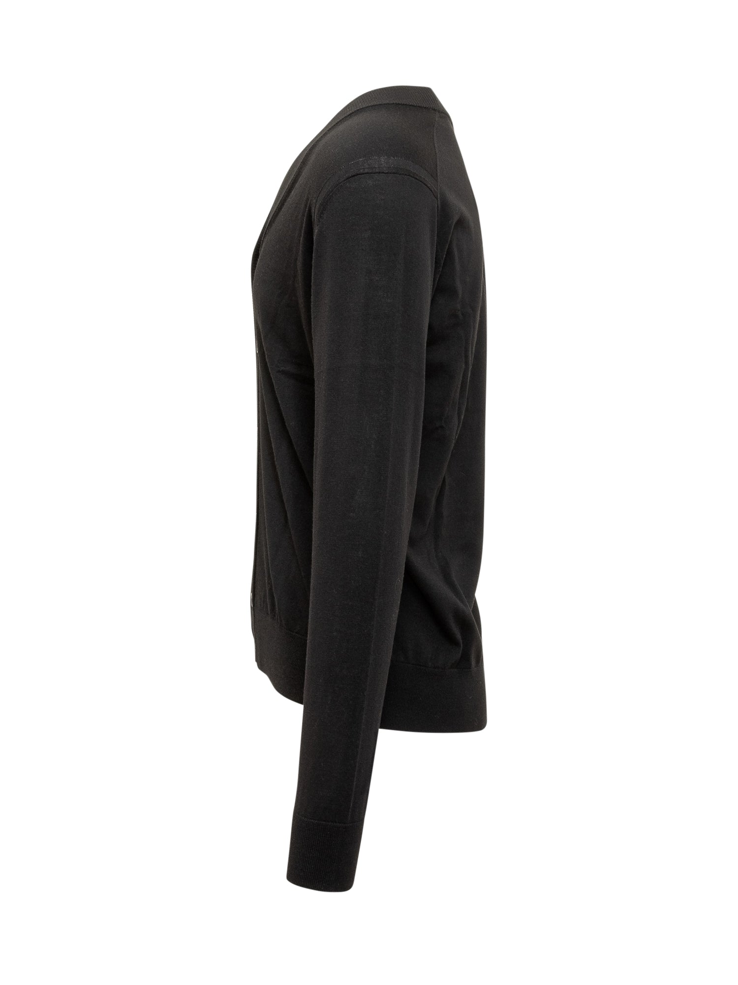 Paolo Pecora lightweight black wool cardigan with V-neck and button closure. A versatile and timeless piece.