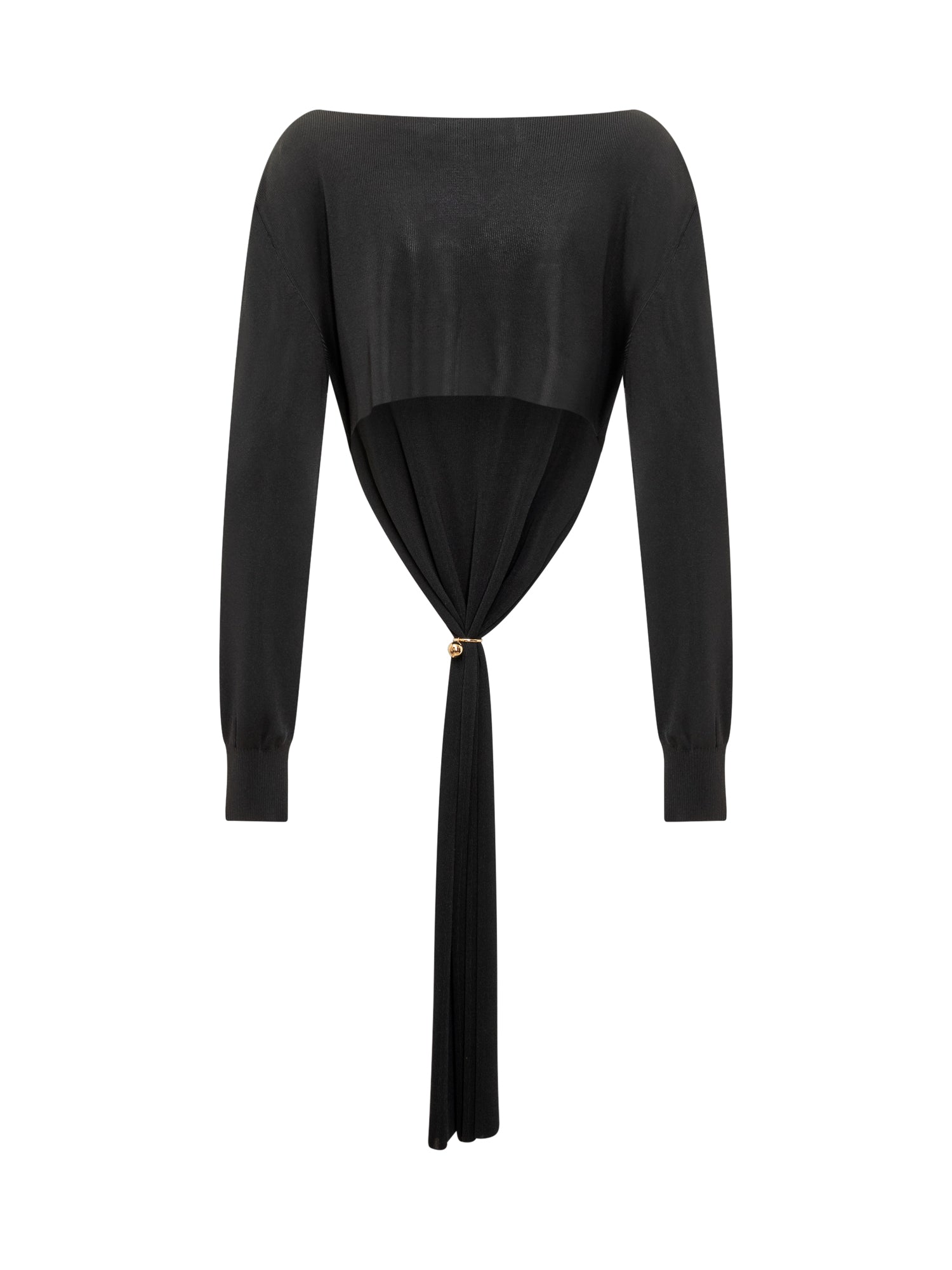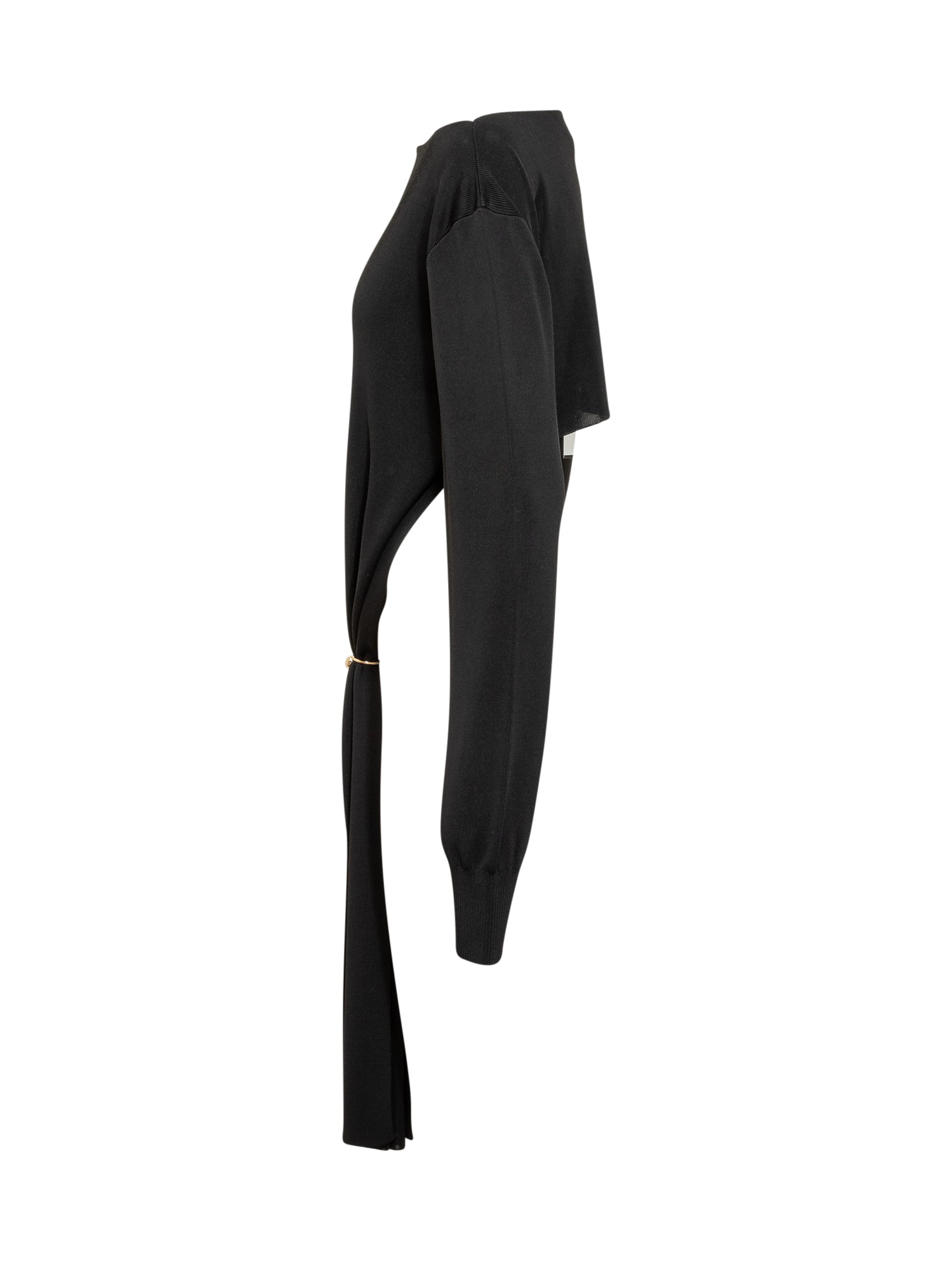 Crop sweater with extra-long viscose sleeves. Boat neckline. Draping on the front. Metal ball piercing on the front.