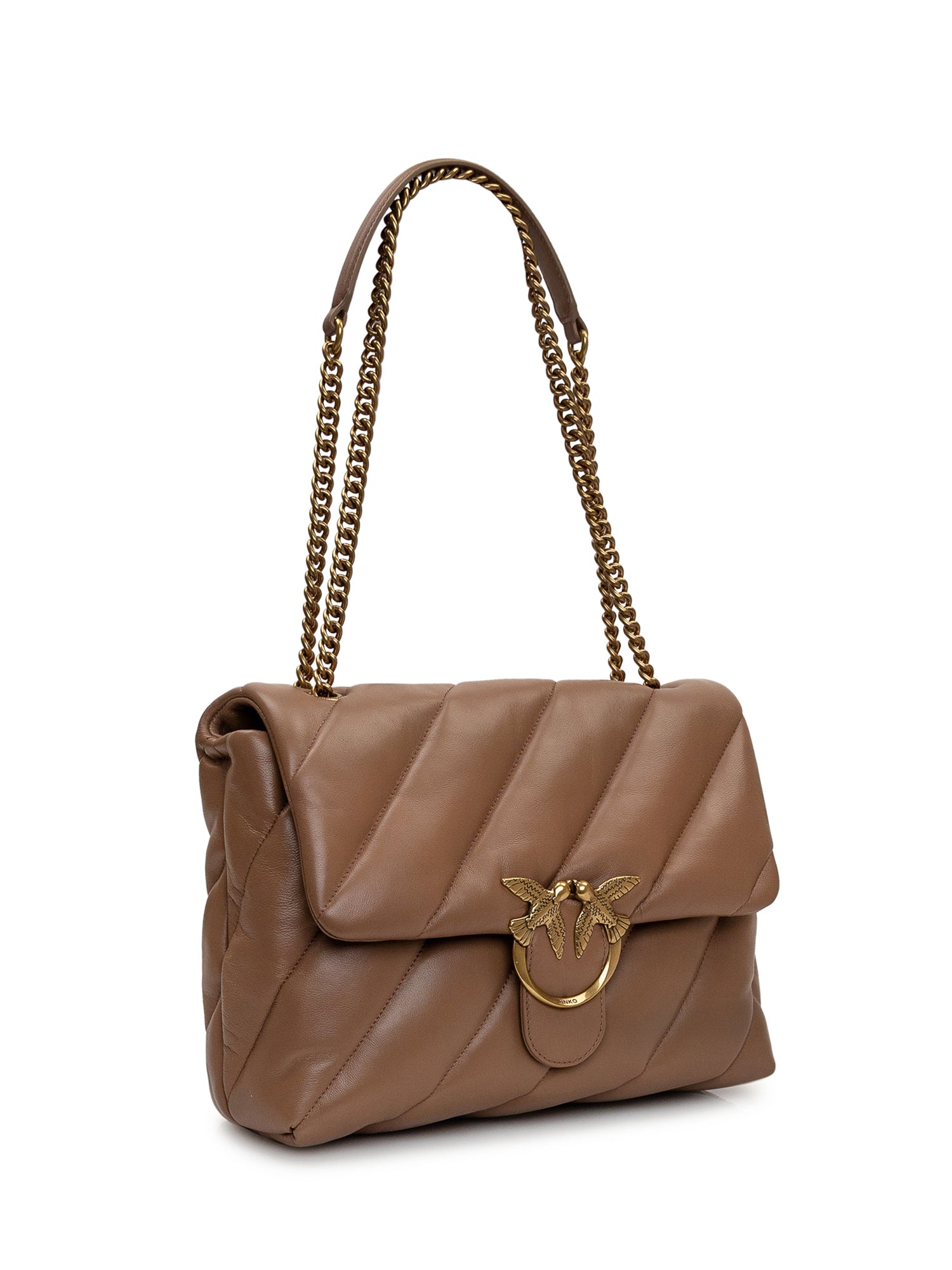 Brown leather bag. Chain shoulder strap. Flap and snap closure. Buckle with Love Bird Diamond Cut logo. Two compartments with zip pocket.