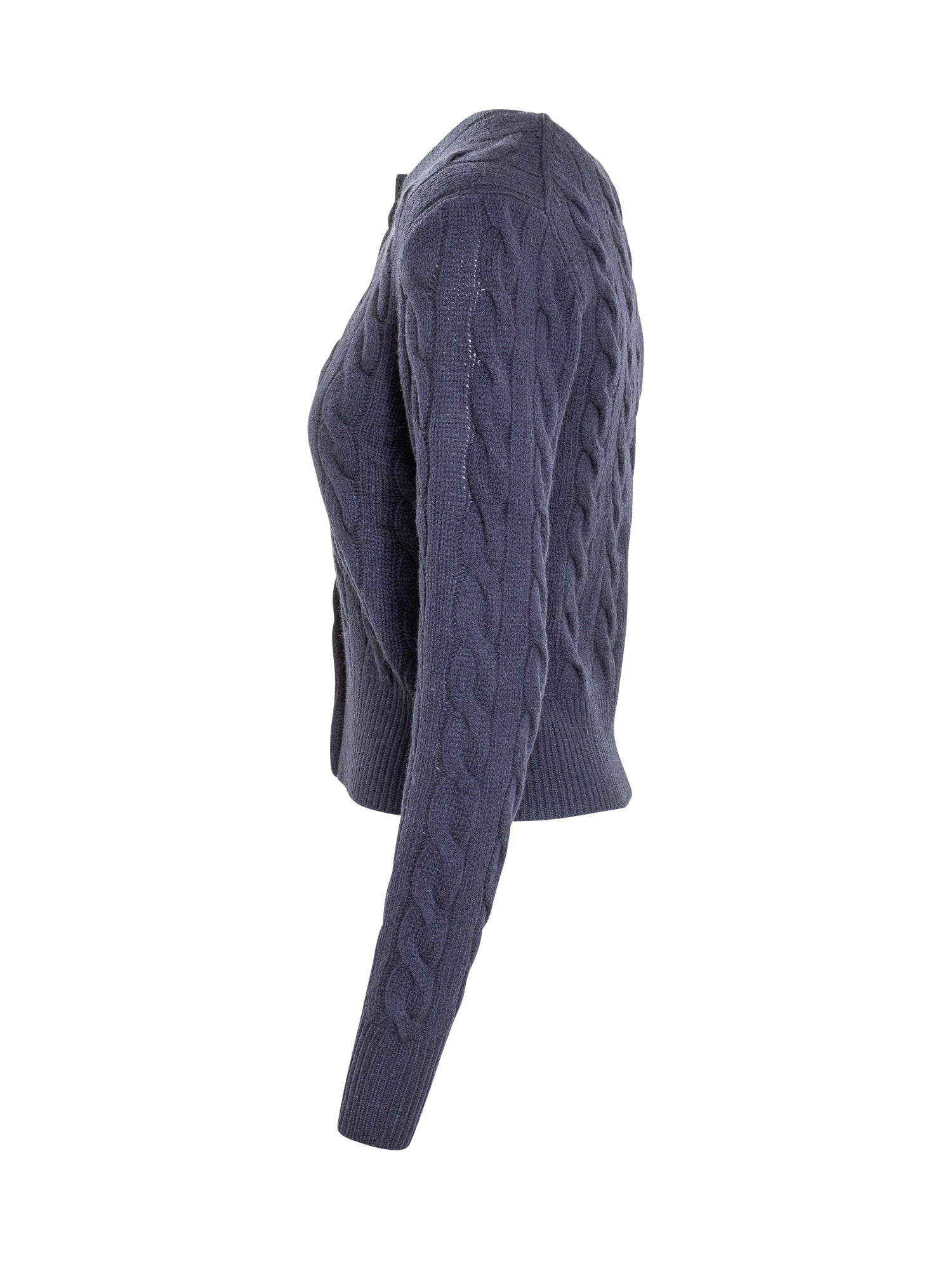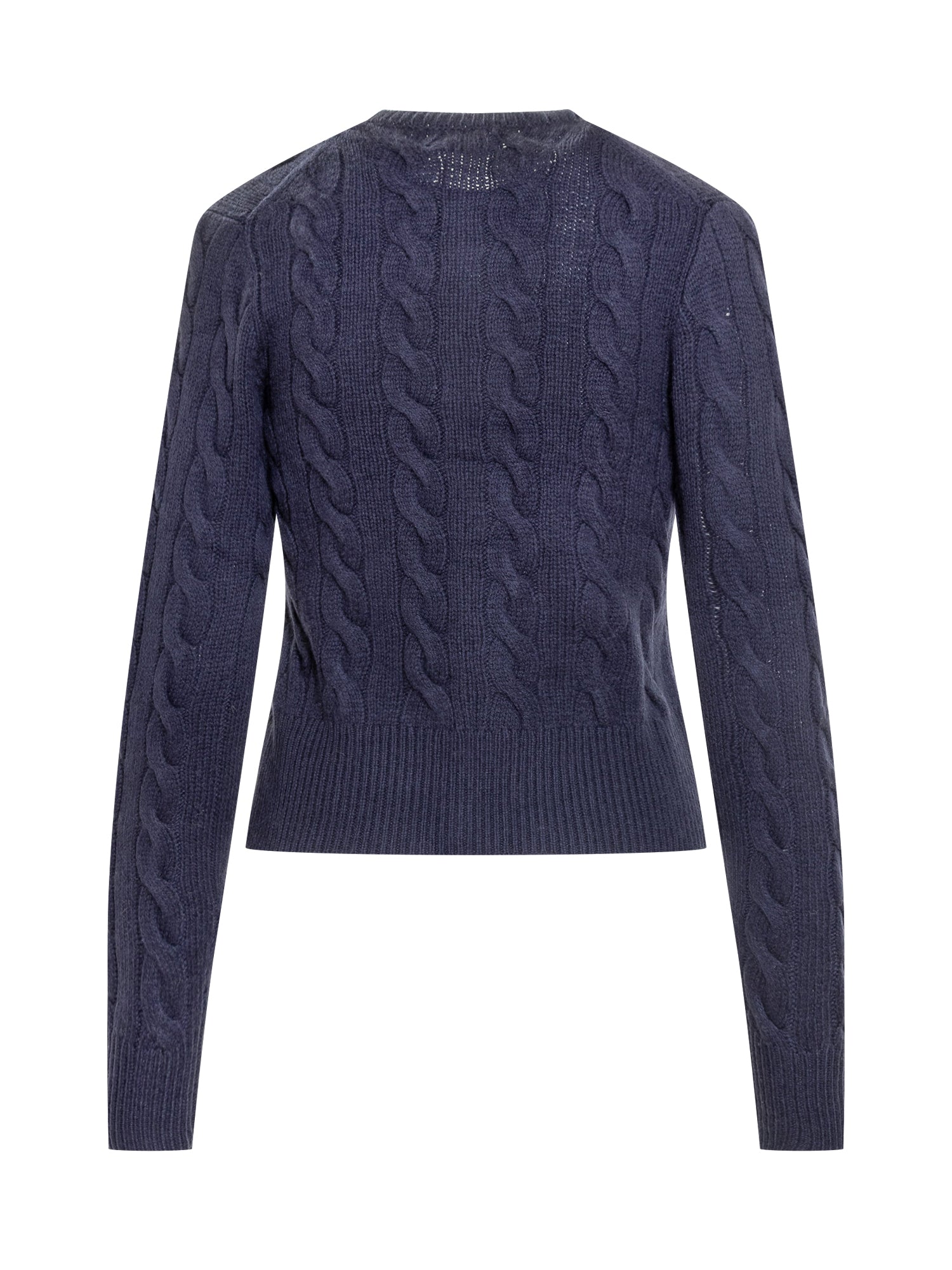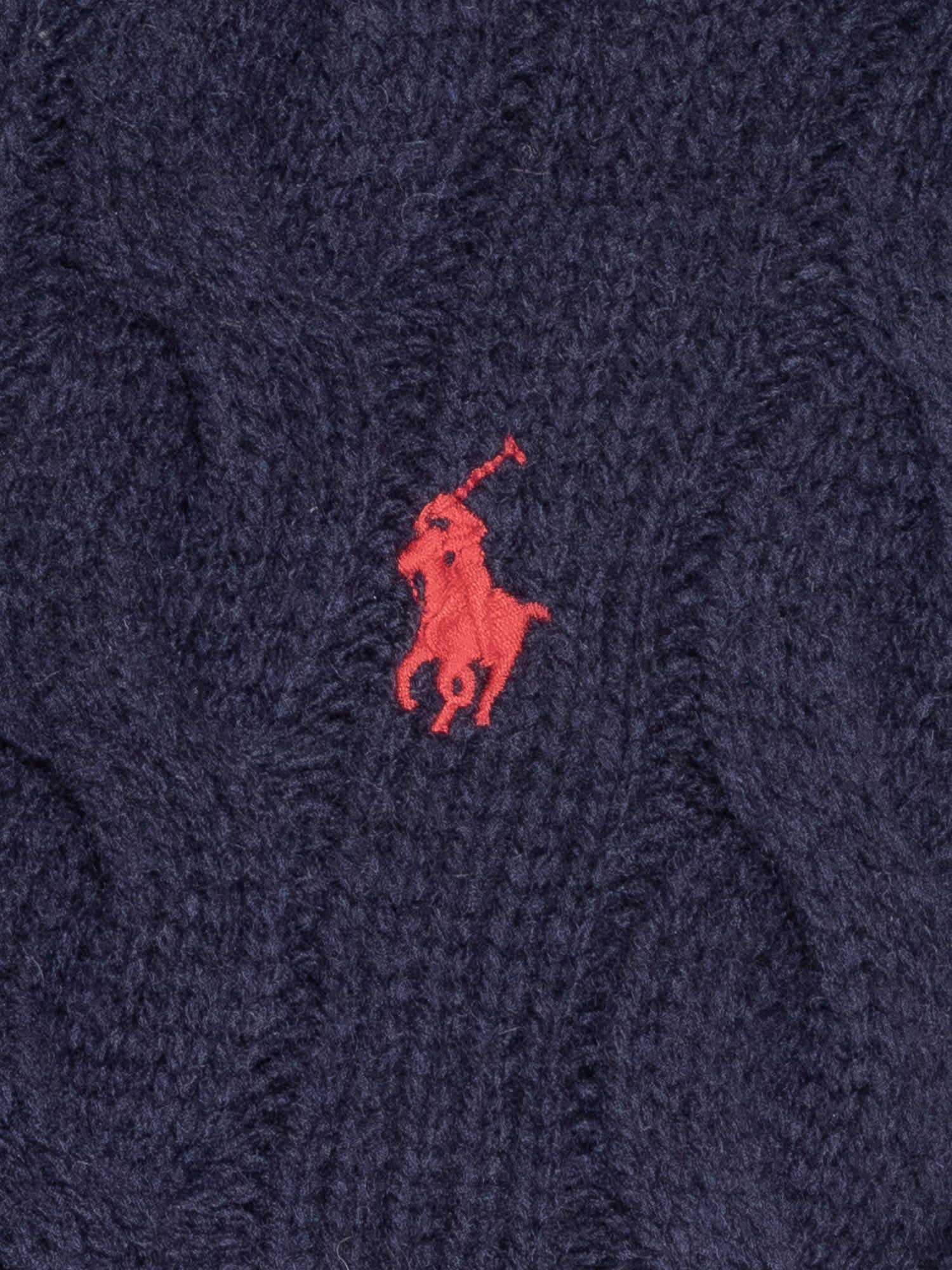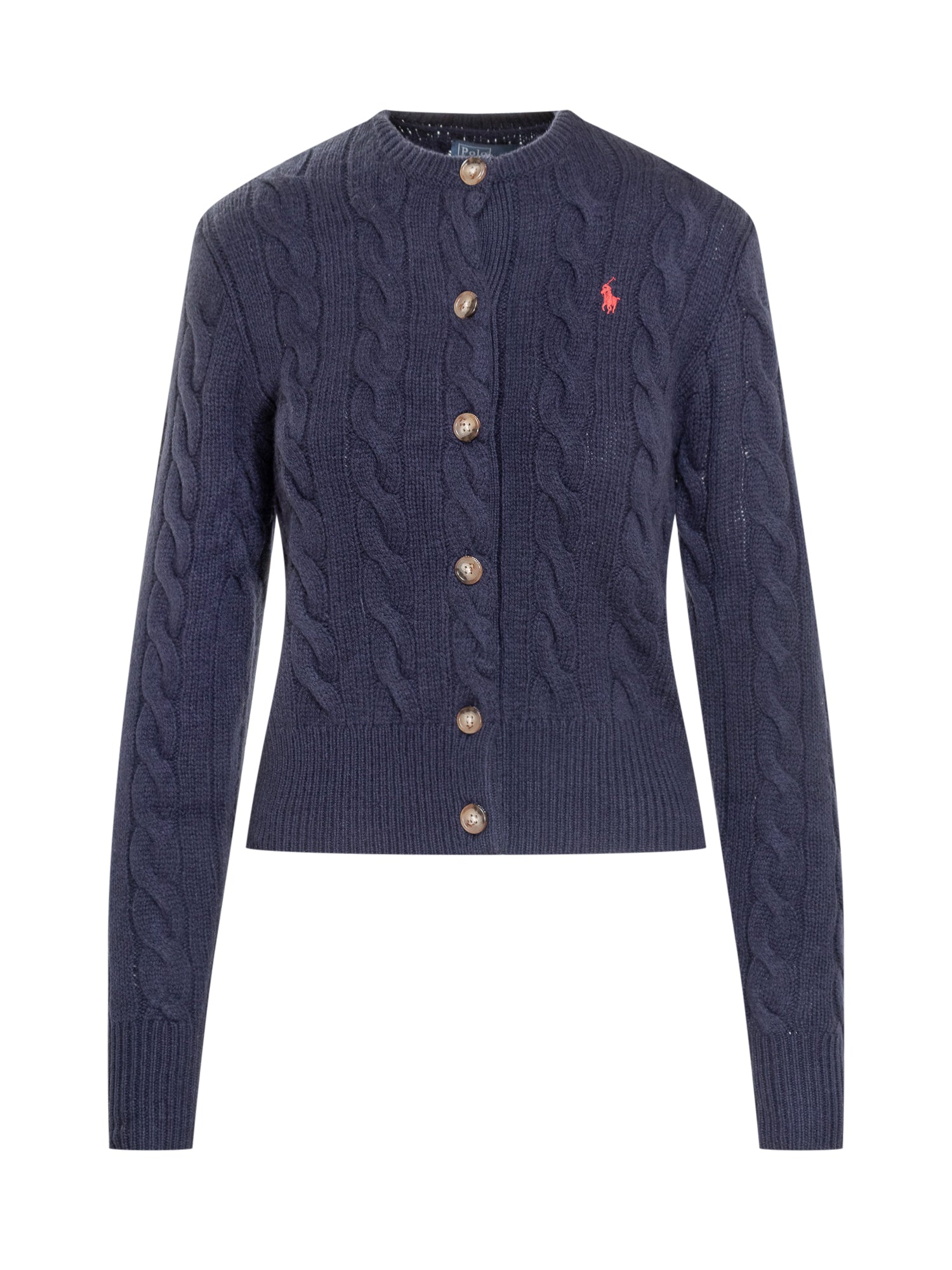 Navy blue cotton cardigan by Polo Ralph Lauren. Features cable-knit design, button closure and signature embroidered logo on the chest.
