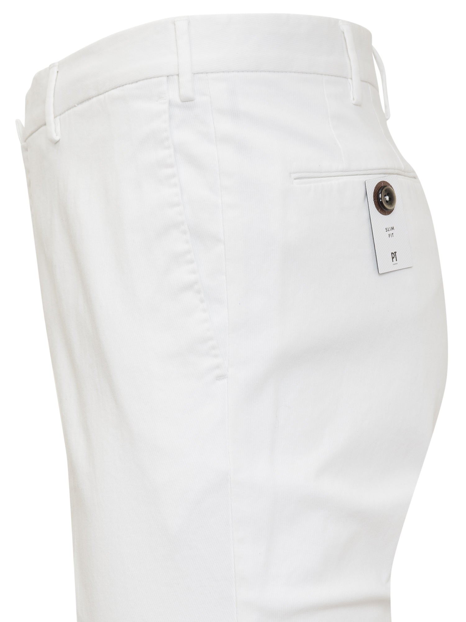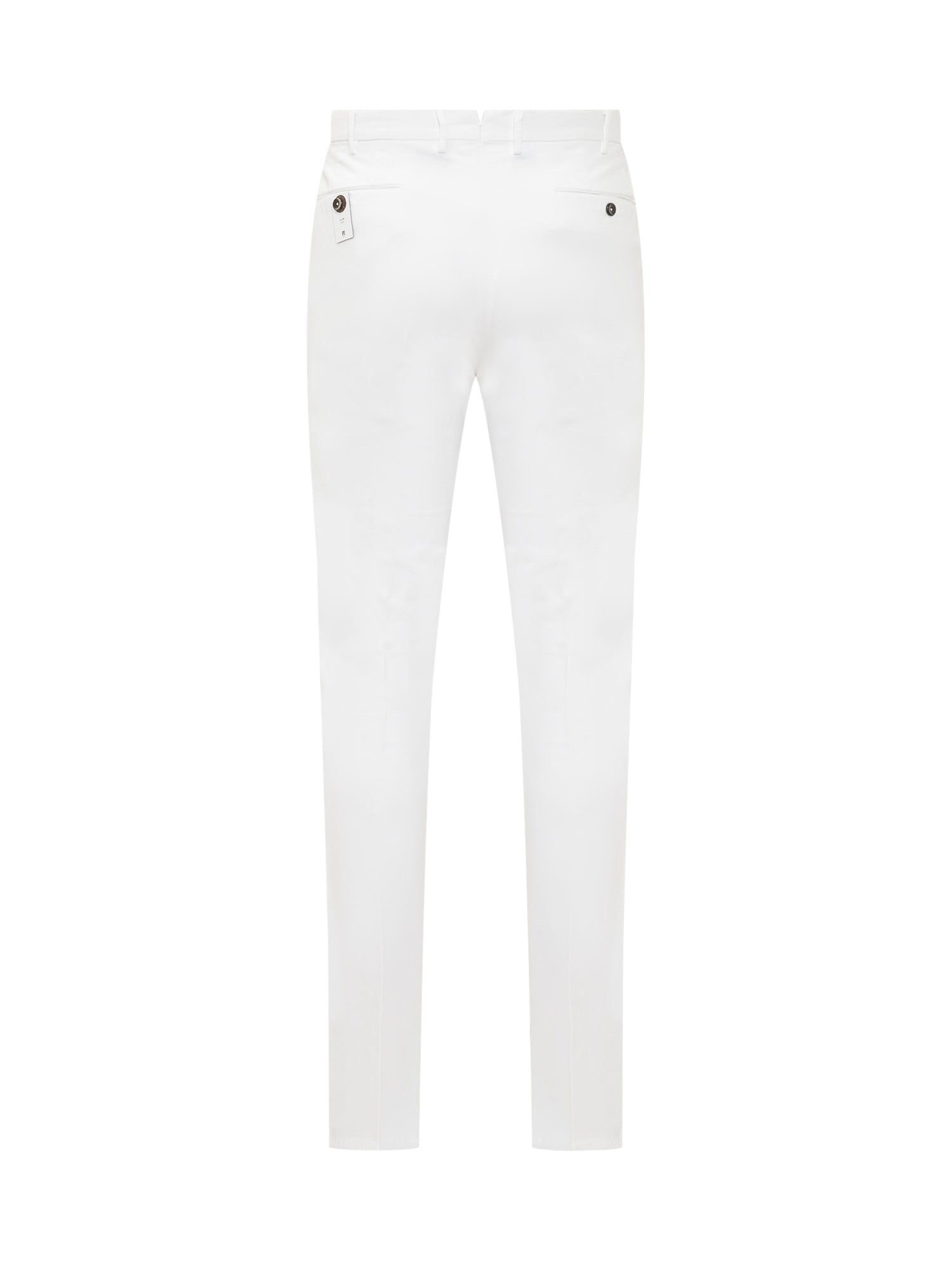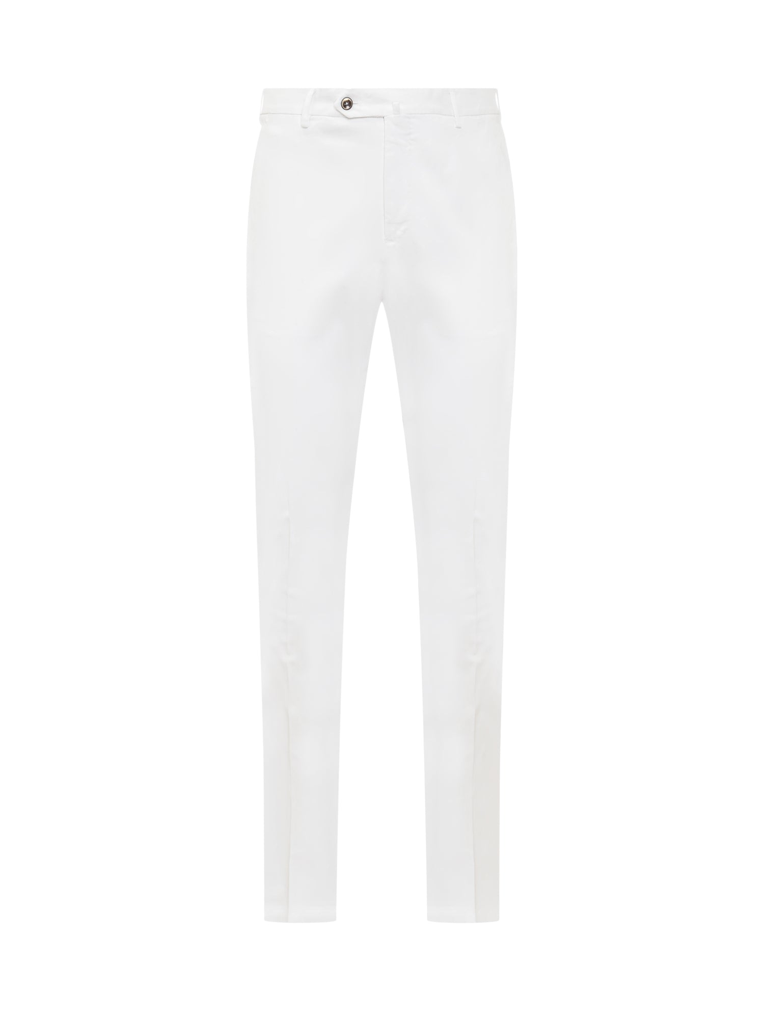 Long trousers. Slim fit. Zip and button closure. Three welt pockets. Two pockets with button. Belt loops.