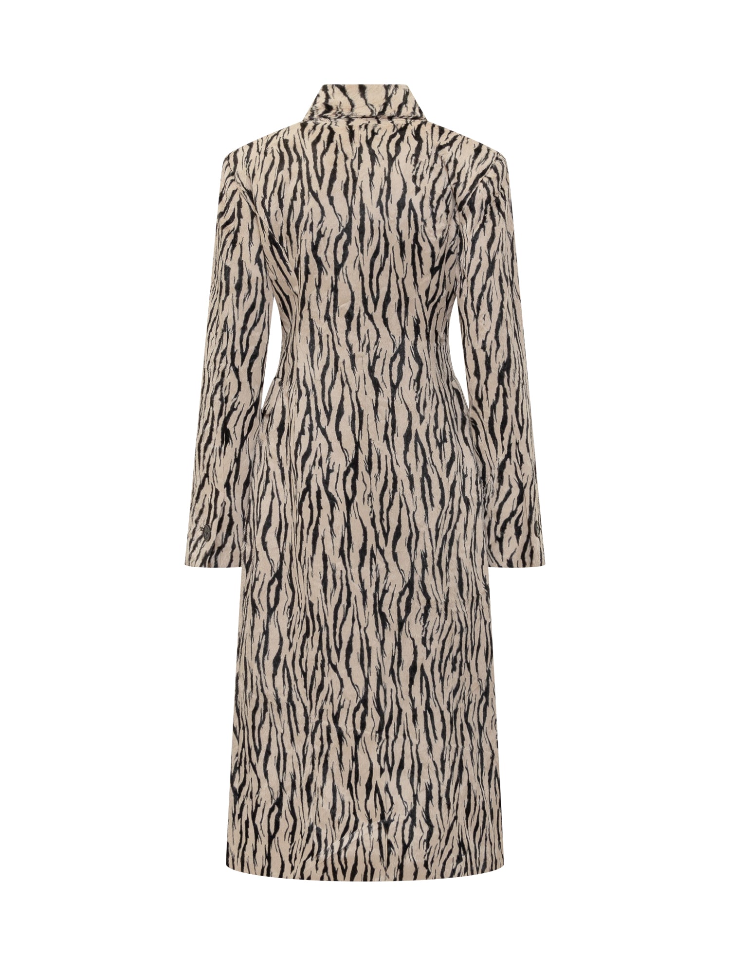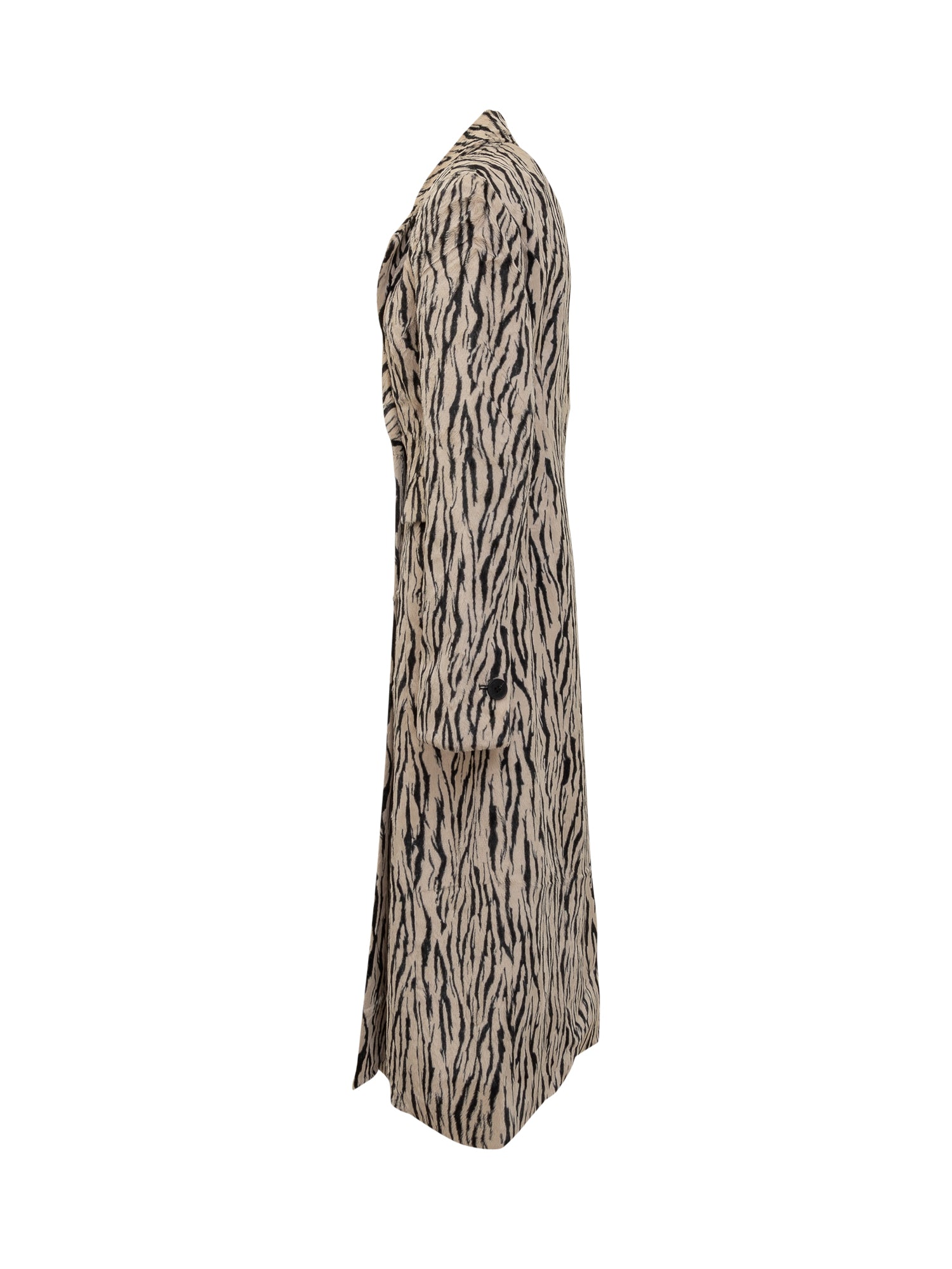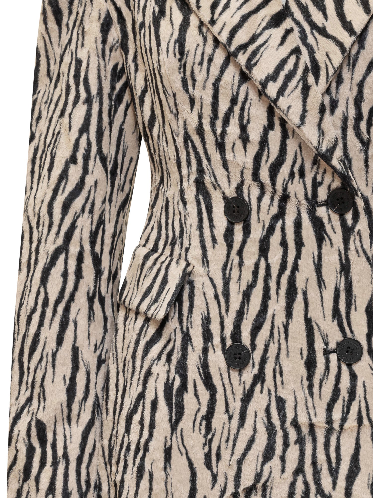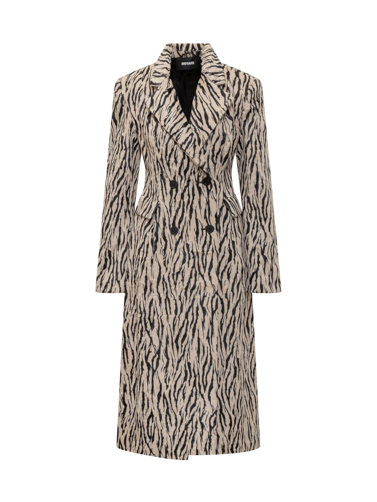 Long ROTATE coat in faux fur-effect fabric with beige and black zebra print. Double-breasted with a tailored cut.
