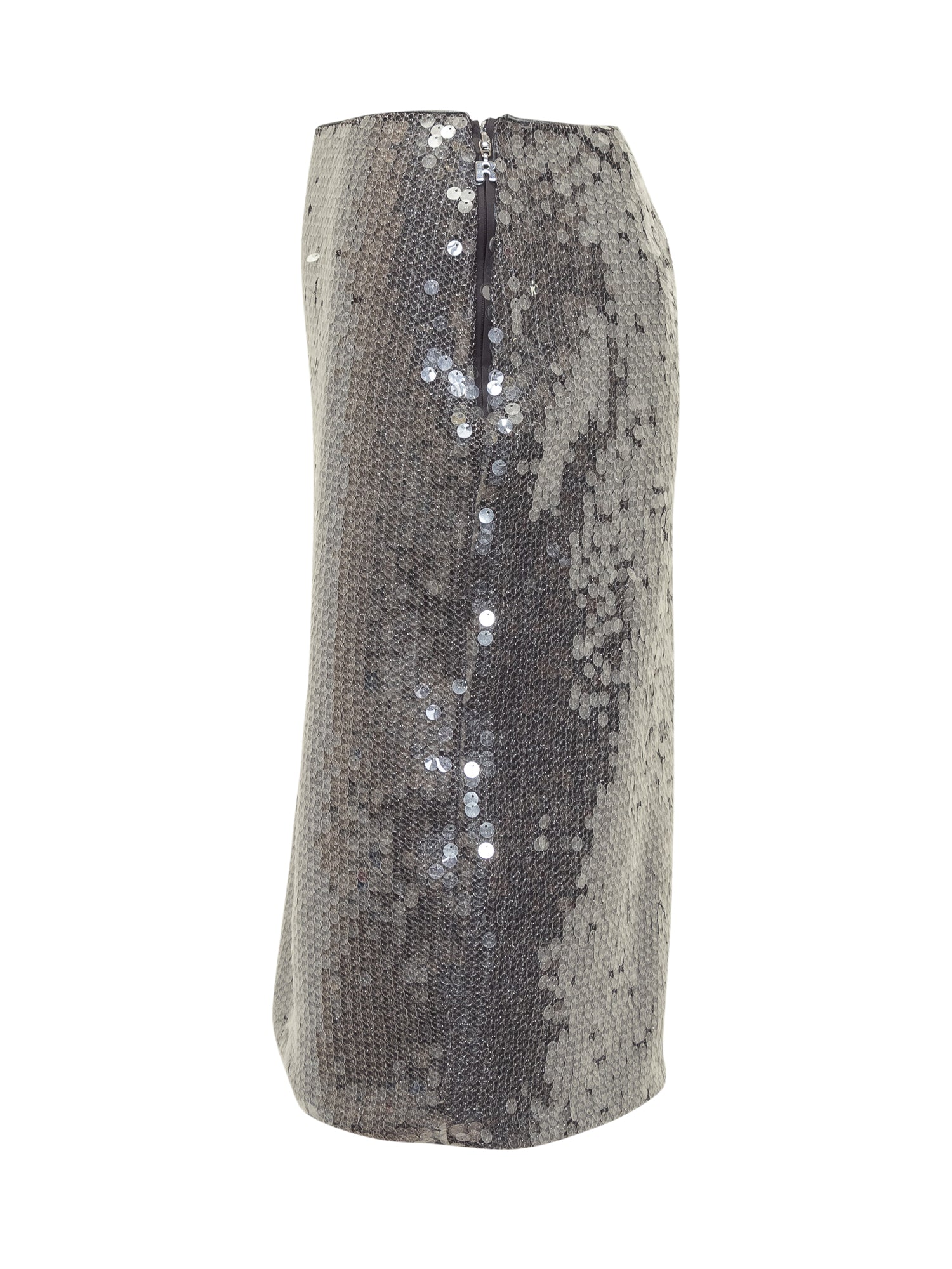 Rotate silver sequin midi skirt with slim fit and back closure.