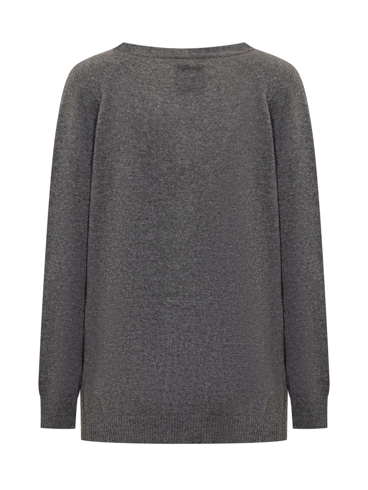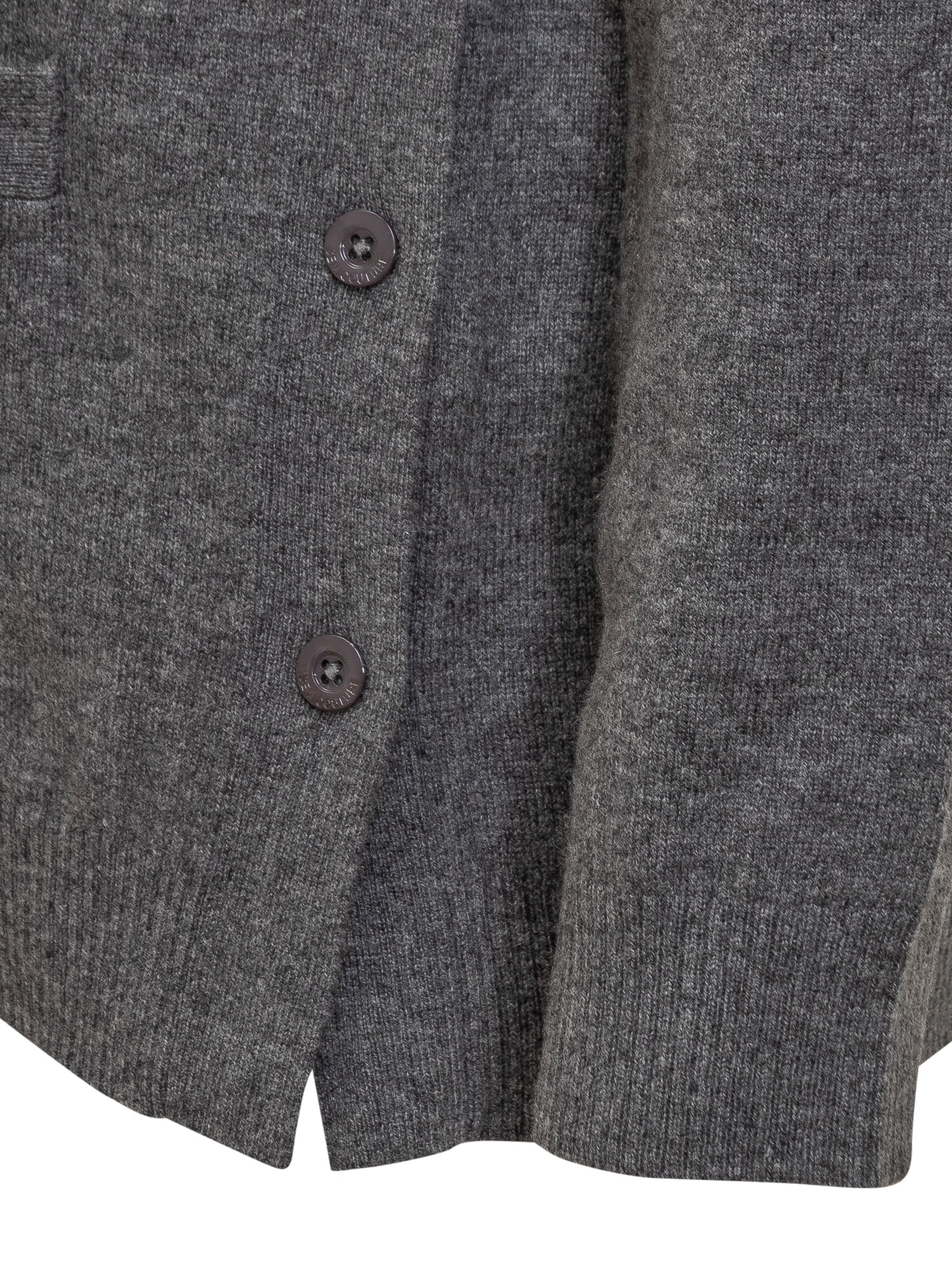 Long-sleeved cardigan in cashmere blend wool. V neck. Ribbed hem. Button fastening. Front pockets. Side slits with buttons.