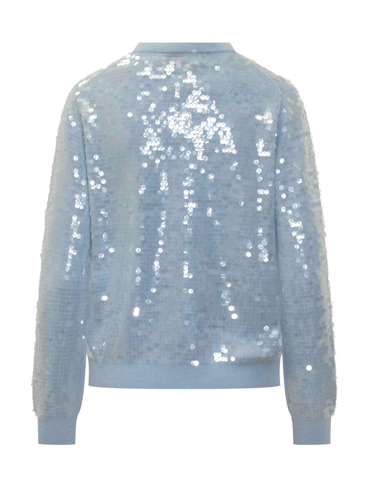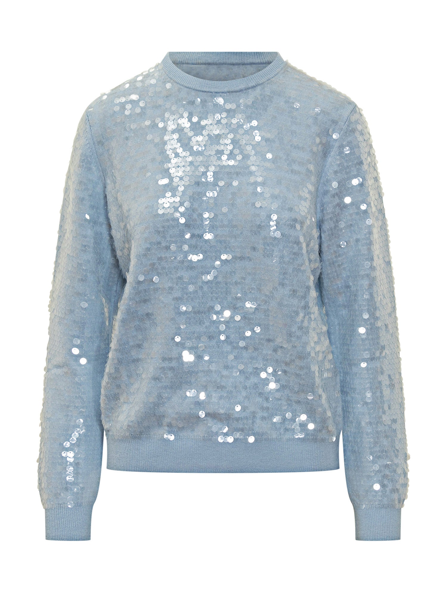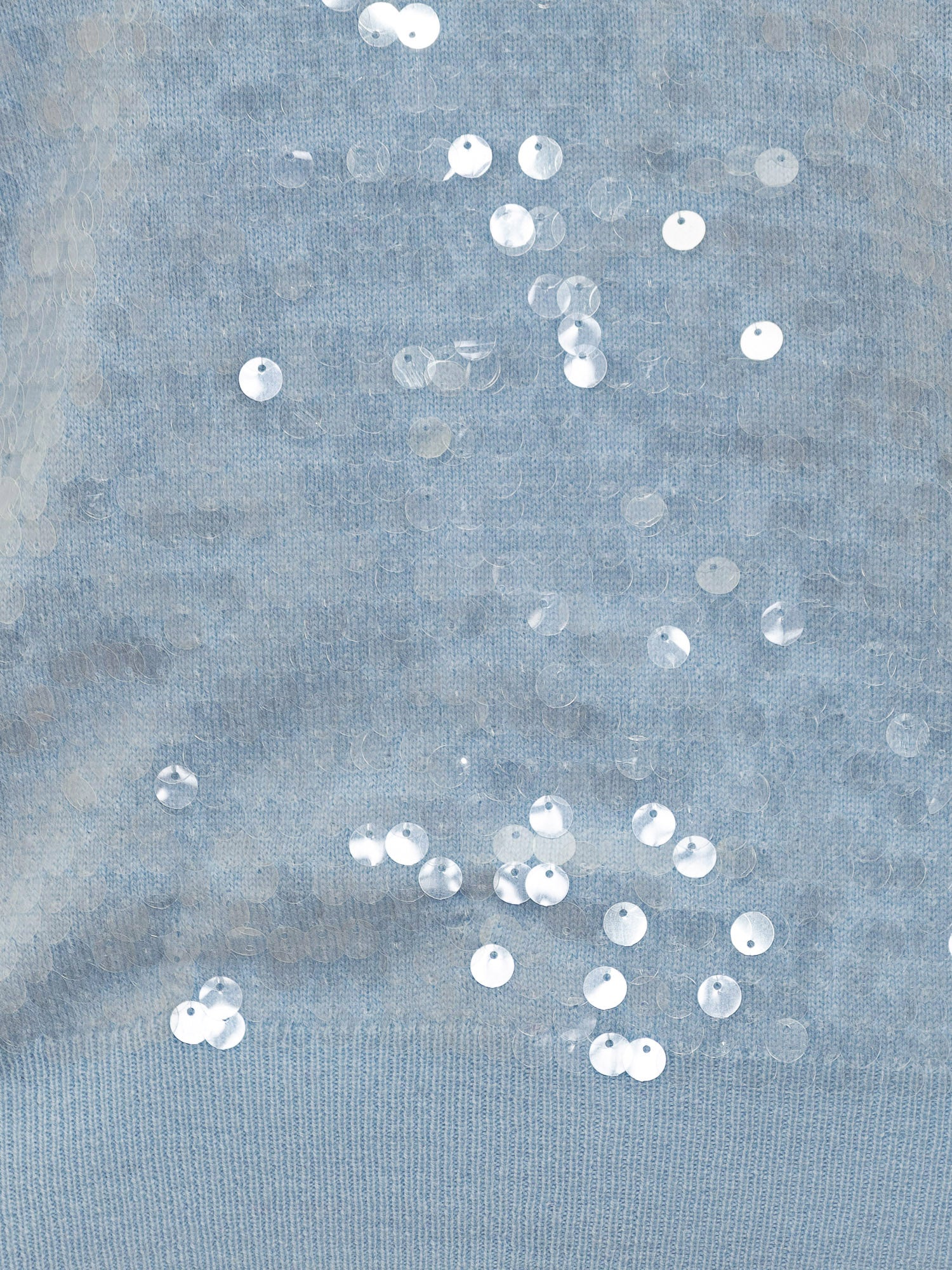 Light blue women's sweater with all-over sequins, crew neck and long sleeves. A sparkling and stylish piece for casual-chic outfits or evening looks.