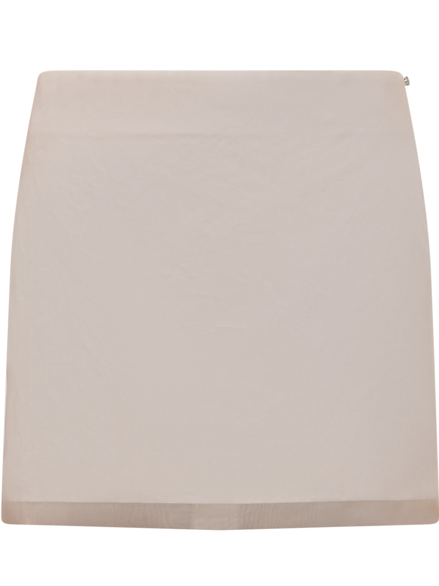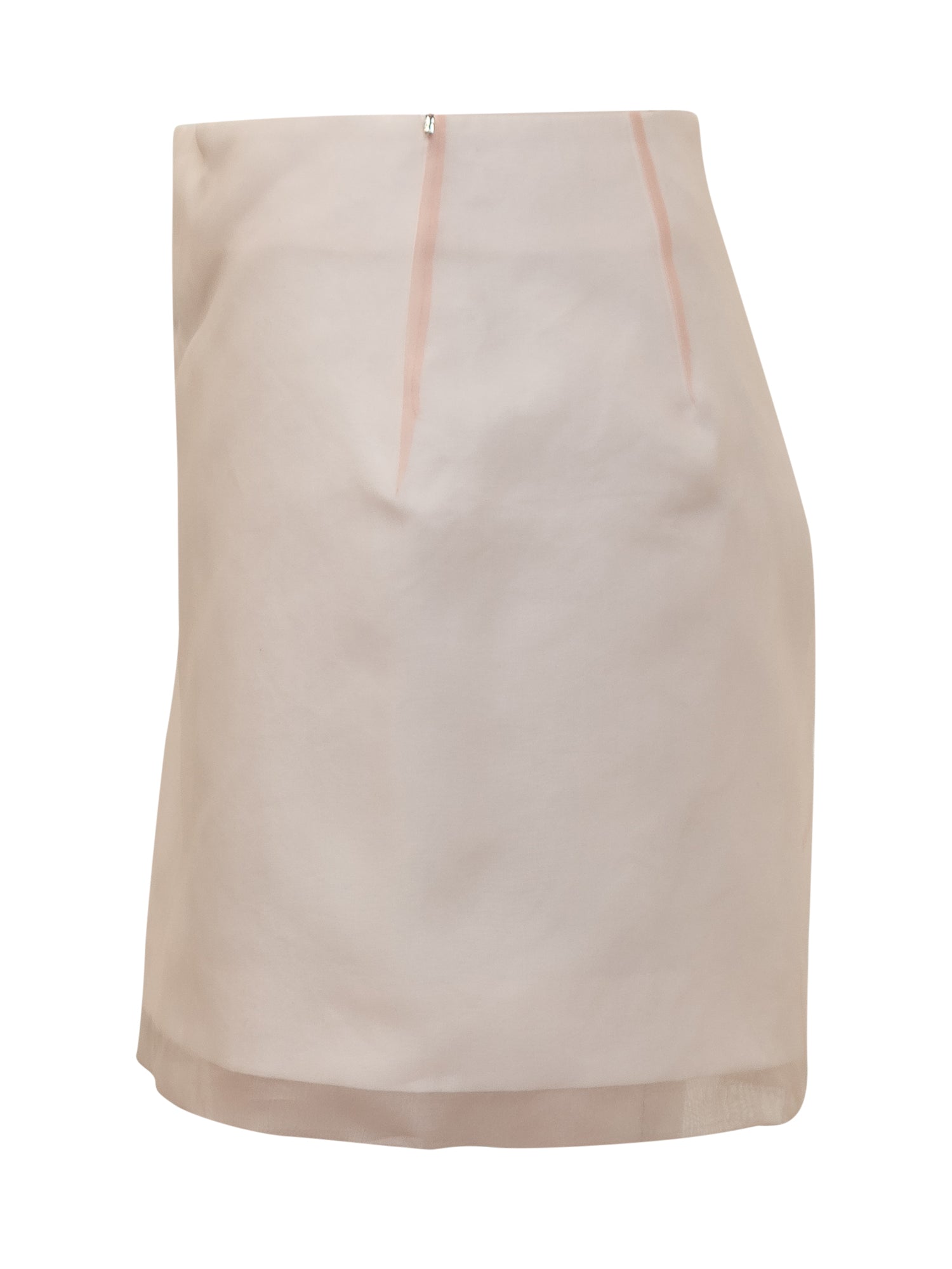 Mini skirt from the straight line. Closure with invisible zip on the back. Double layer construction. The outer part in semi transparent fabric is longer and cums at the bottom. Small back darts.