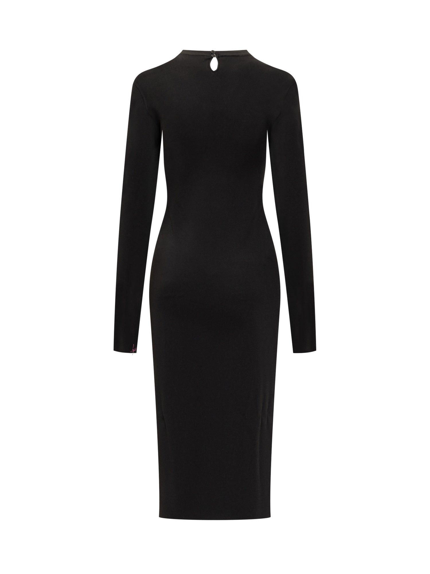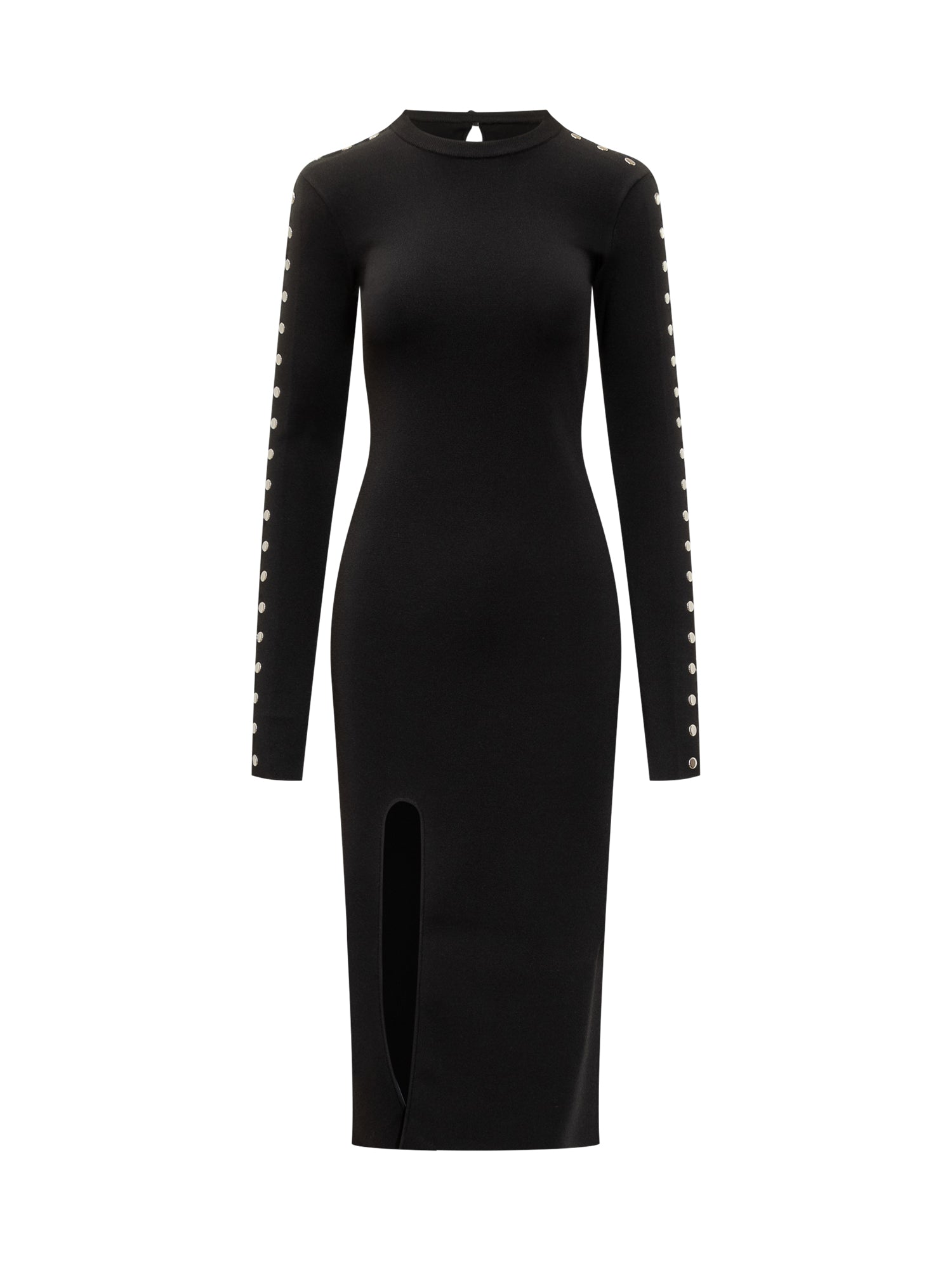 Long crewneck dress. Back button closure. Slit at front. Studs applied on the sleeves.