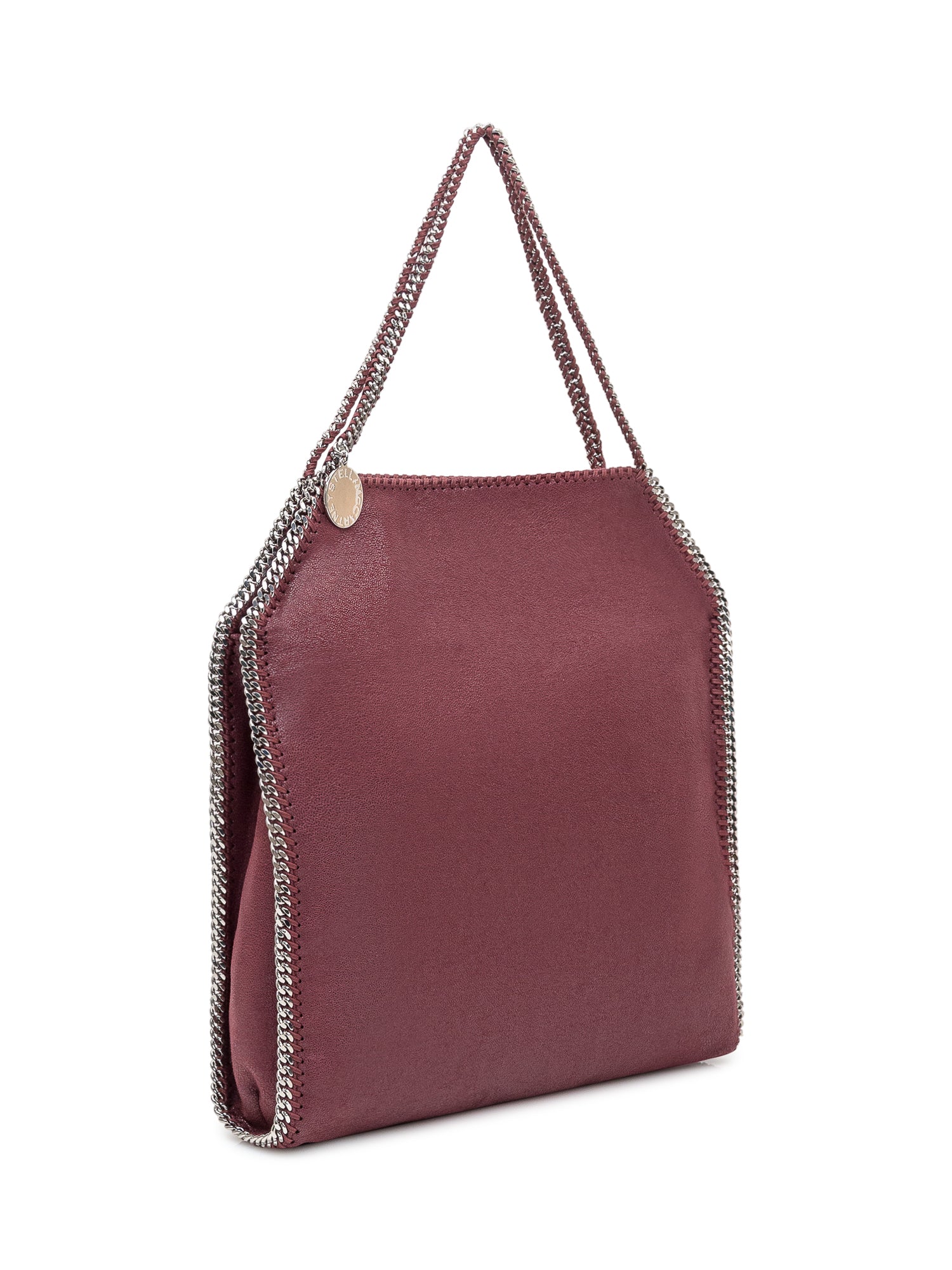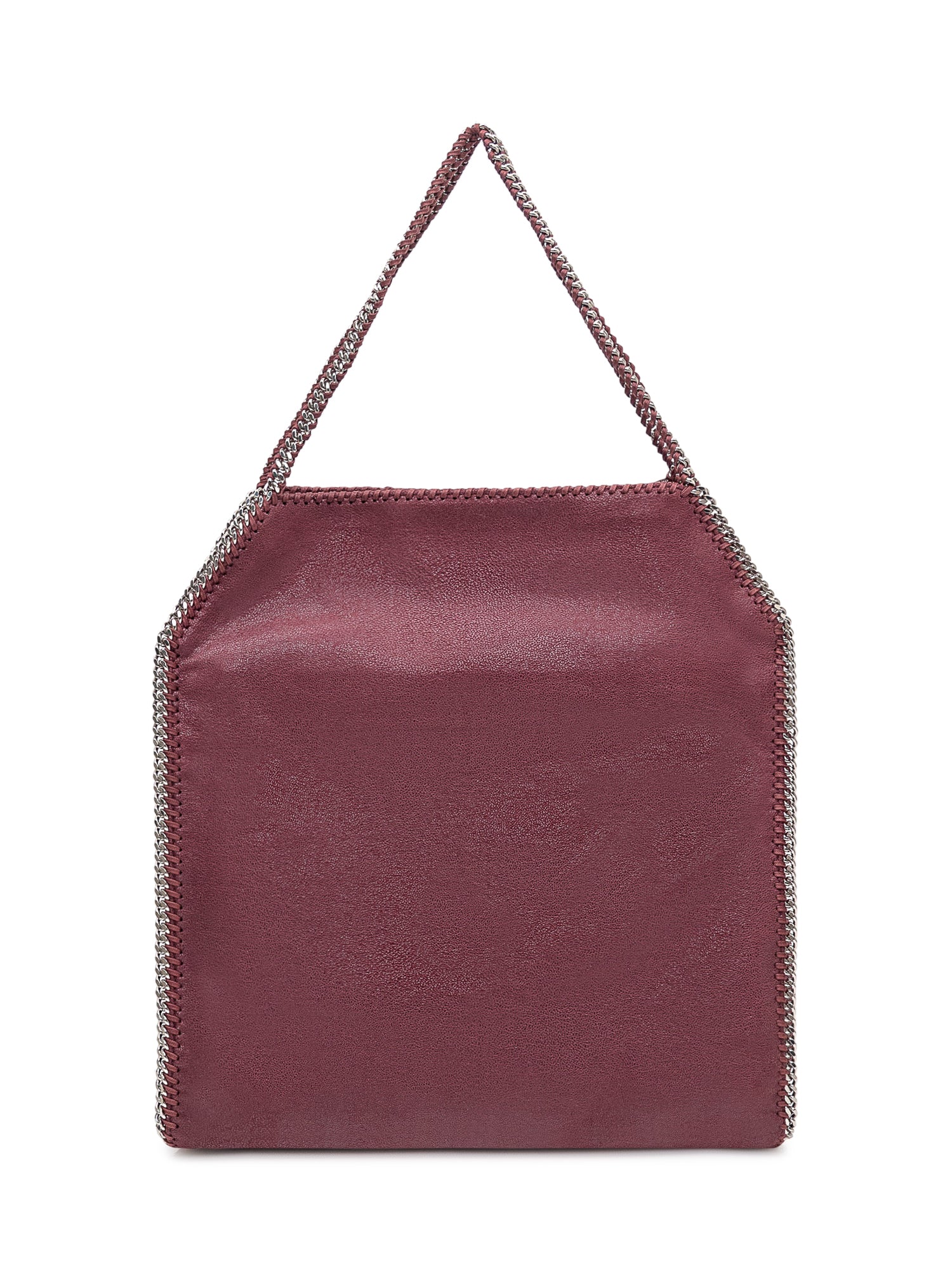 Tote bag in shaggy deer color plum. Circular locket with logo lettering. Flat inside pocket with zip. Closure with magnetic button. Two upper chain handles.