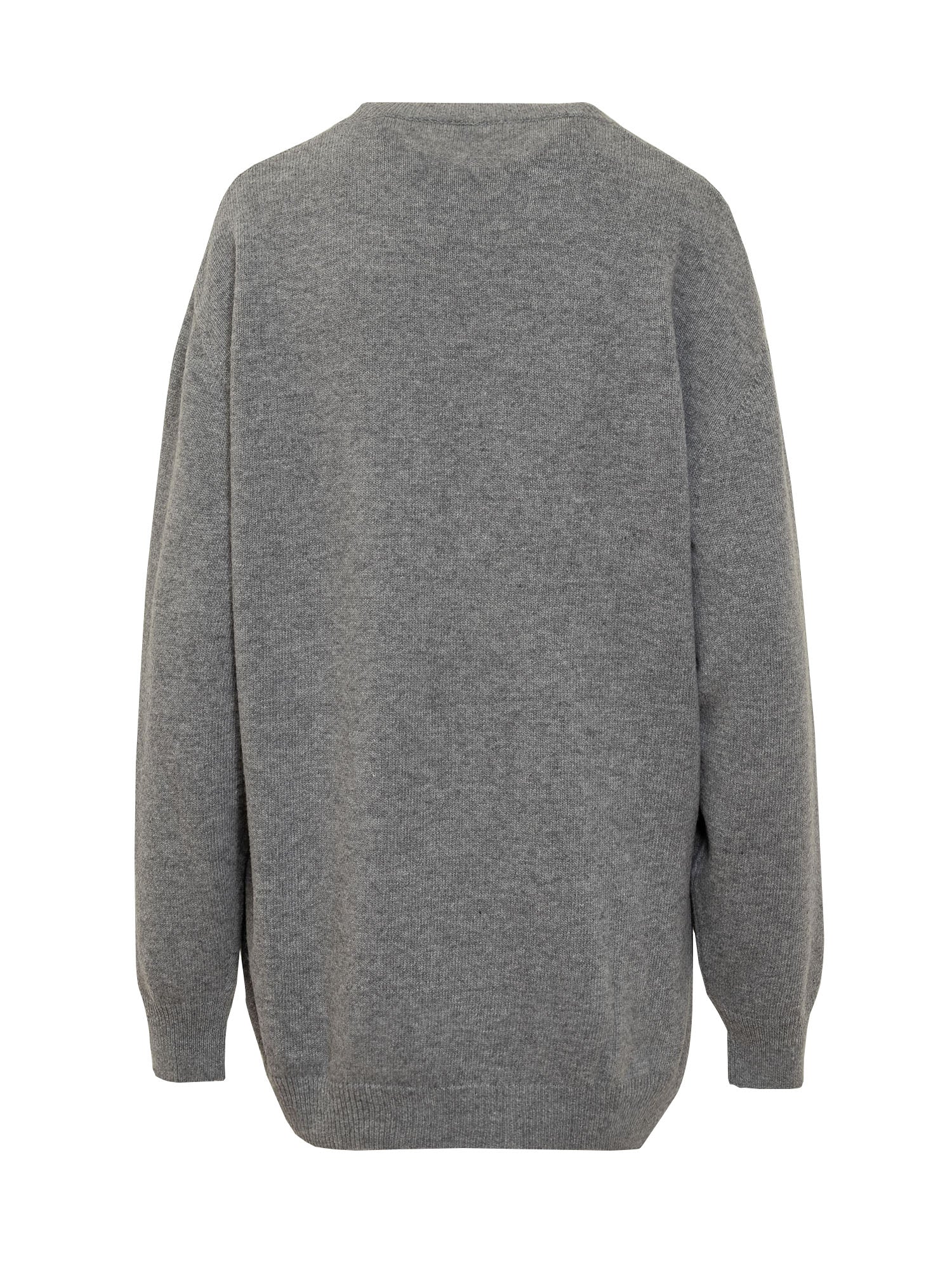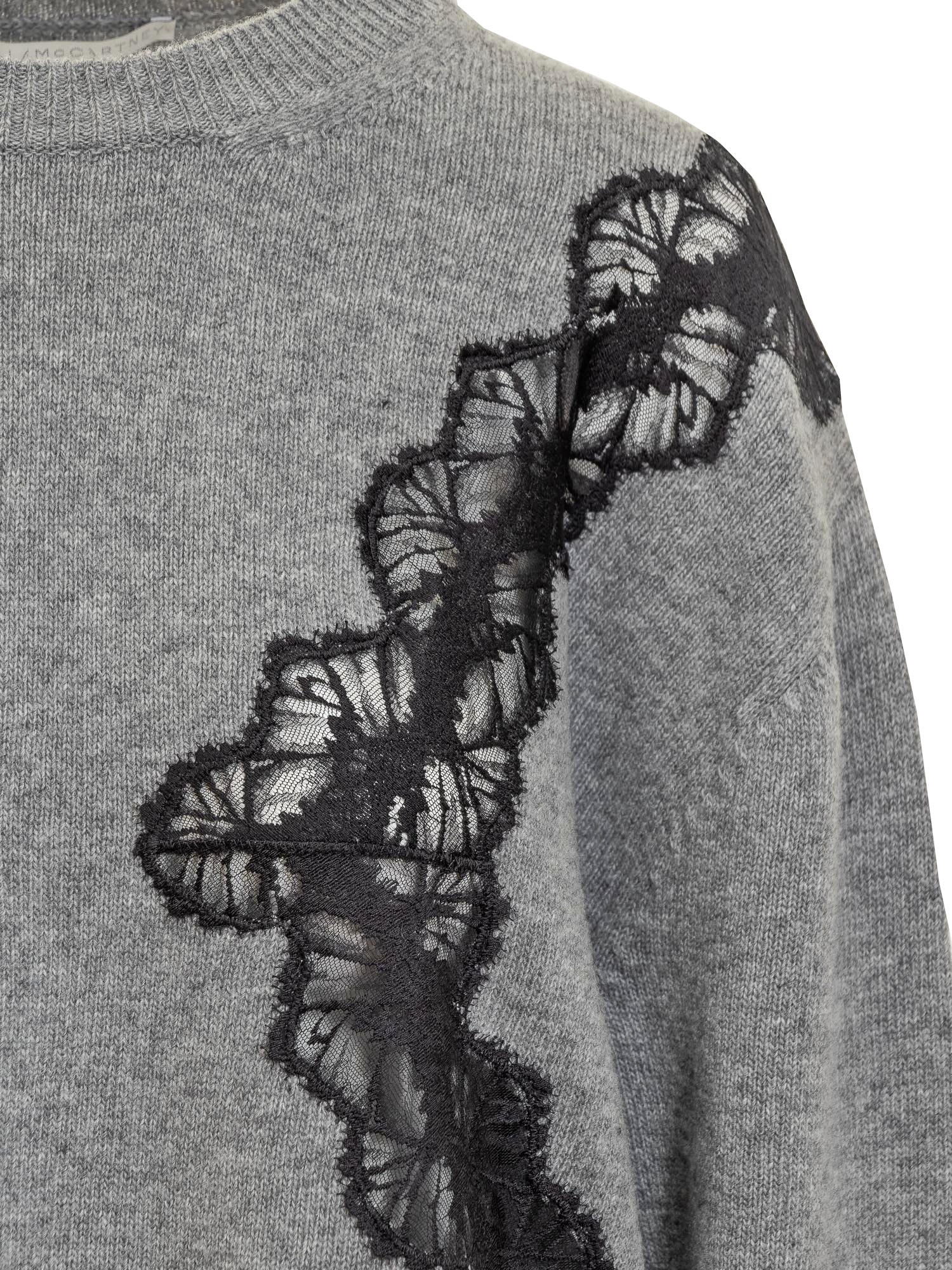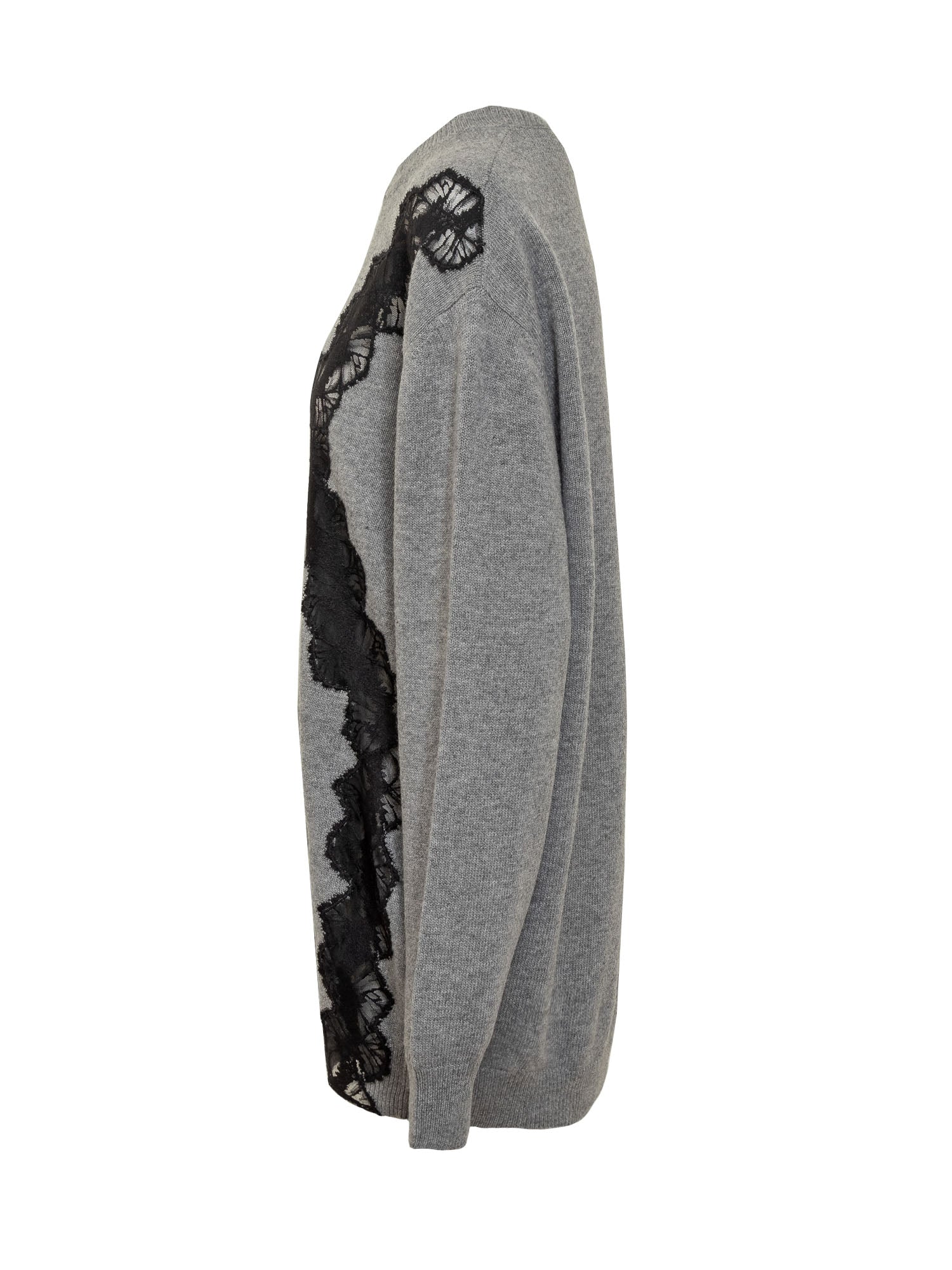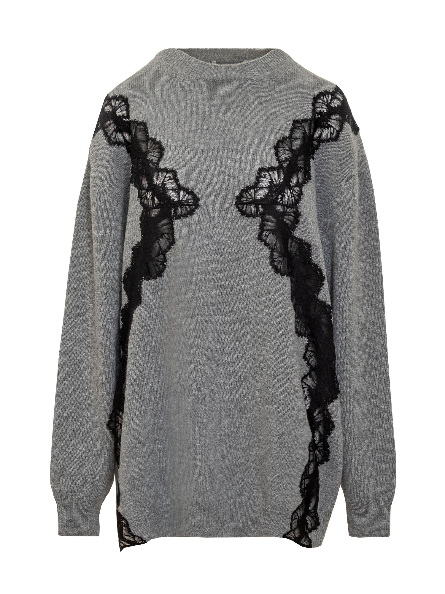 Long-sleeved sweater made of wool. Crew neck. Ribbed hems. Embroidered inserts with cut-outs and transparencies. Oversized fit.