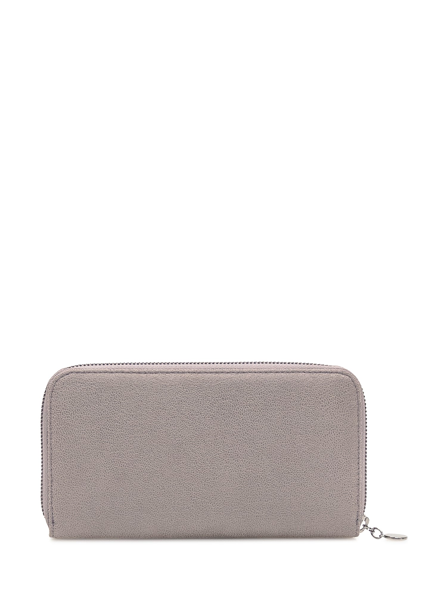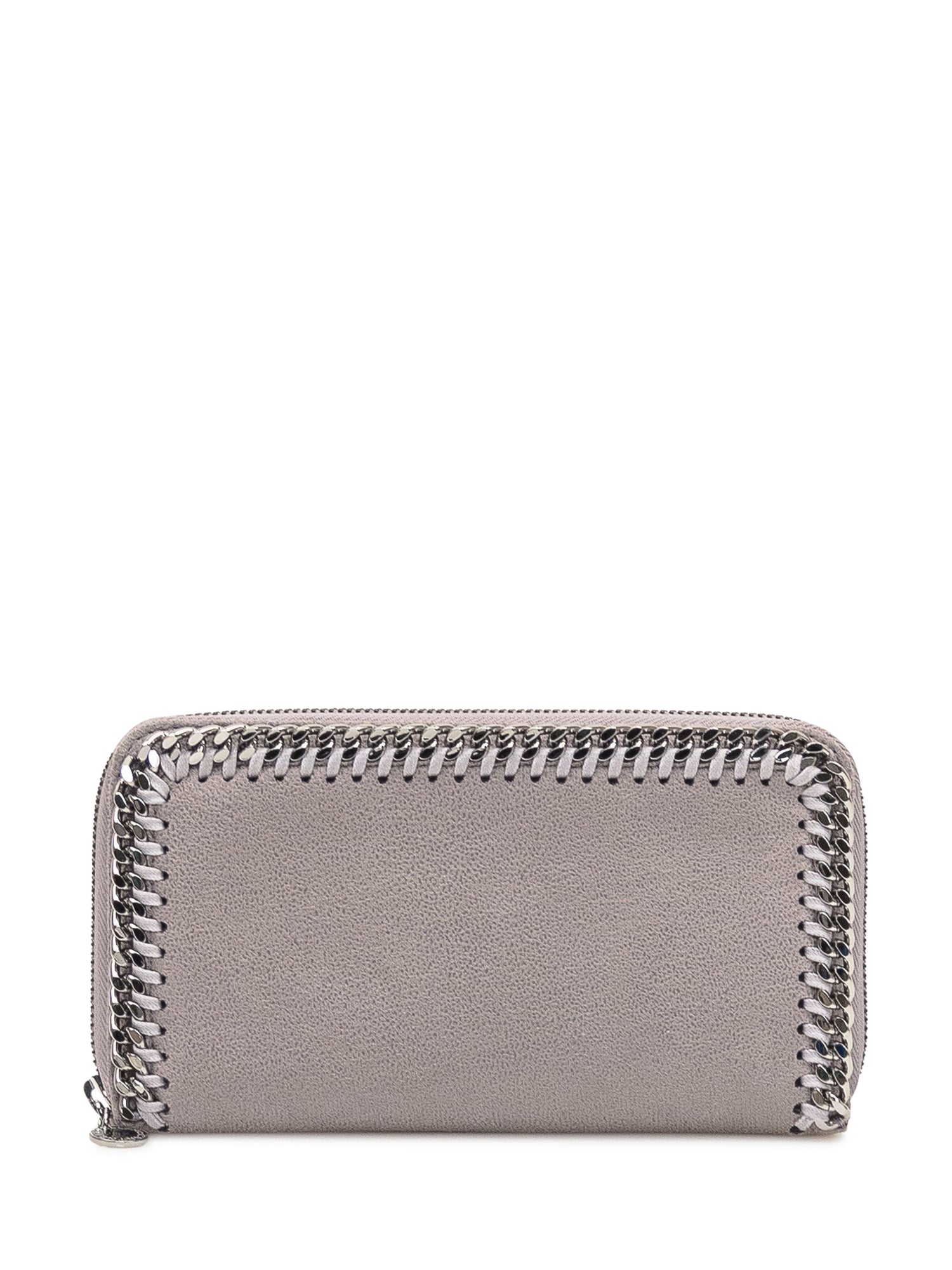 Stella McCartney Falabella zip-around wallet in light grey vegan leather-effect material, featuring signature chain trim along the edges. Full zip closure and engraved logo medallion.