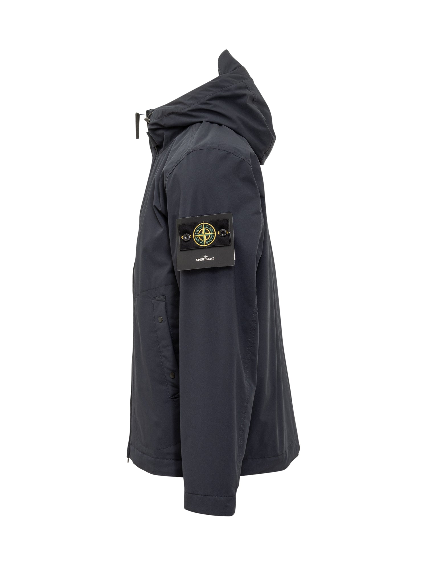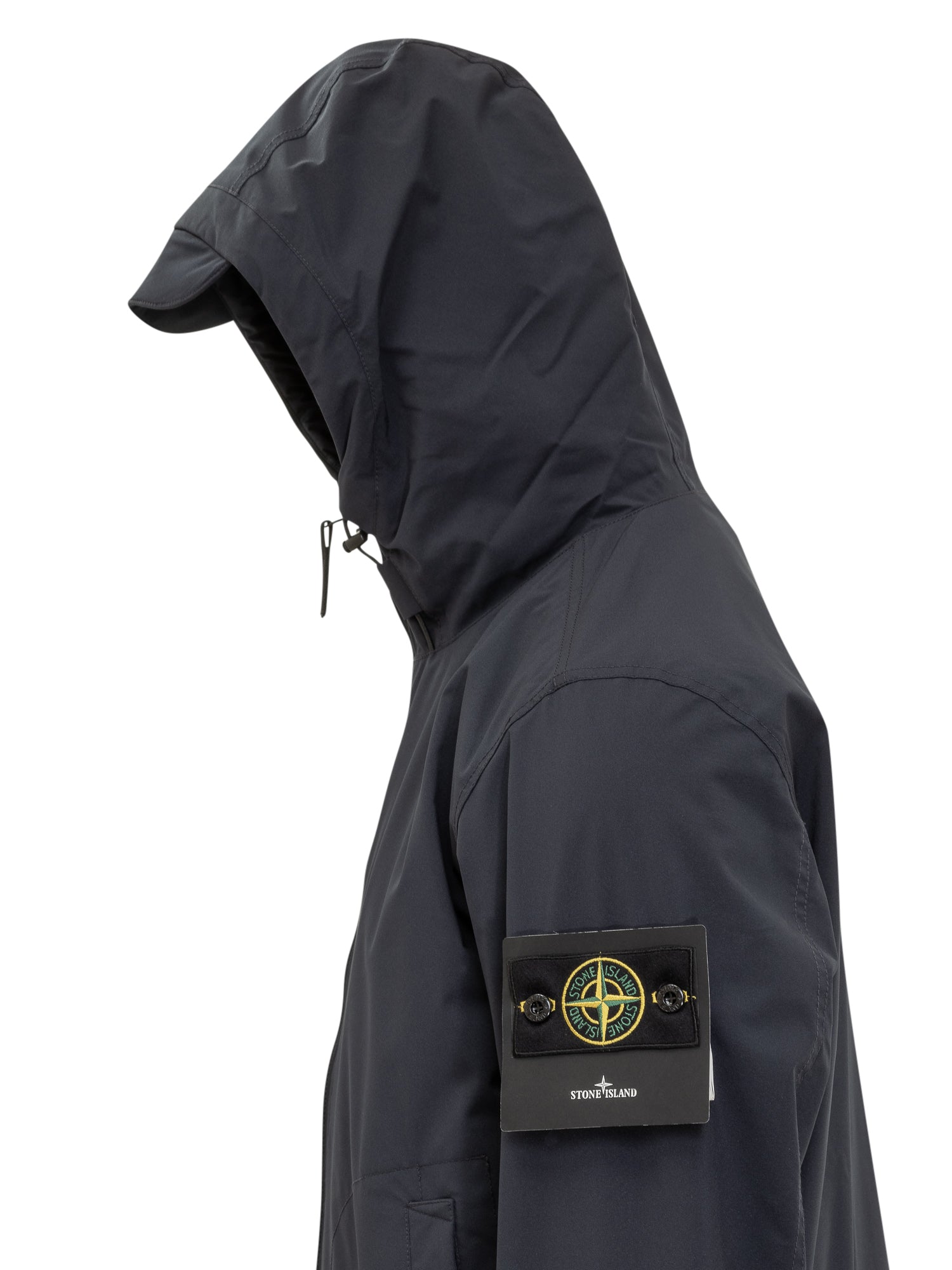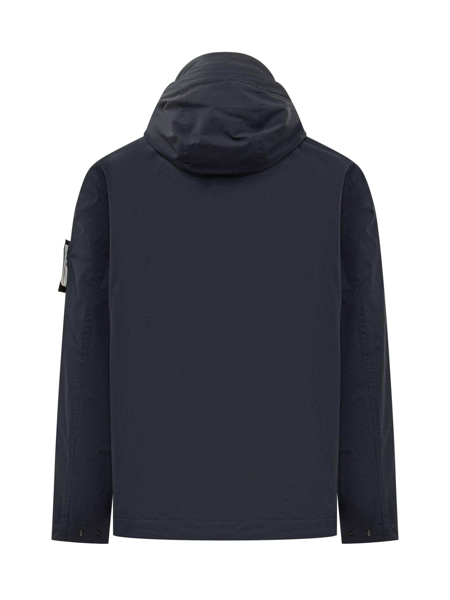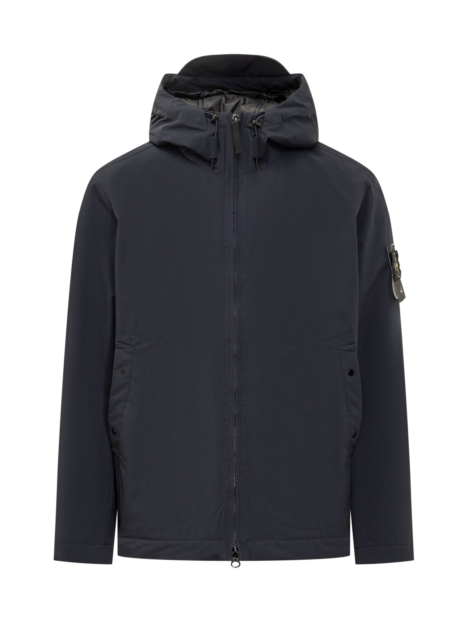 Stone Island short parka in navy stretch technical fabric. Features adjustable hood, two-way zip closure, side pockets and the iconic sleeve badge.