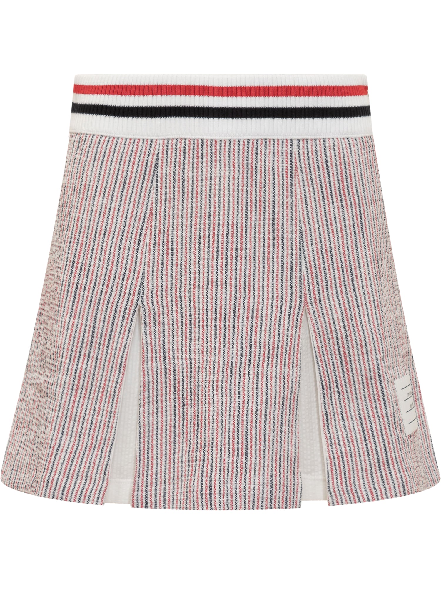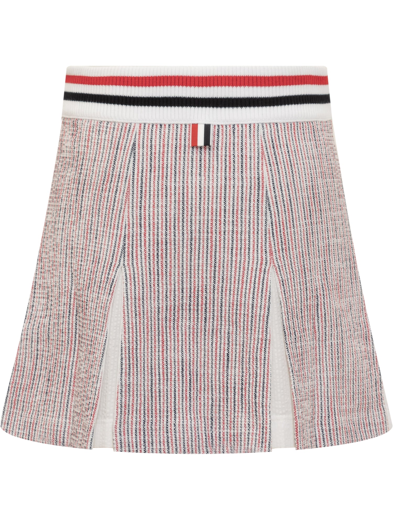 Cotton tweed seersucker mini skirt. Invisible zipper at hip. RWB tricolor rib waistband. Pleats at bottom. All-over striped pattern. Logo patch at bottom. Tri-color grosgrain tab at back. Flared silhoutte.