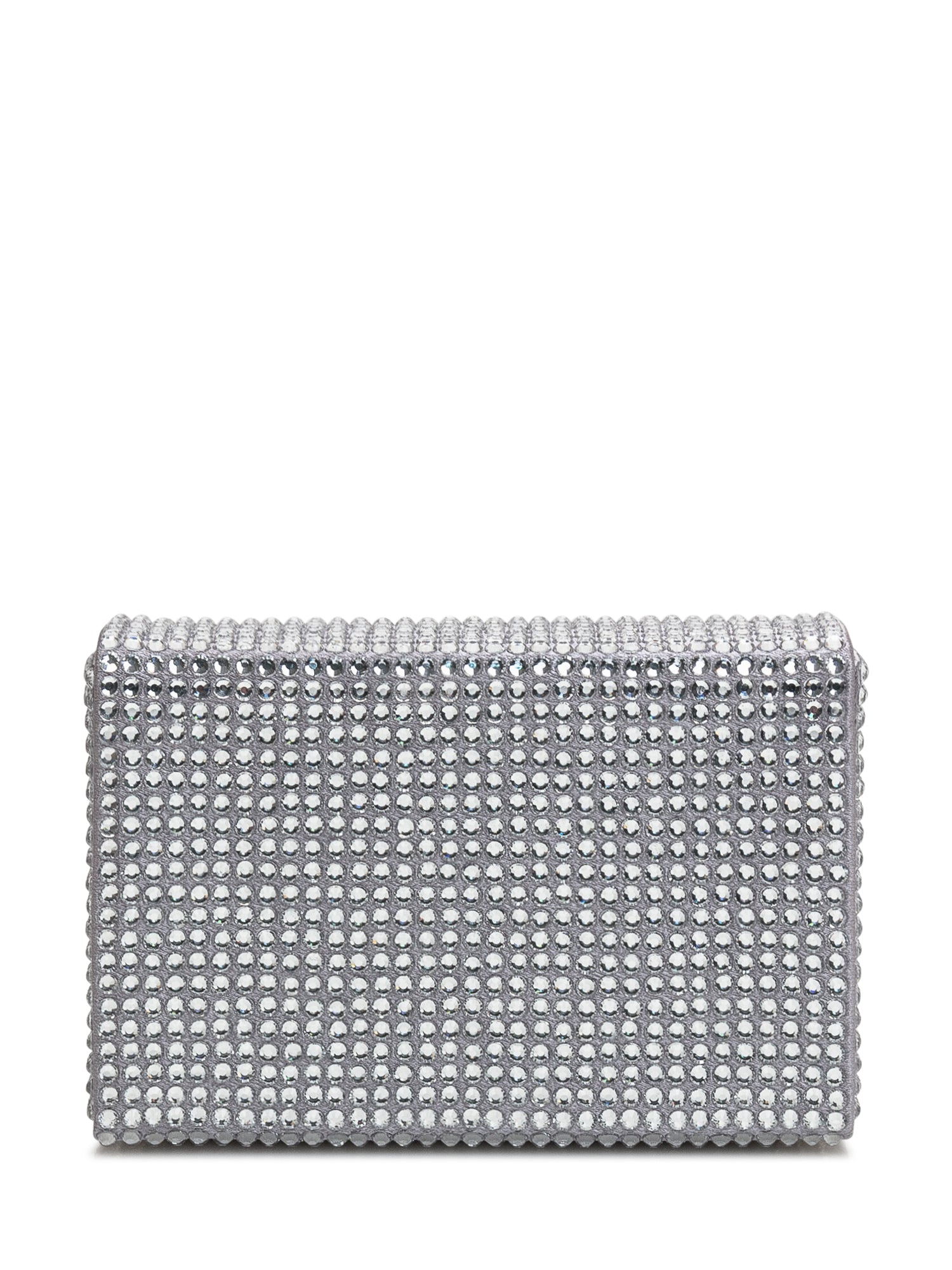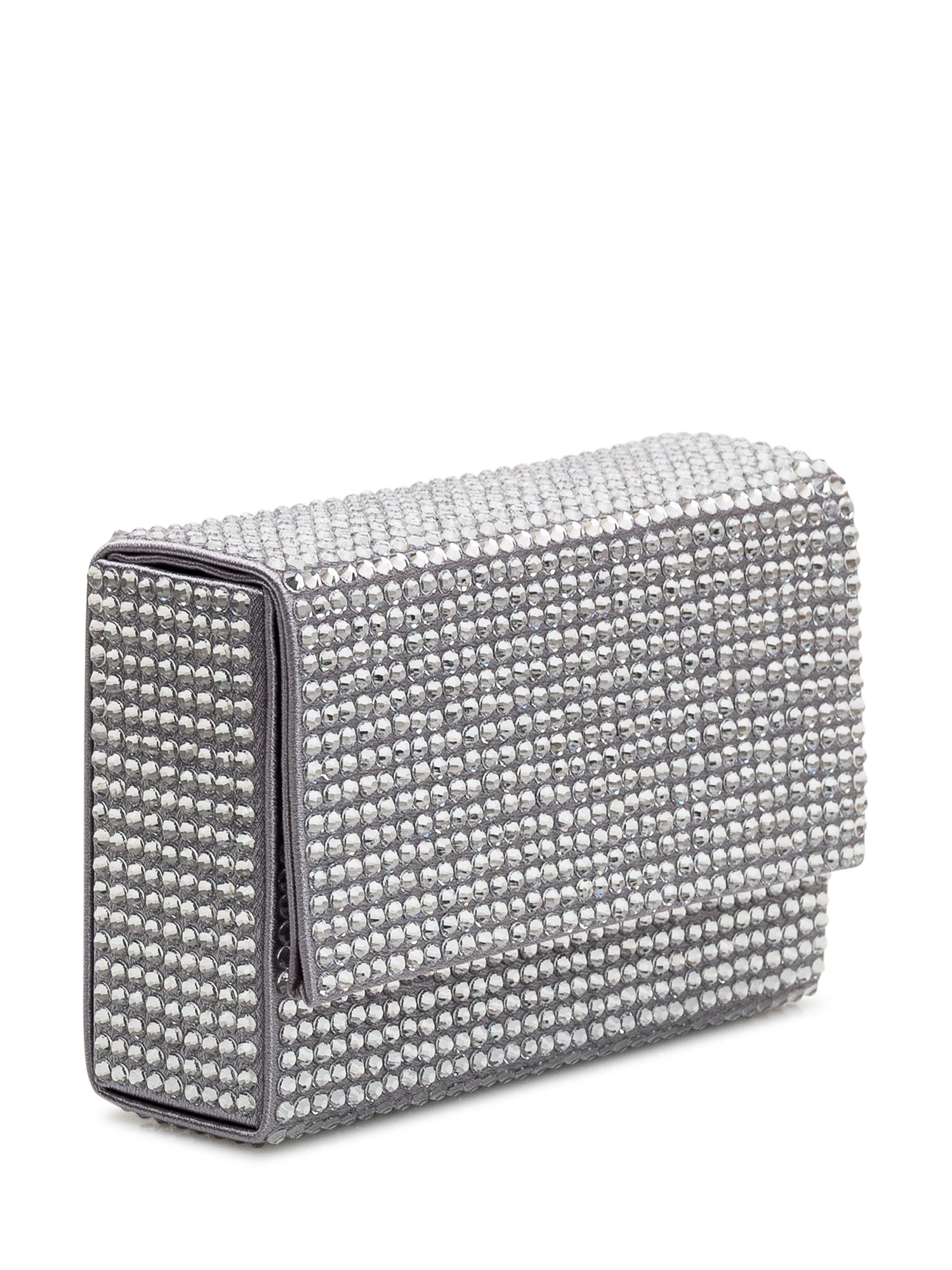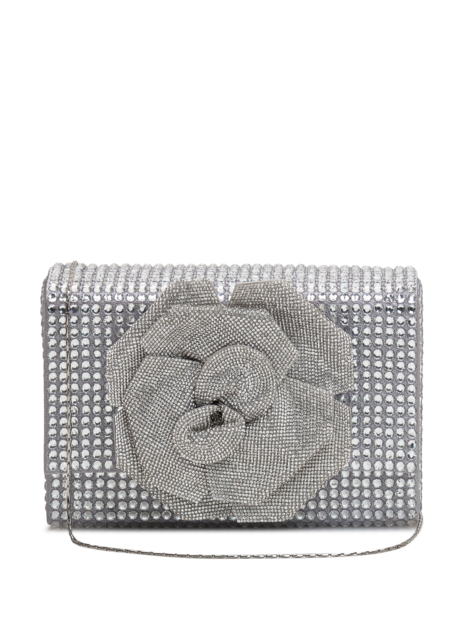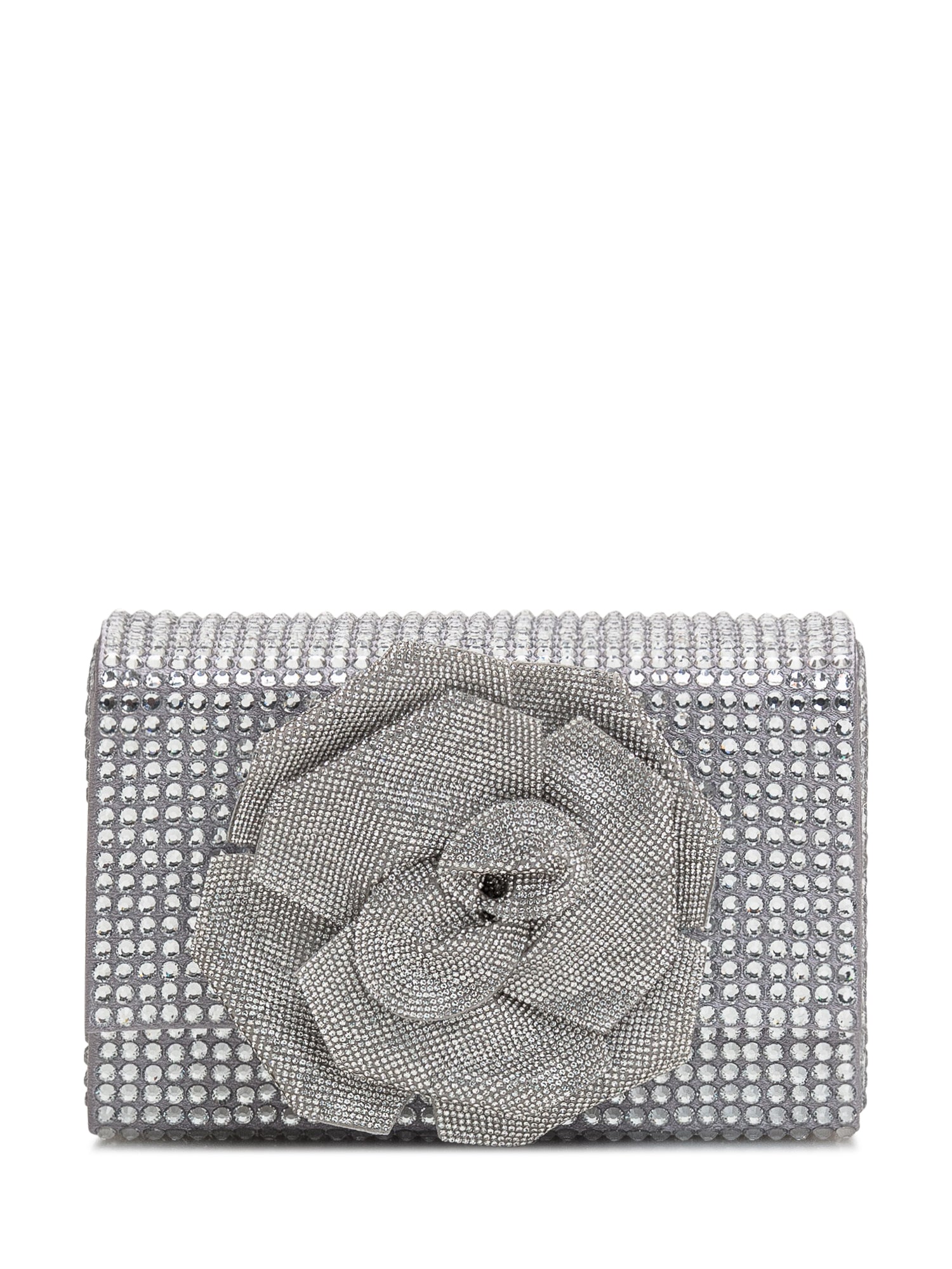 Silver clutch. Covered with crystals. Maxi flower jewel calamitato. Slender shoulder strap.