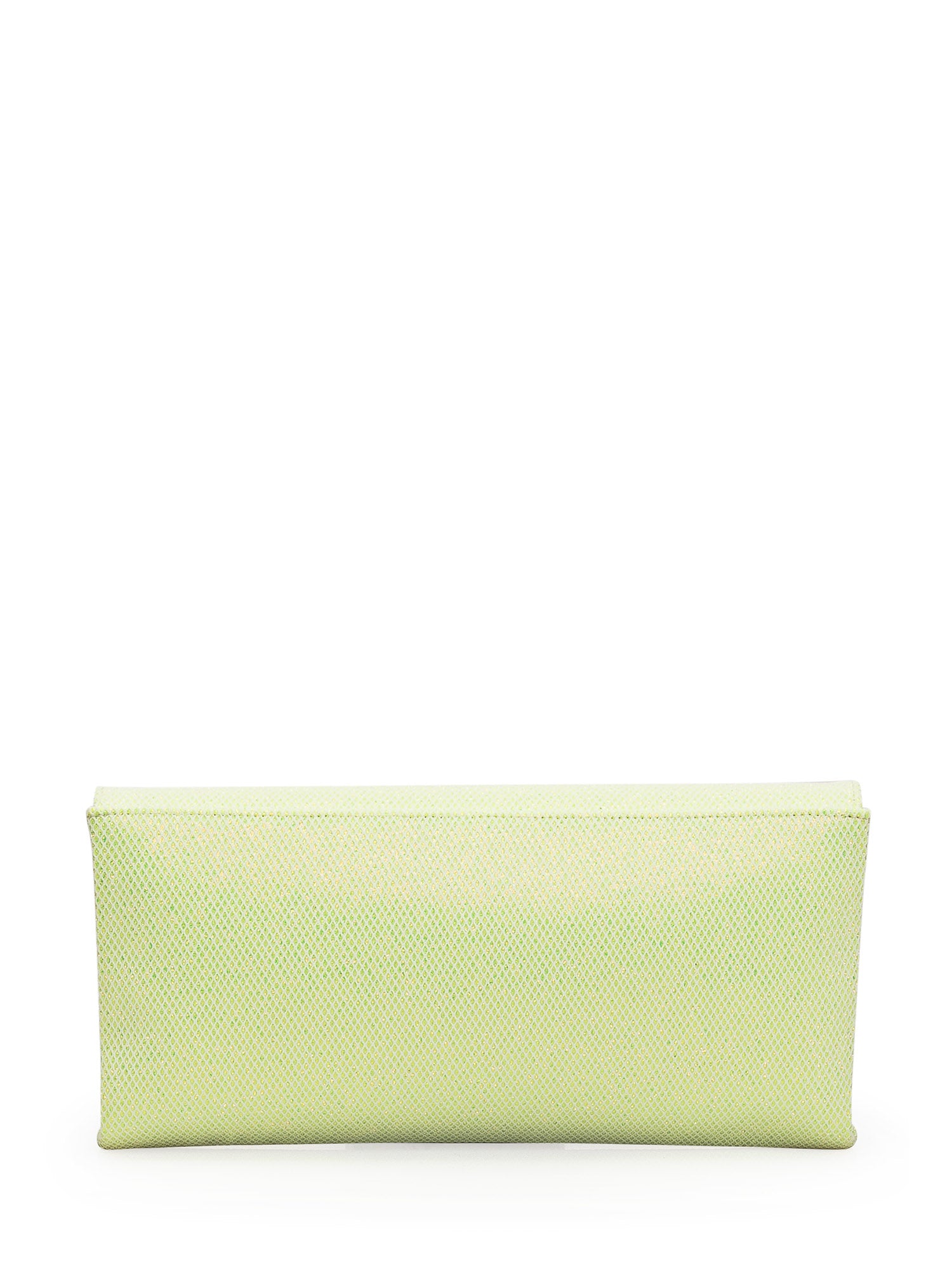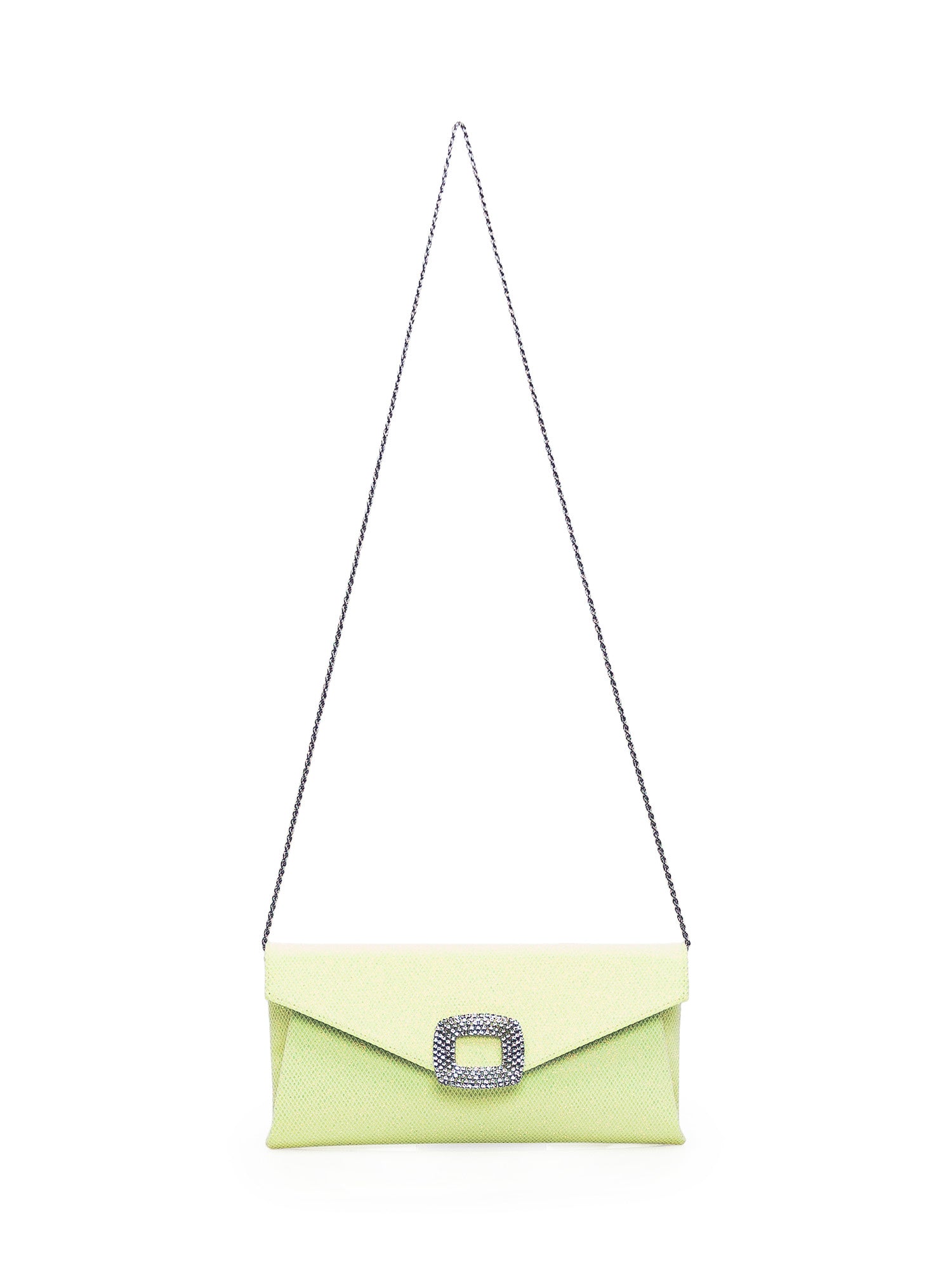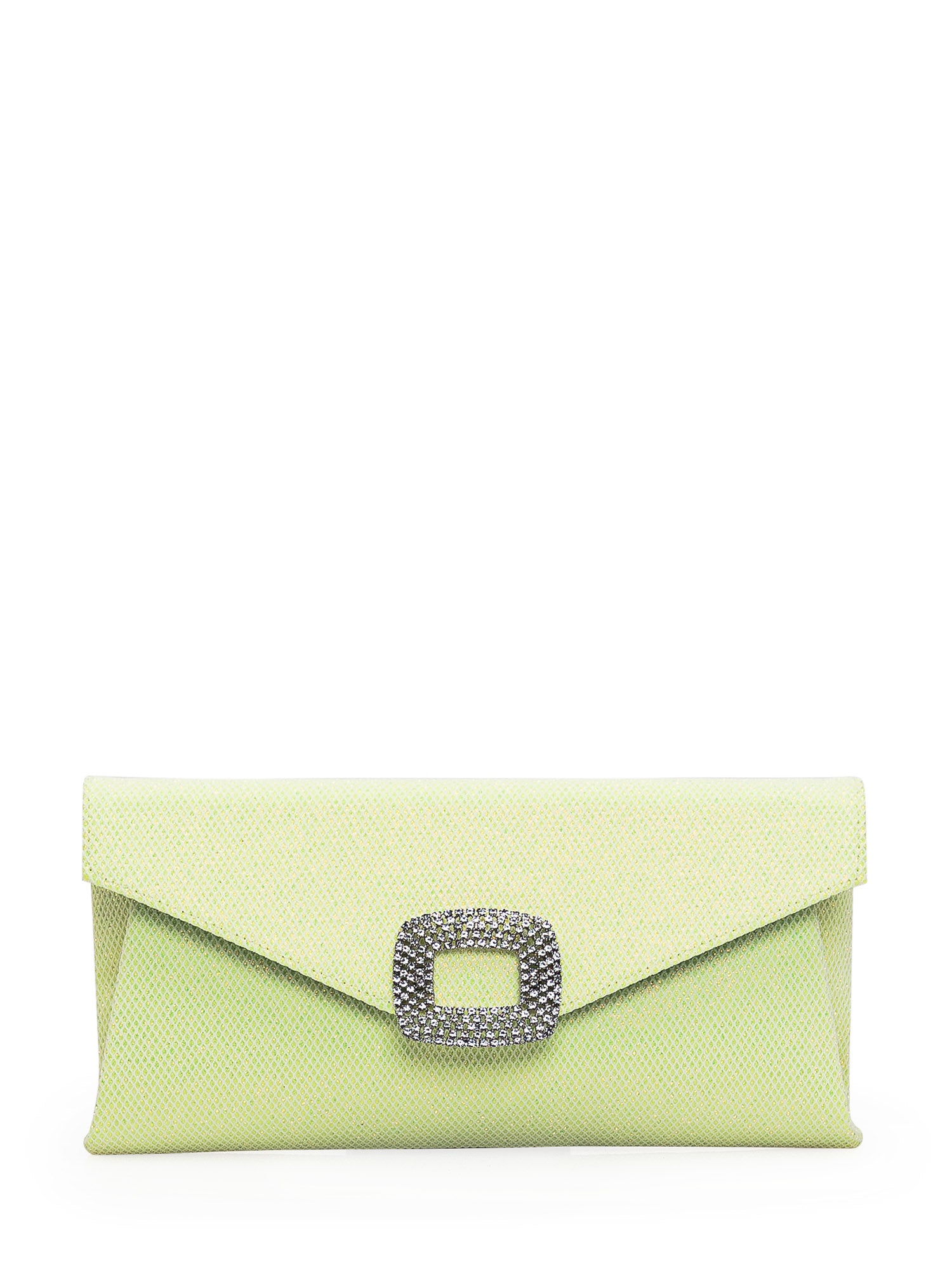 Green diamond fabric clutch bag. Chain shoulder strap. Two interior compartments. Flap closure with magnetic button. Jeweled buckle at front.