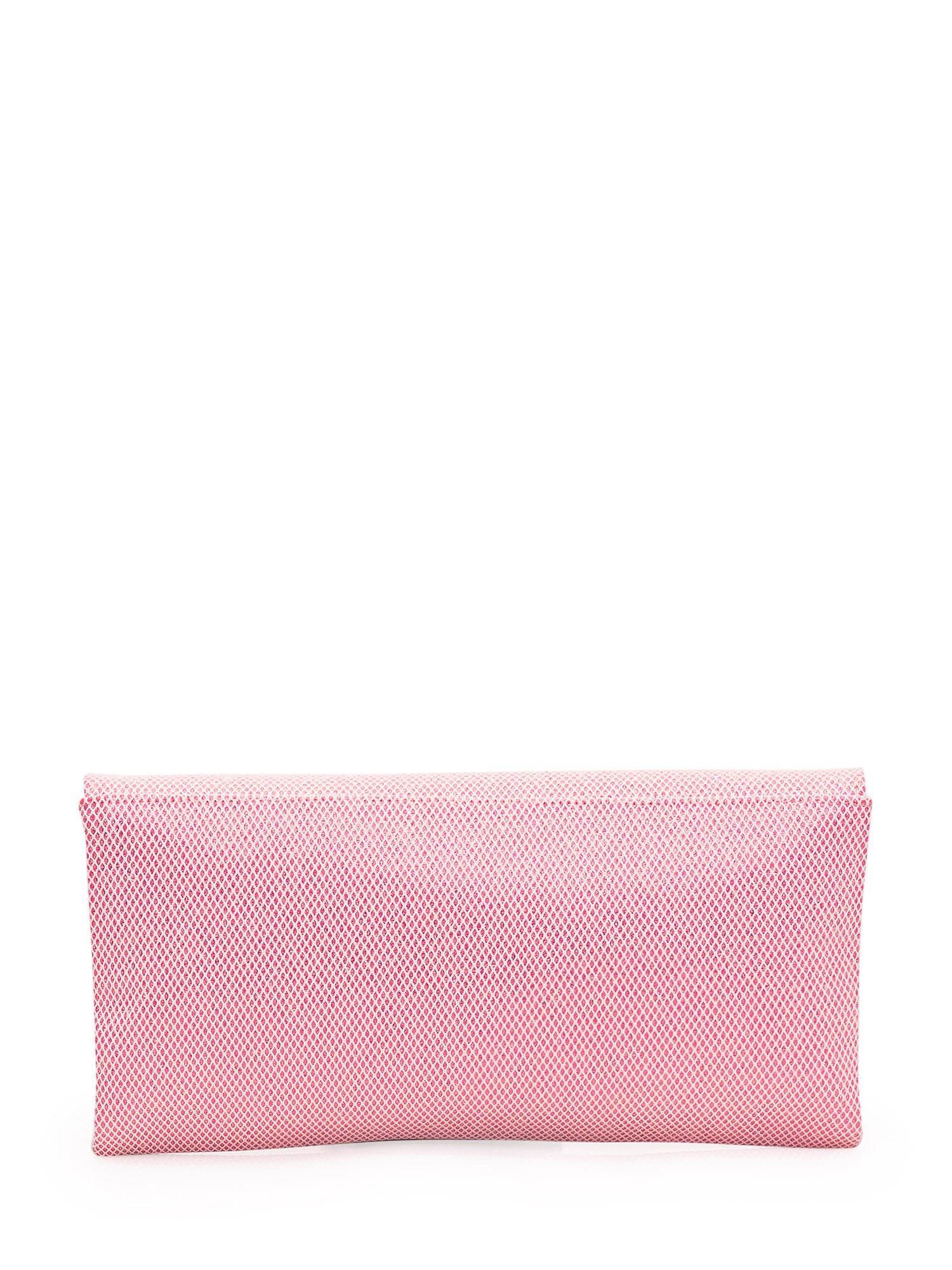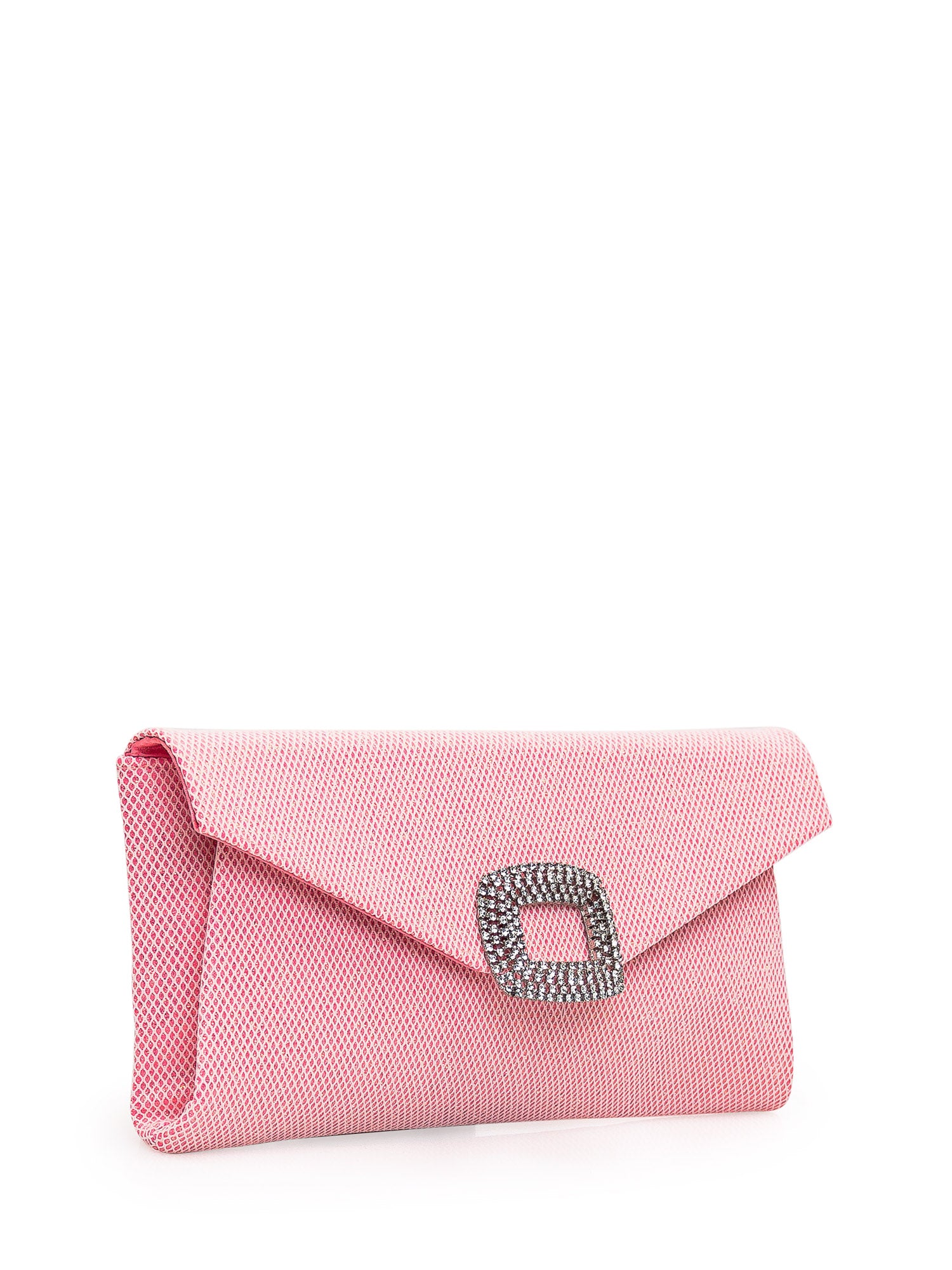 Pink clutch bag in diamond fabric. Chain shoulder strap. Two interior compartments. Flap closure with magnetic button. Jeweled buckle at front.