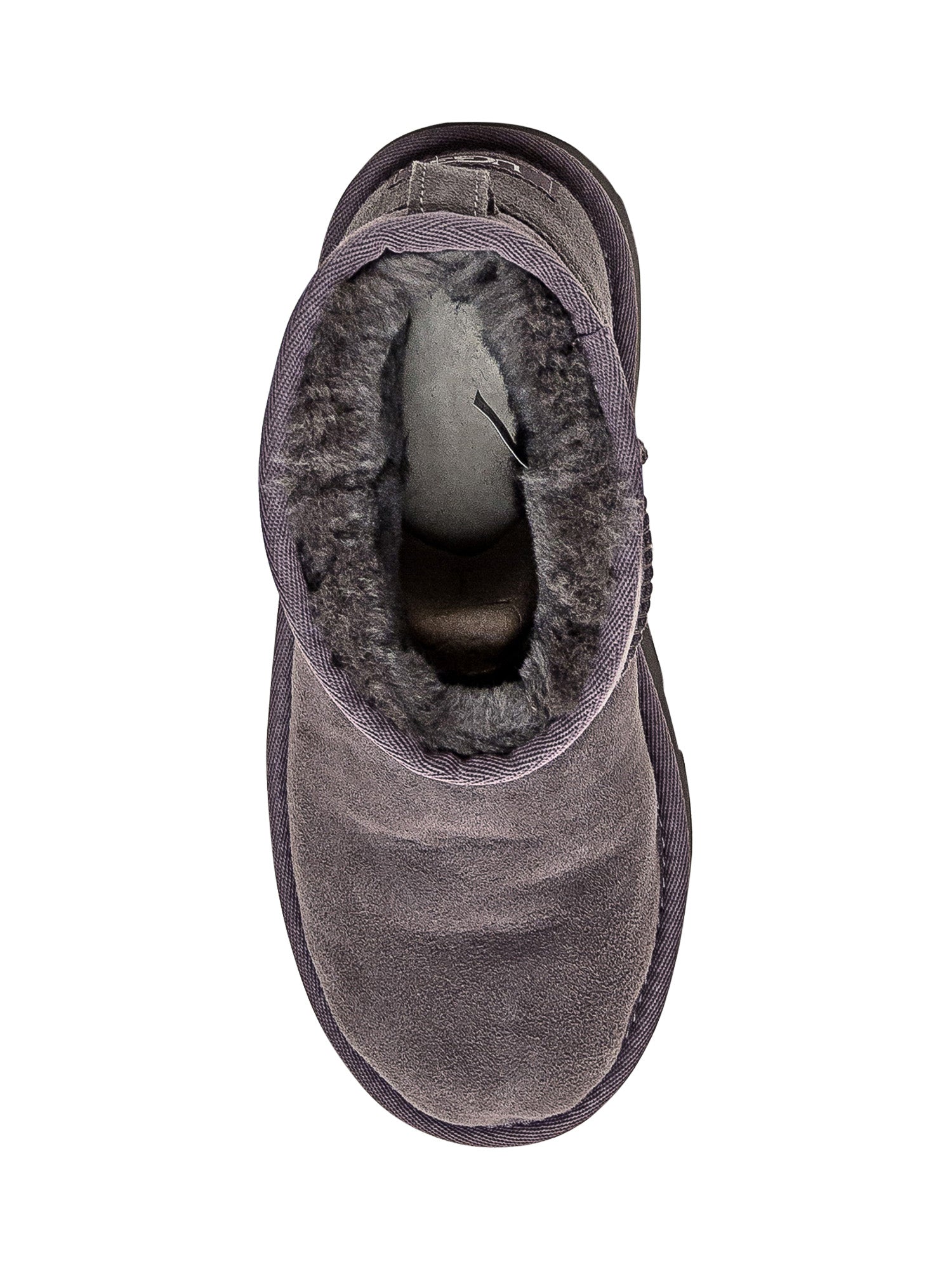 Grey suede boot. Slip-on. Sheepskin lining. Logo patch on the heel.