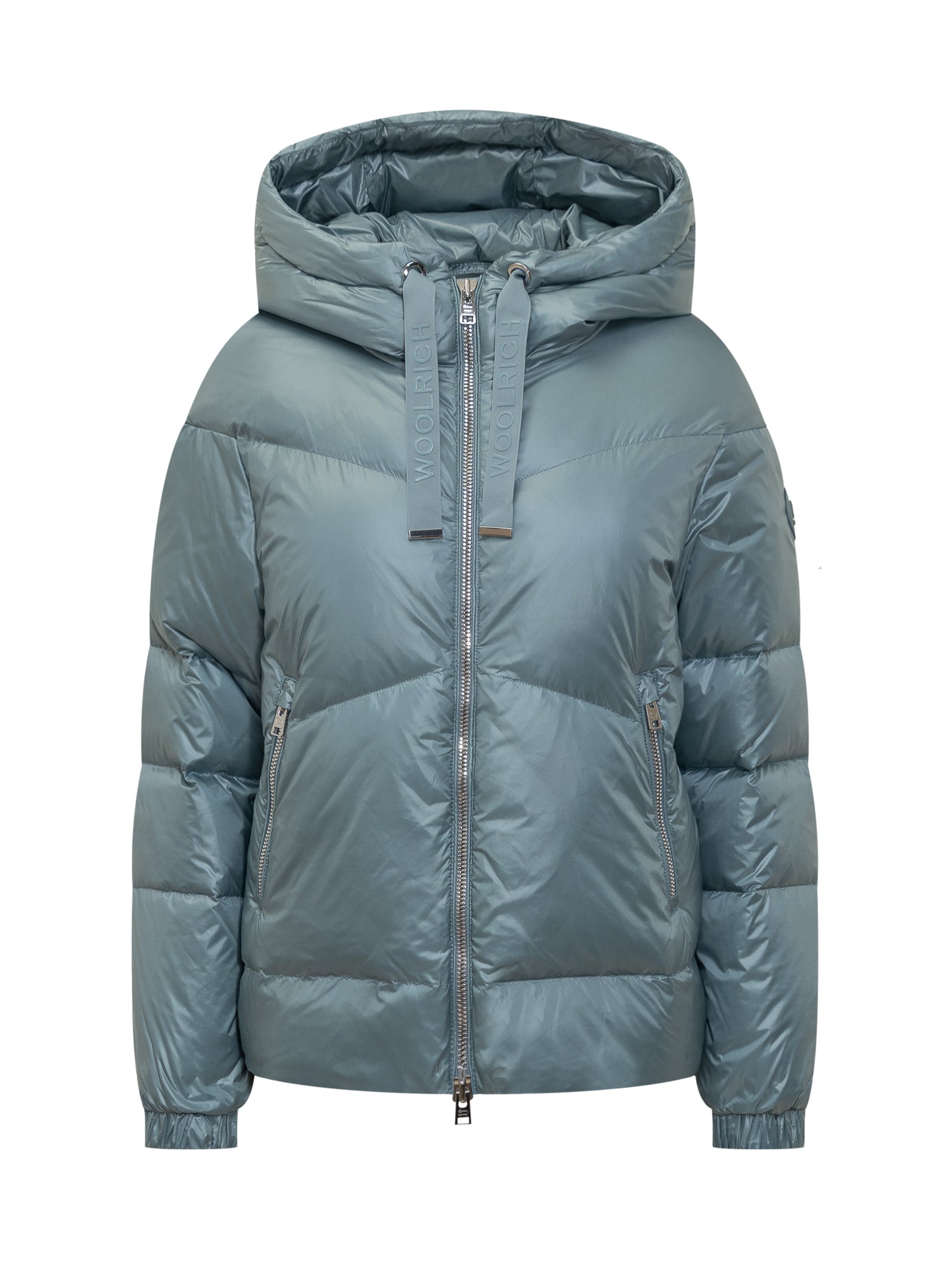 Blue down jacket with hood. Drawstring. Pockets with zip. Logo applied on sleeve. Closure with zip.