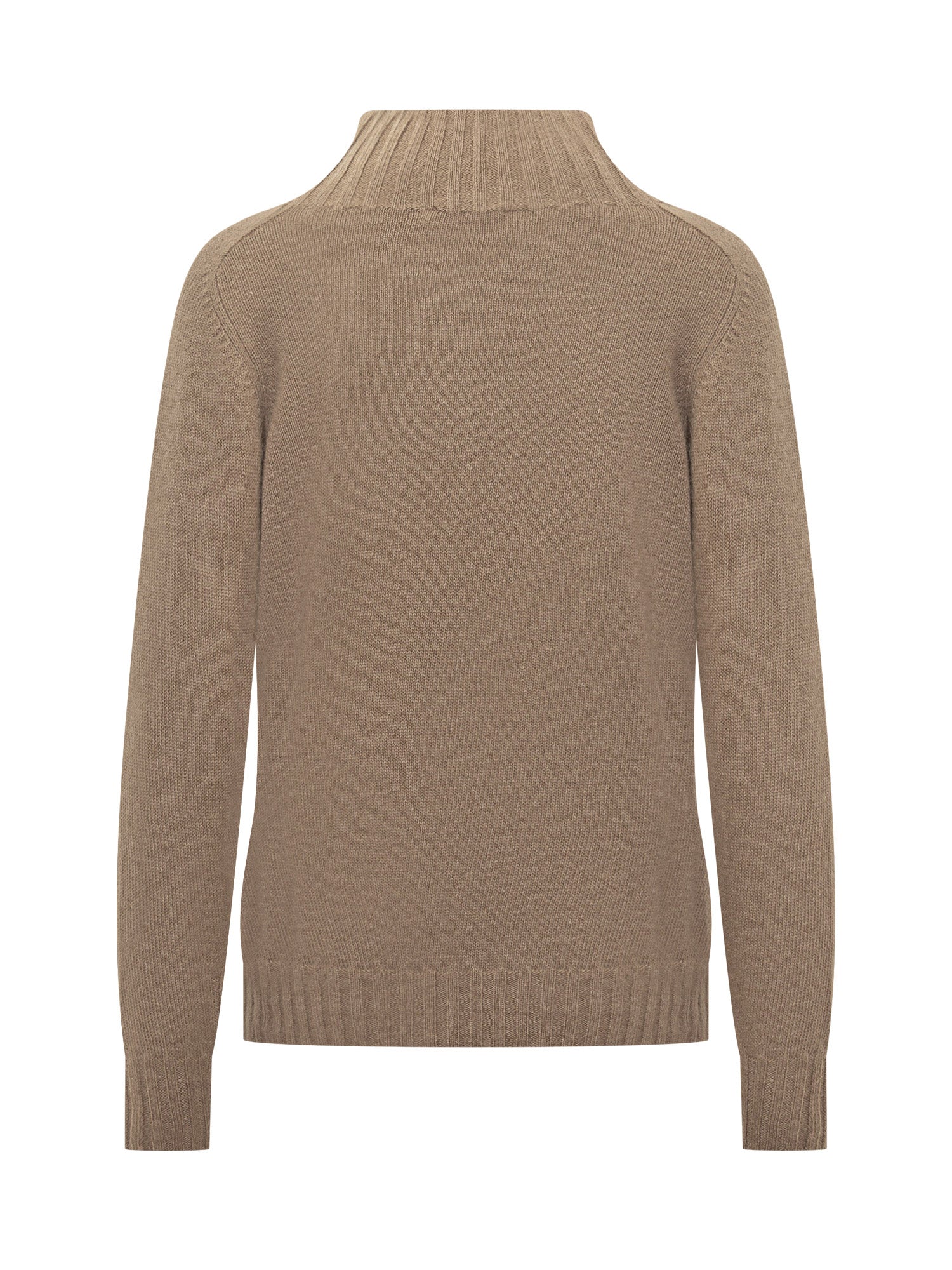Taupe fine-knit sweater with ribbed high neck, minimal design and clean lines, perfect for elegant and versatile looks.