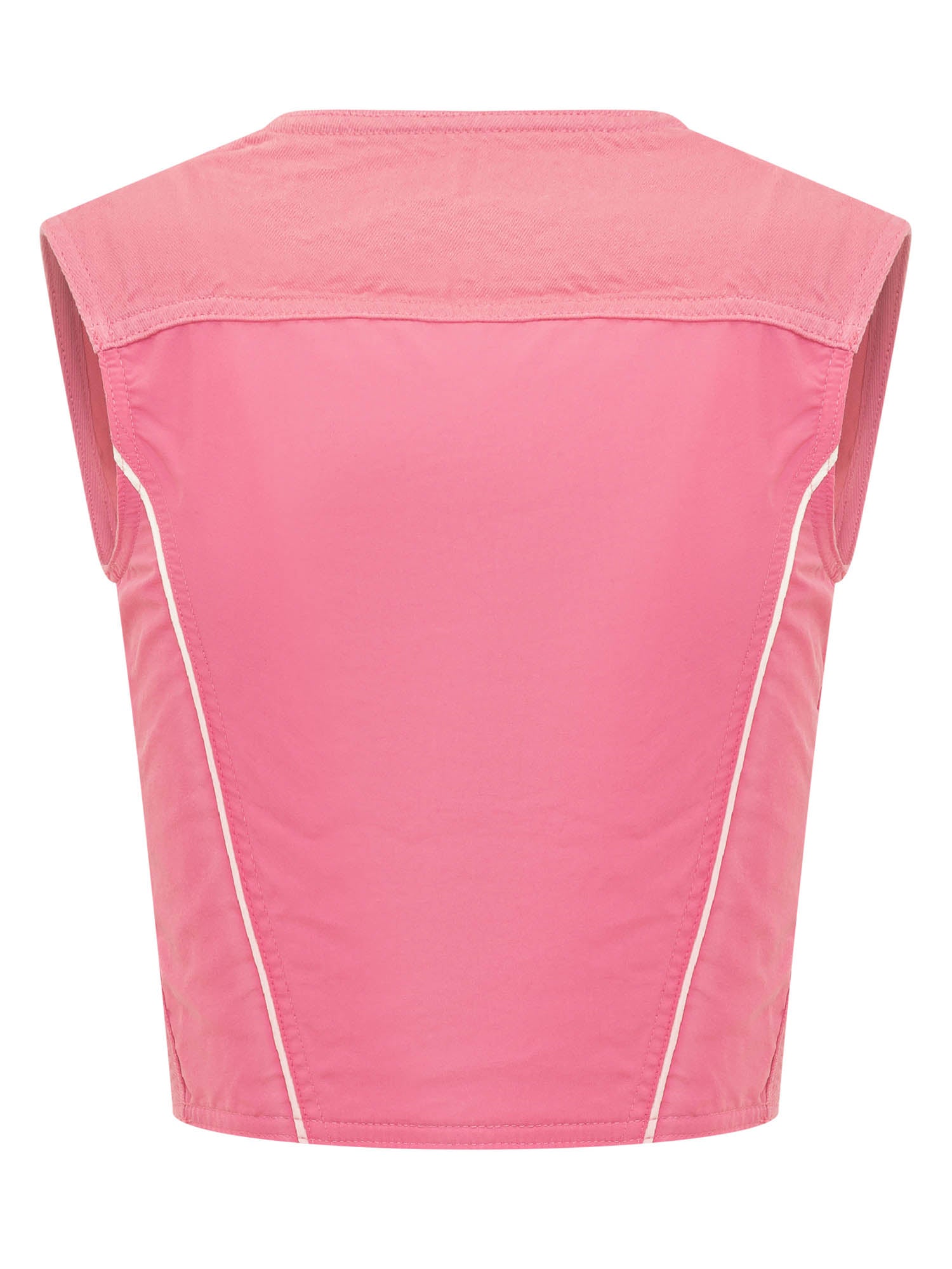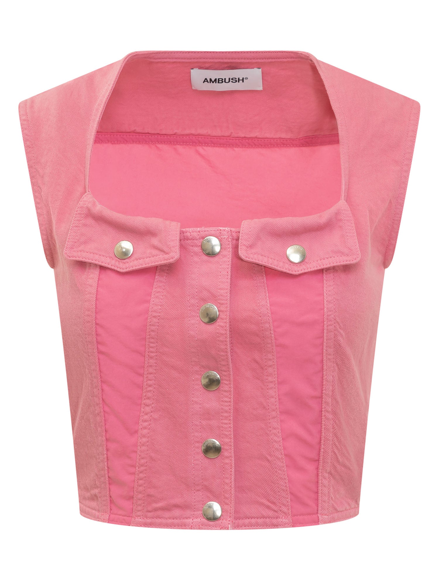 Top in denim and nylon. Sleeveless. Square neckline. Button closure.