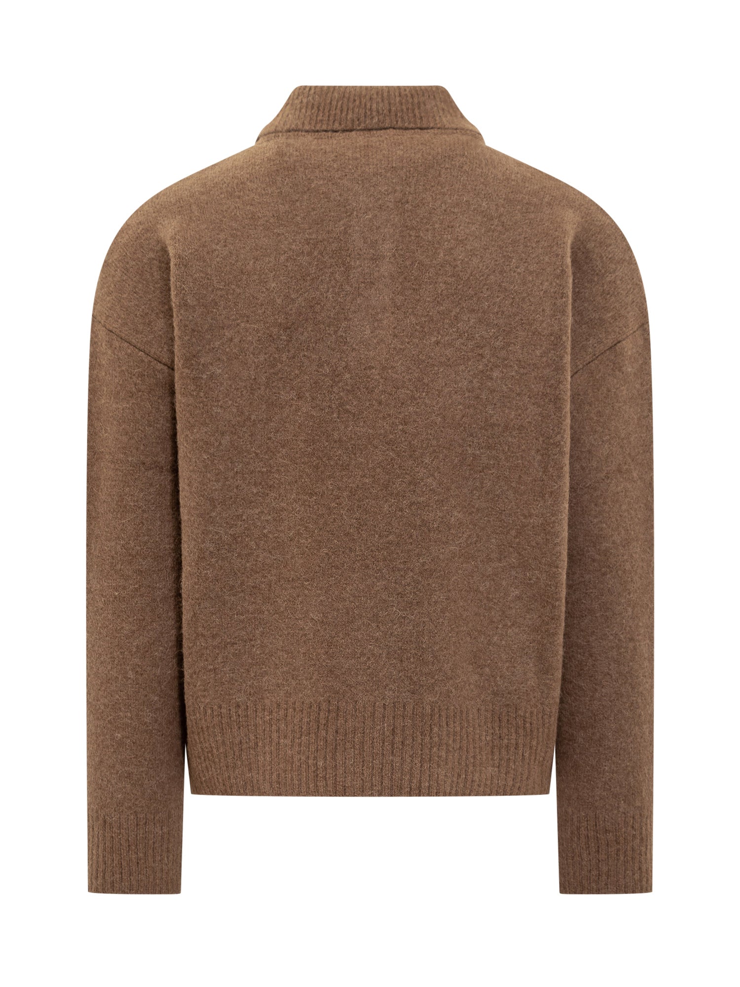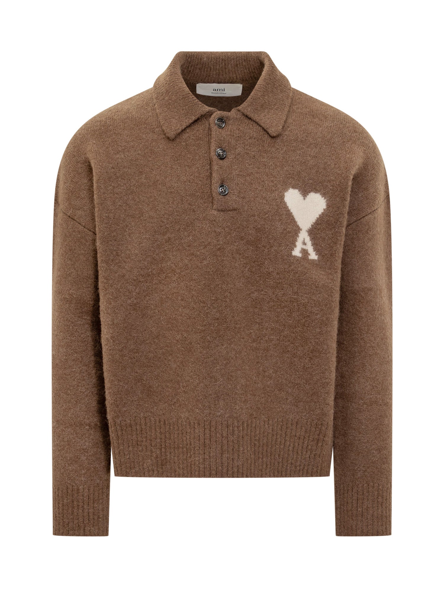 Ami wool sweater in brown with polo collar and buttons. Featuring the Ami de Coeur heart logo on the chest.