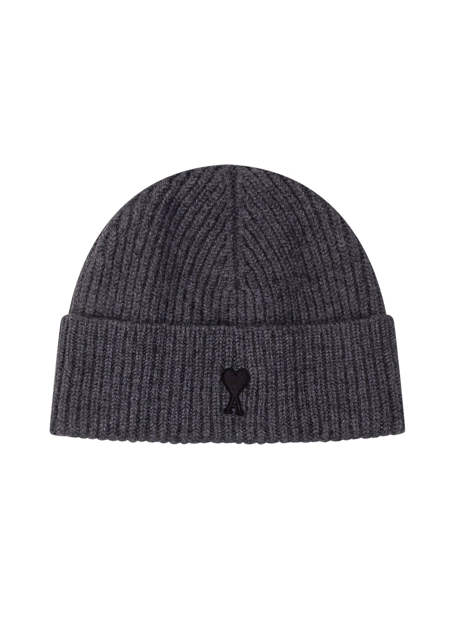 Dark grey ribbed knit beanie by Ami Paris featuring the iconic Ami de Coeur logo.