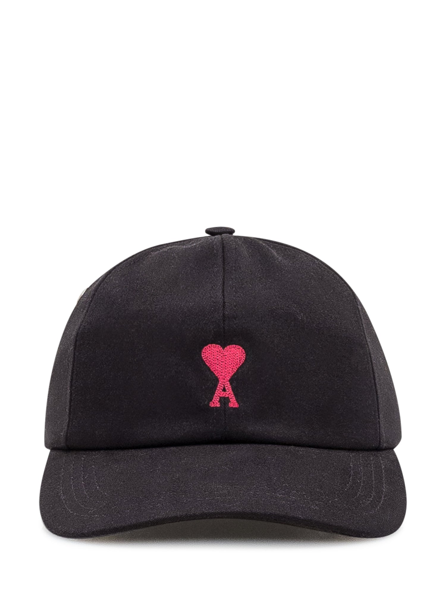 Ami Paris black cotton cap featuring the iconic Ami De Coeur embroidered logo on the front. Casual yet refined style, adjustable at the back for a perfect fit.