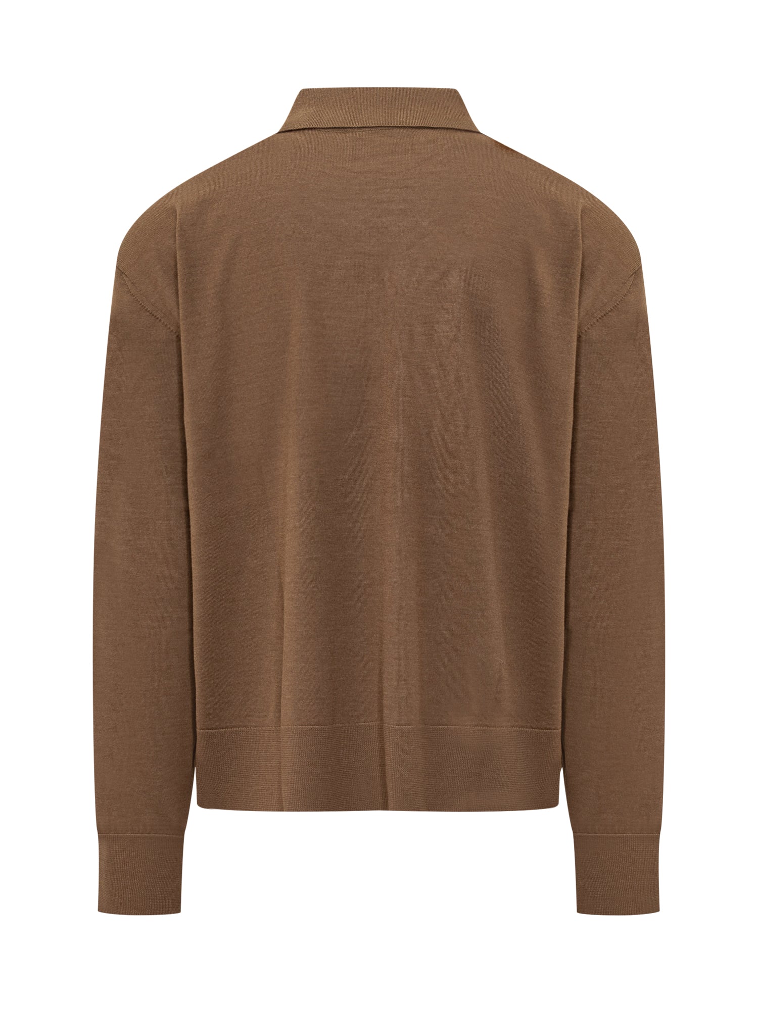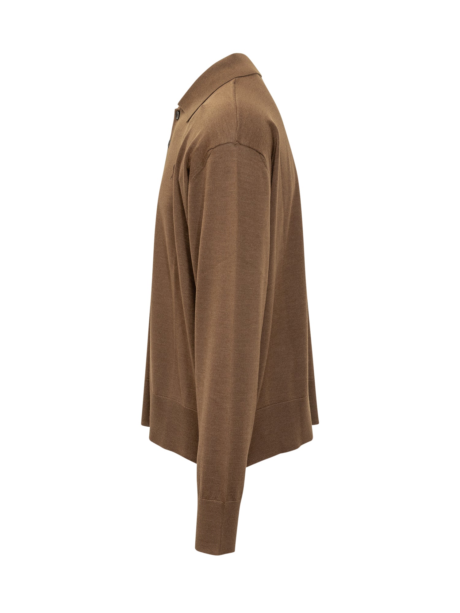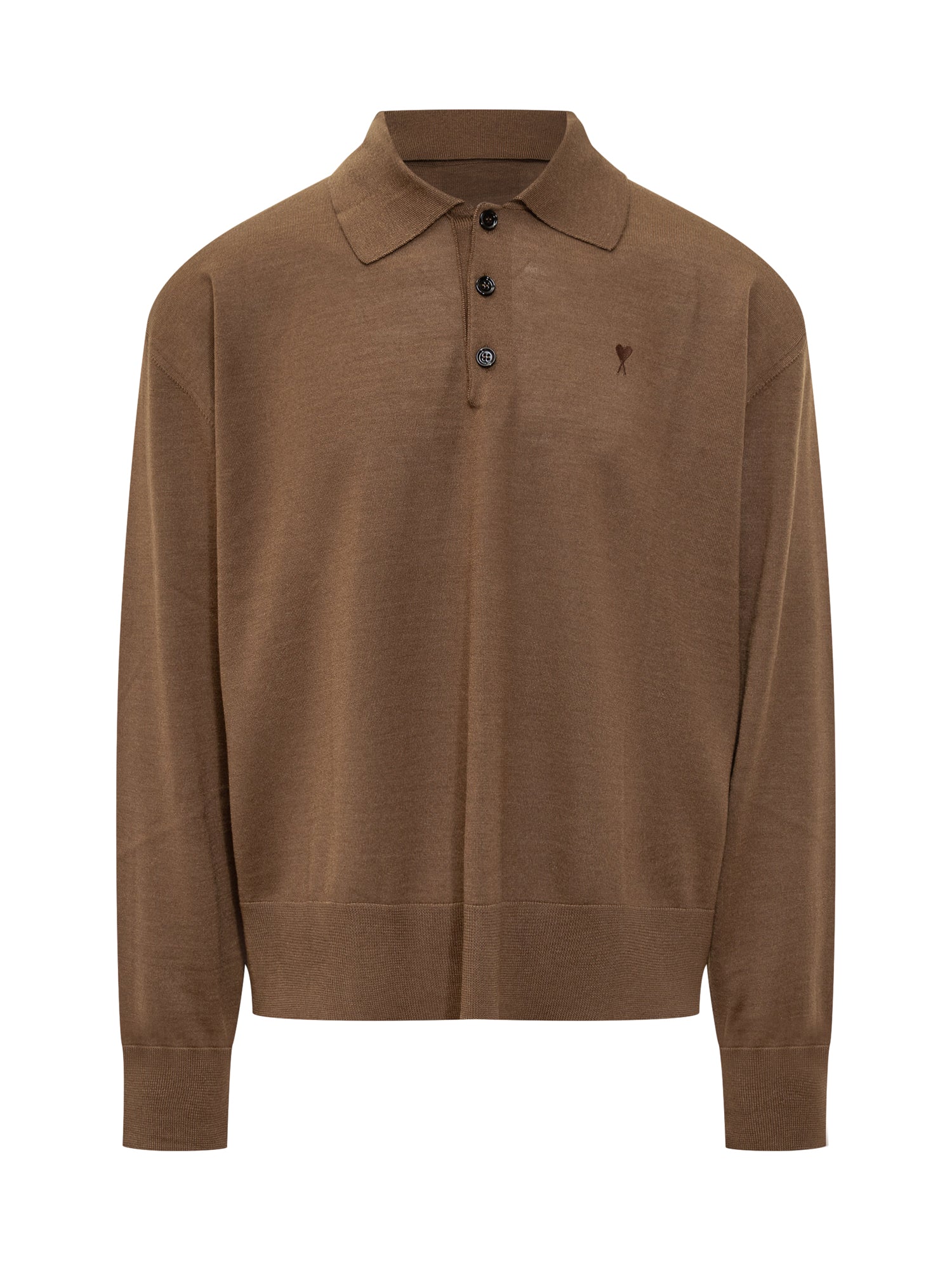 Long-sleeve polo by Ami Paris in lightweight brown wool, featuring a classic collar and tonal embroidered Ami de Coeur logo on the chest.