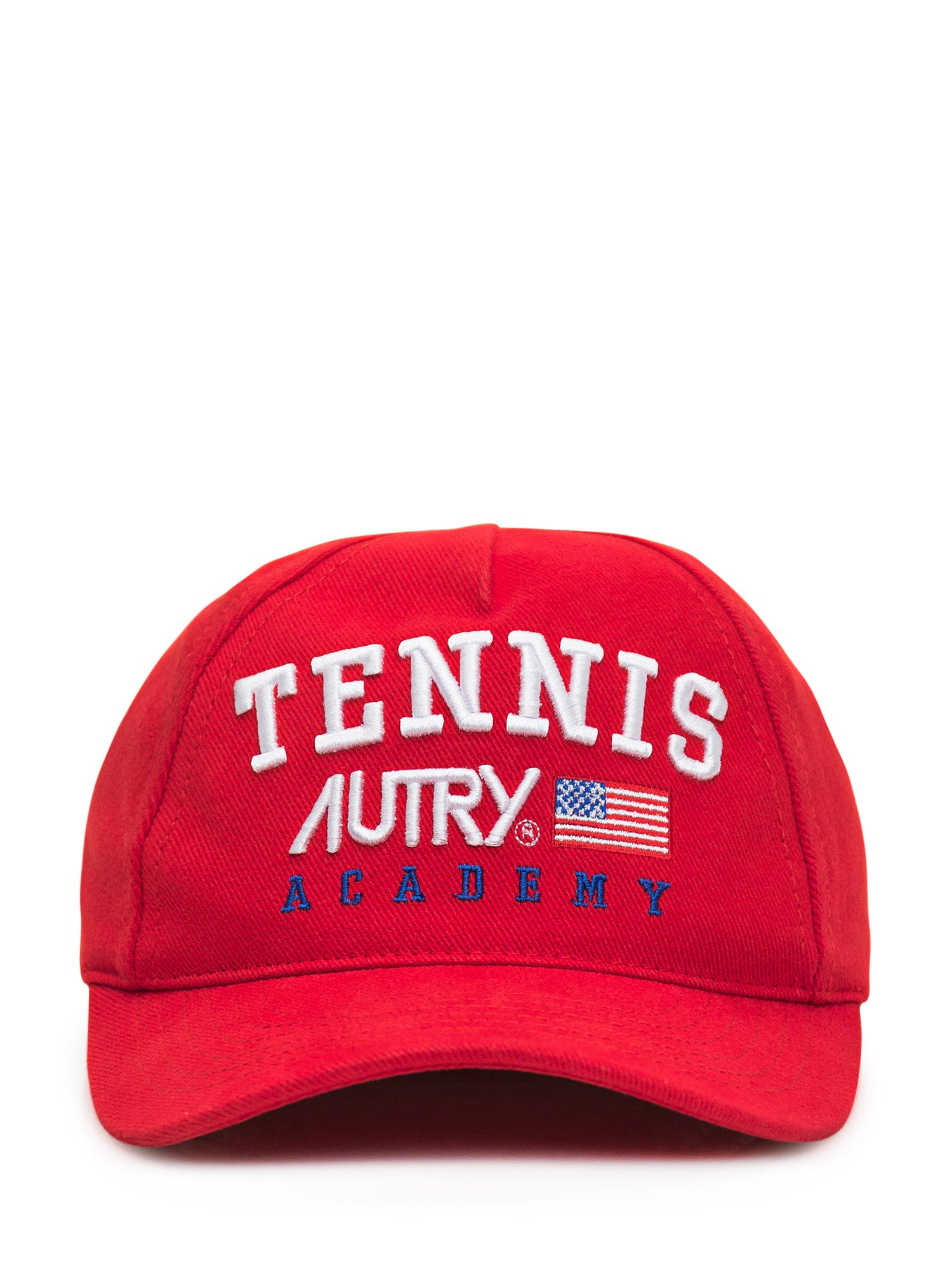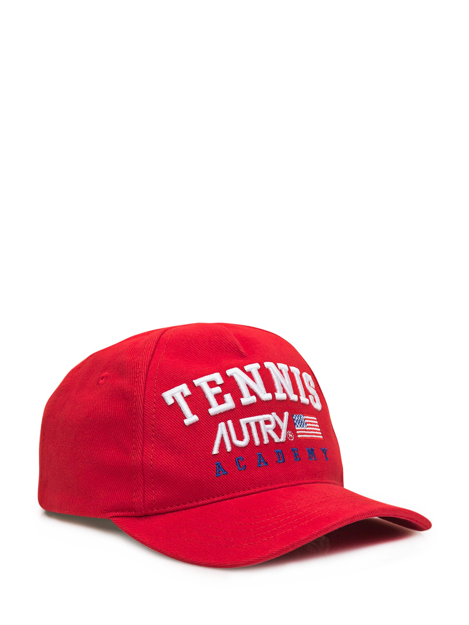 Red cap. Curved visor. Strap on the back. Lettering on the front.