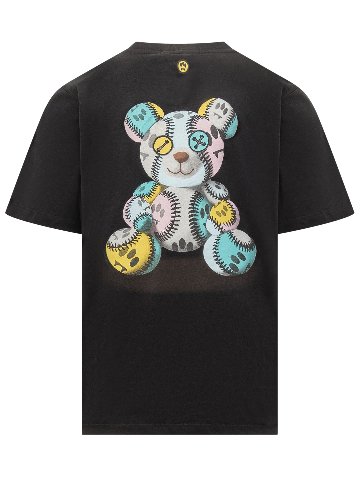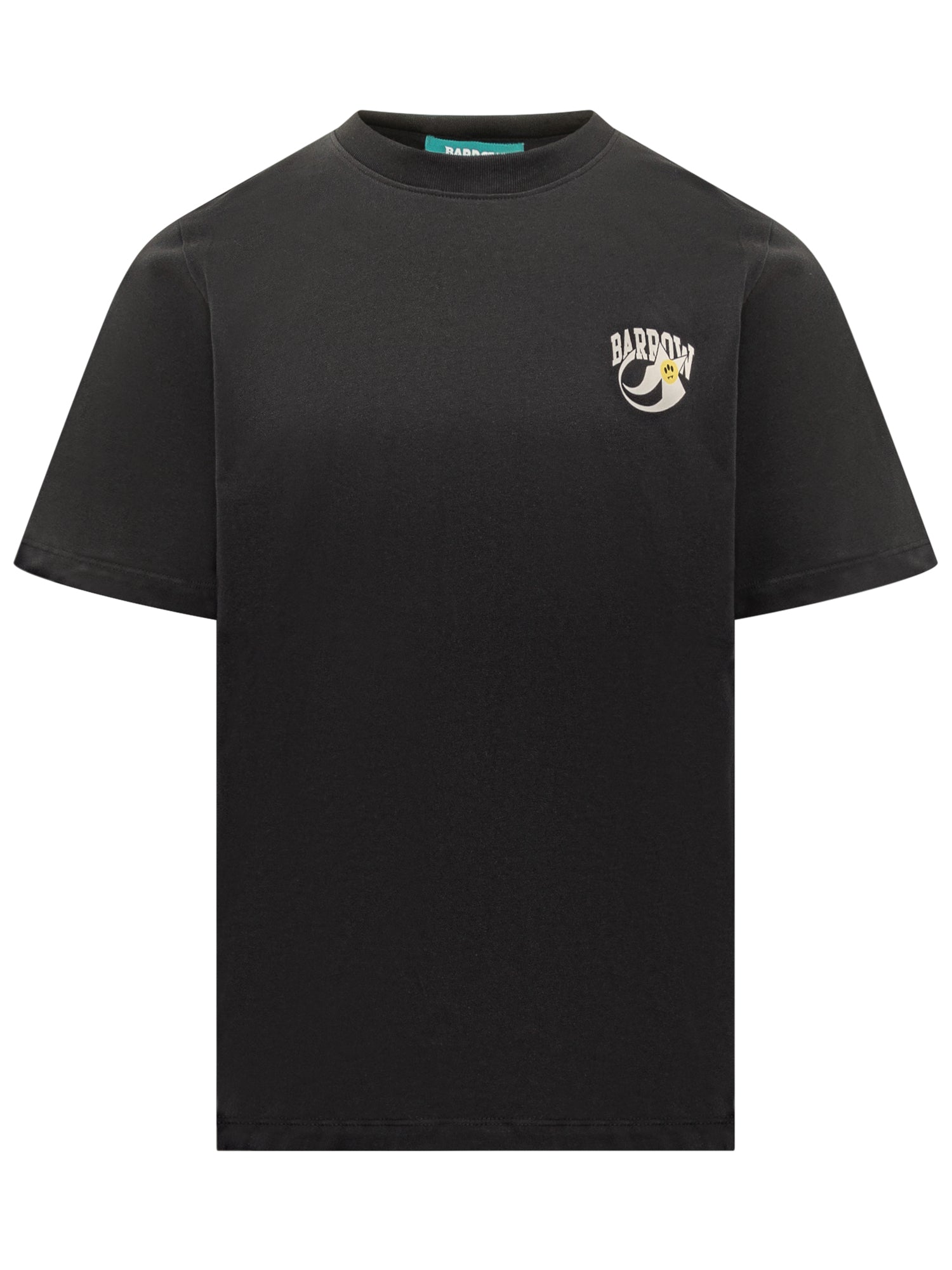 Barrow black cotton short-sleeve T-shirt featuring curved logo and small yellow emoji on the chest.