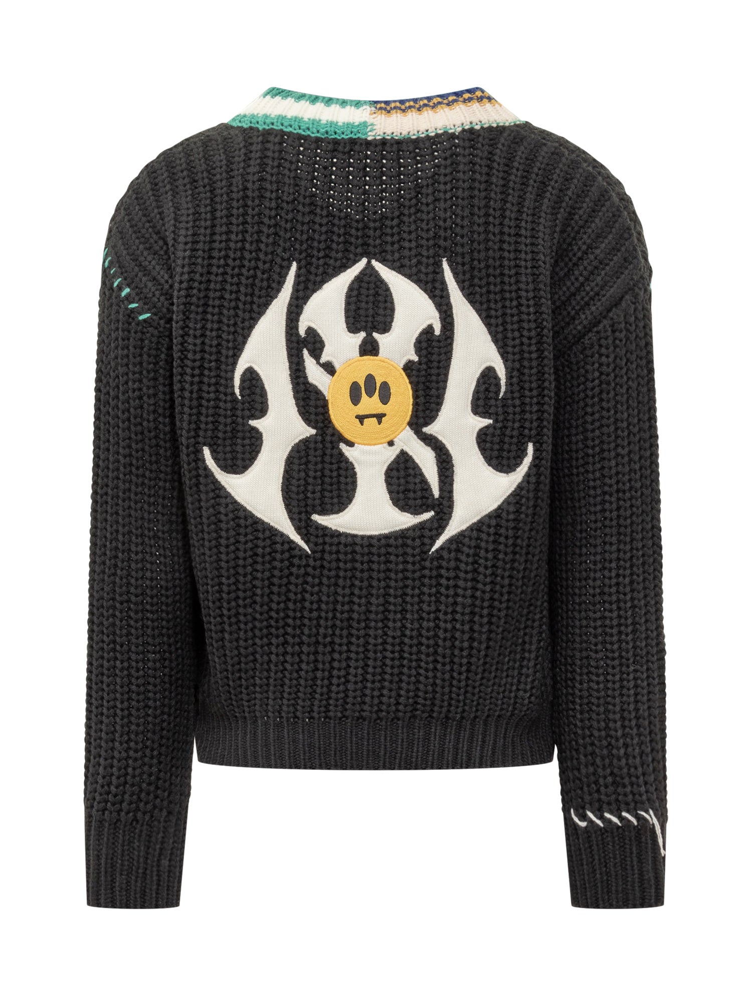 Barrow black chunky knit cotton sweater with multicolor V-neck and flame logo with smiley on the chest. Contrast stitching and decorative details.