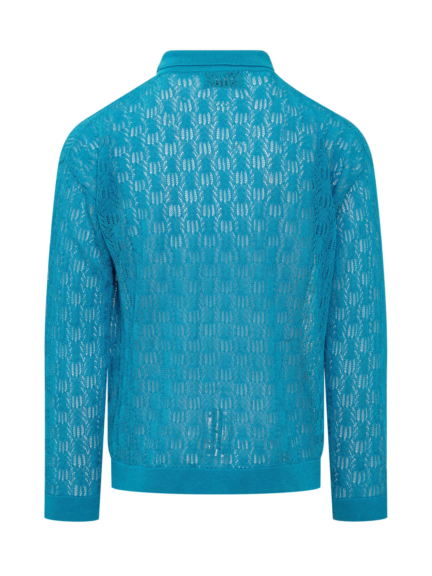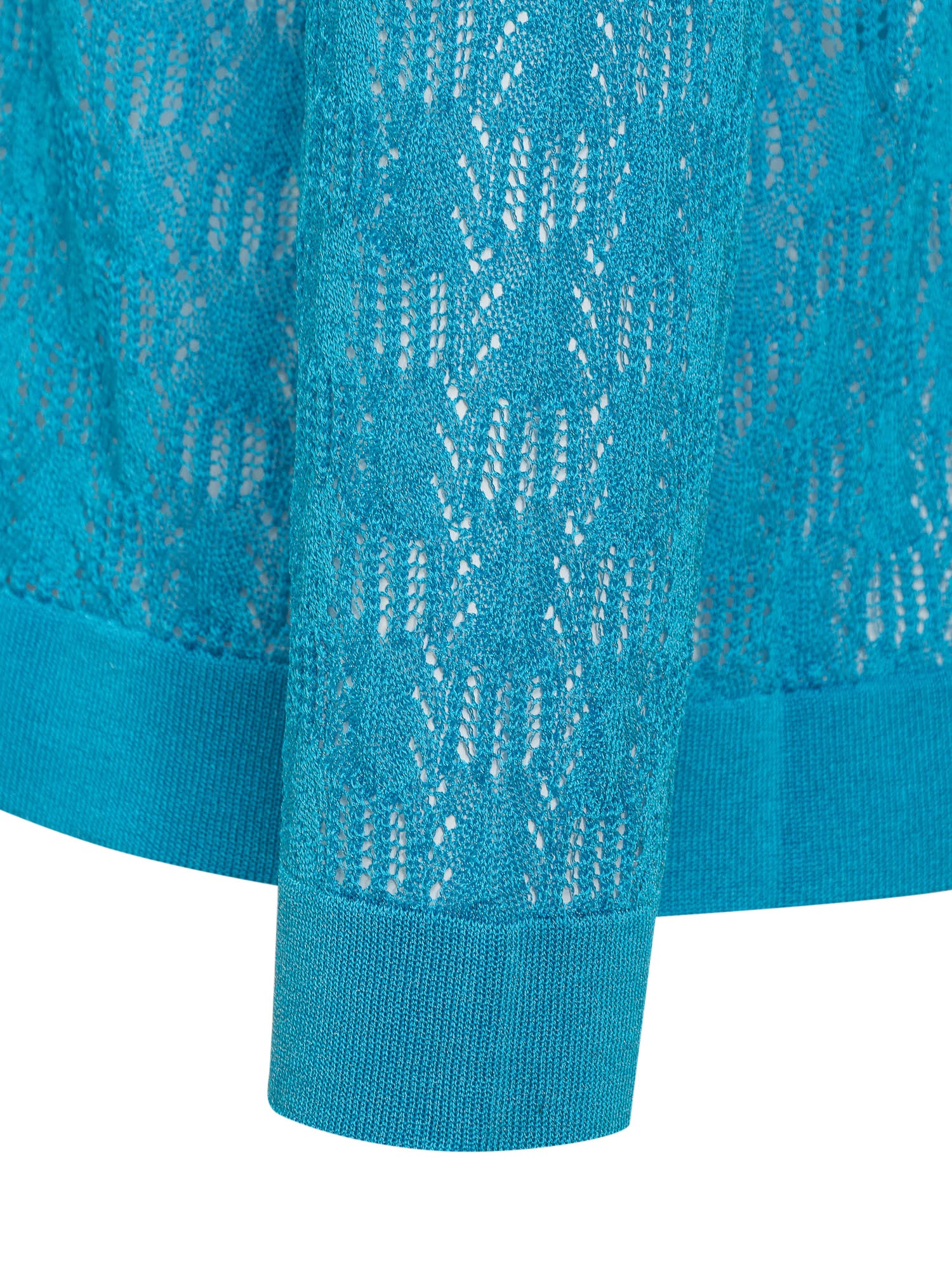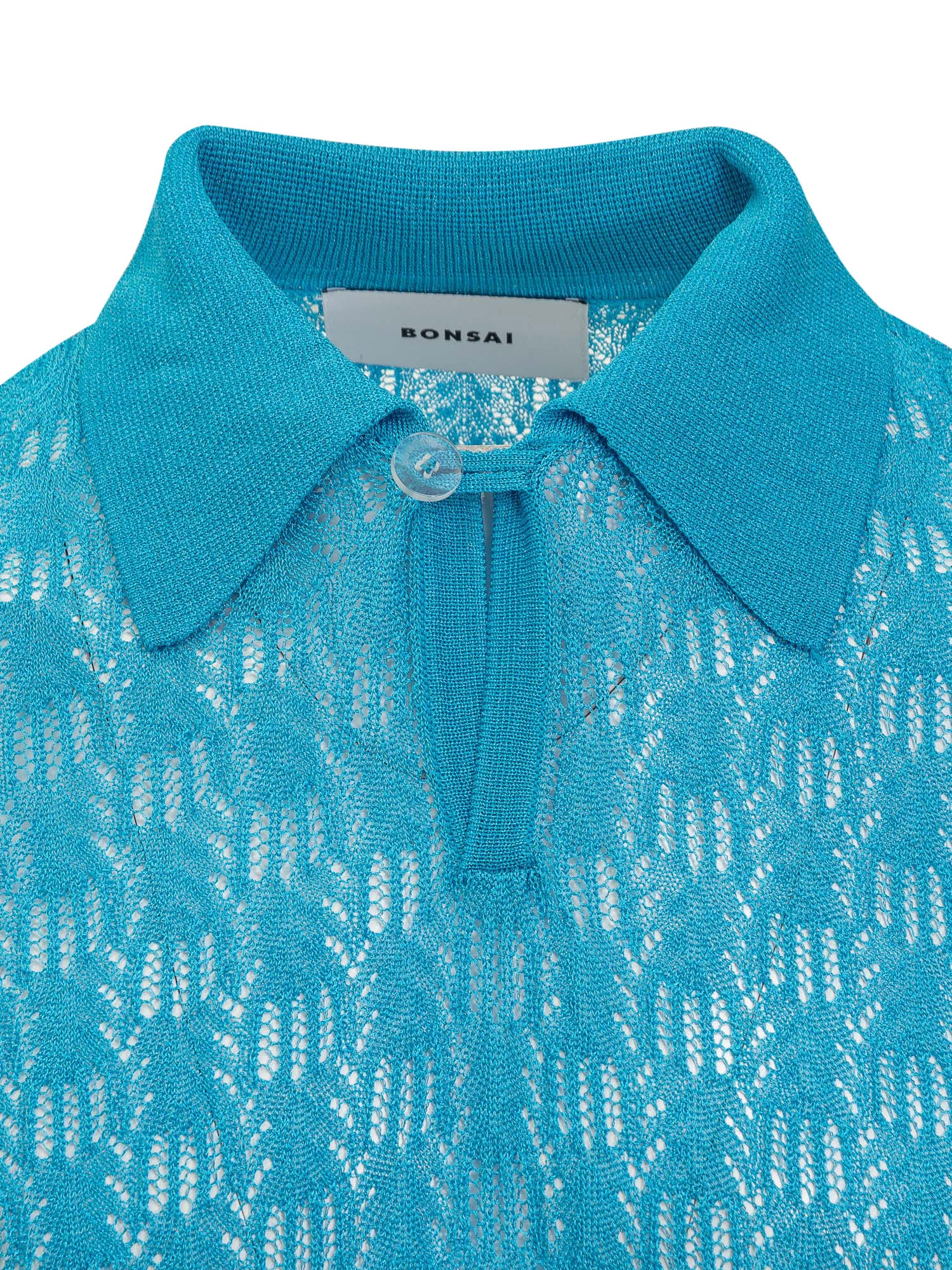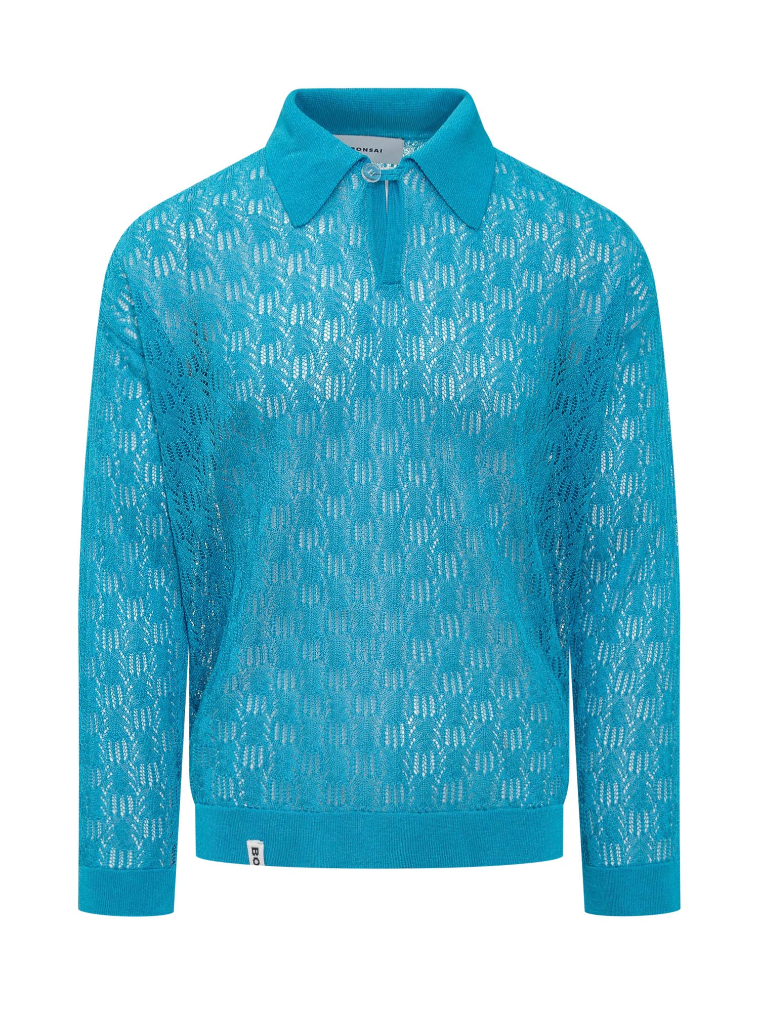 Long sleeve polo shirt. Regular ribbed collar. Button closure. Openwork knit. Ribbed cuffs and bottom. Blue color.