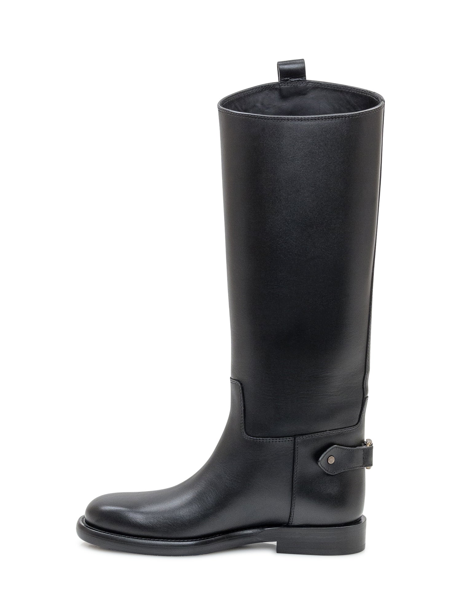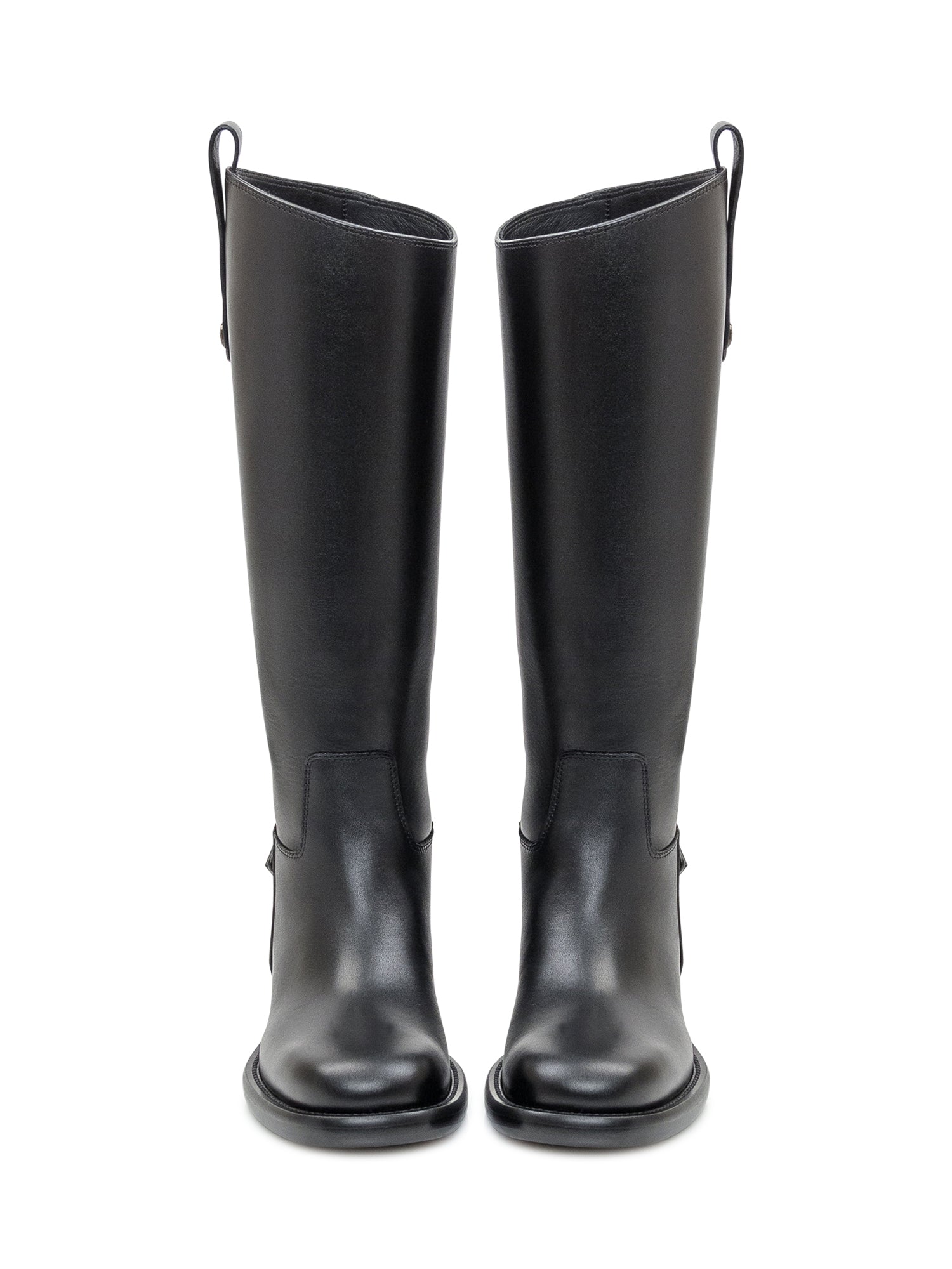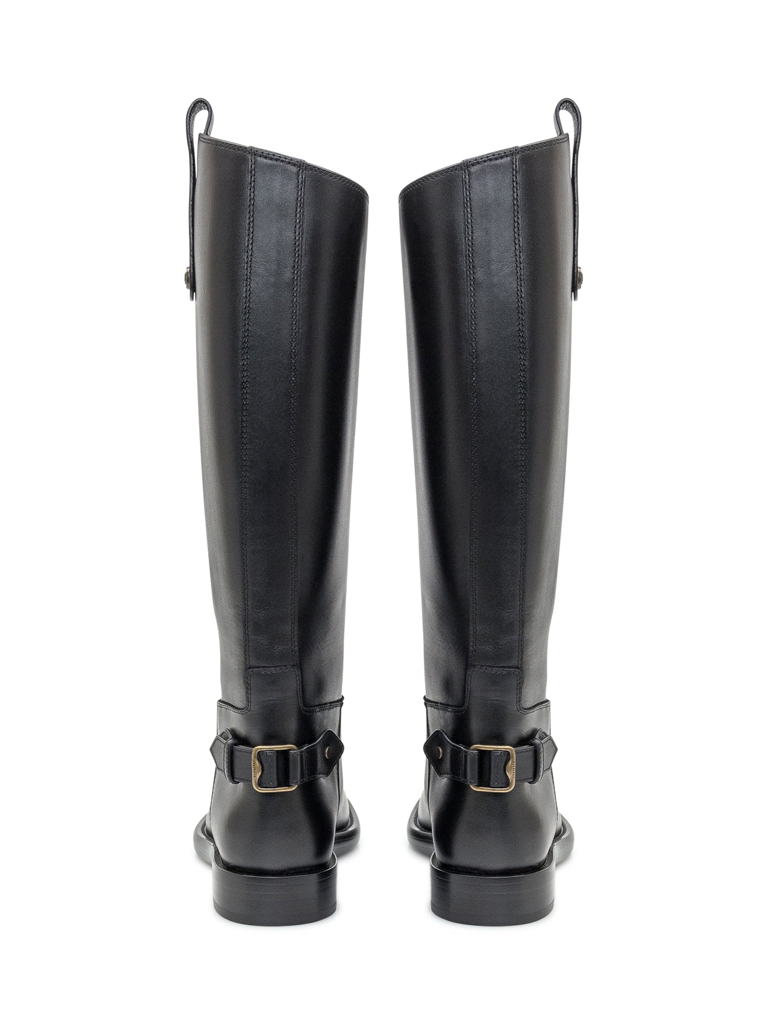Burberry tall boots crafted in smooth black leather, featuring buckle detail and subtle metal logo.