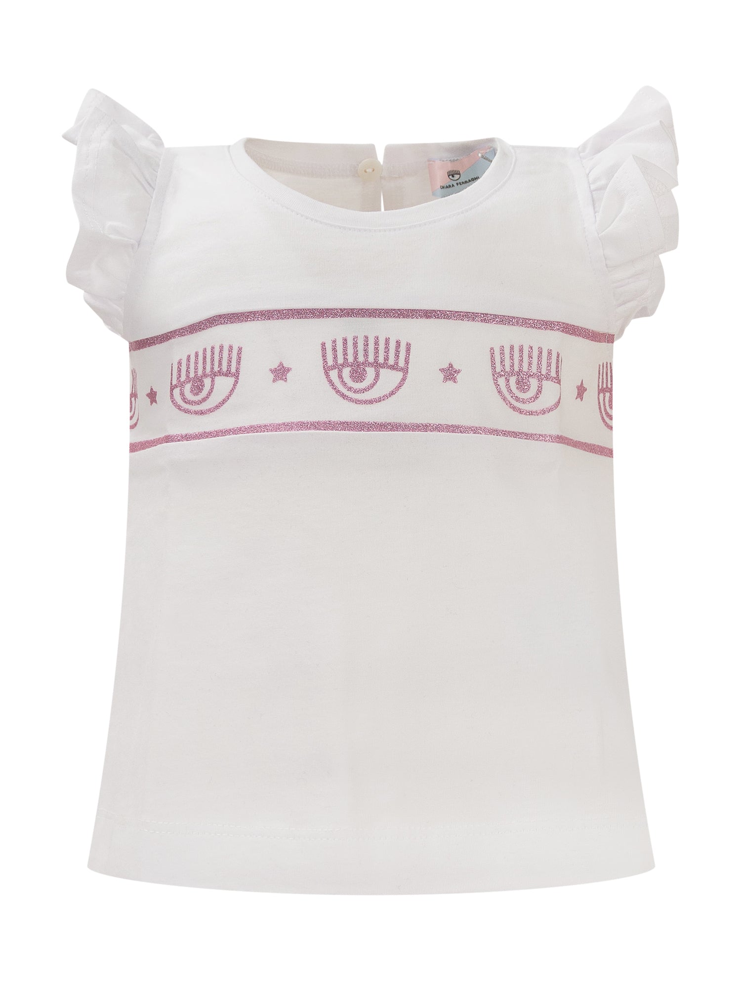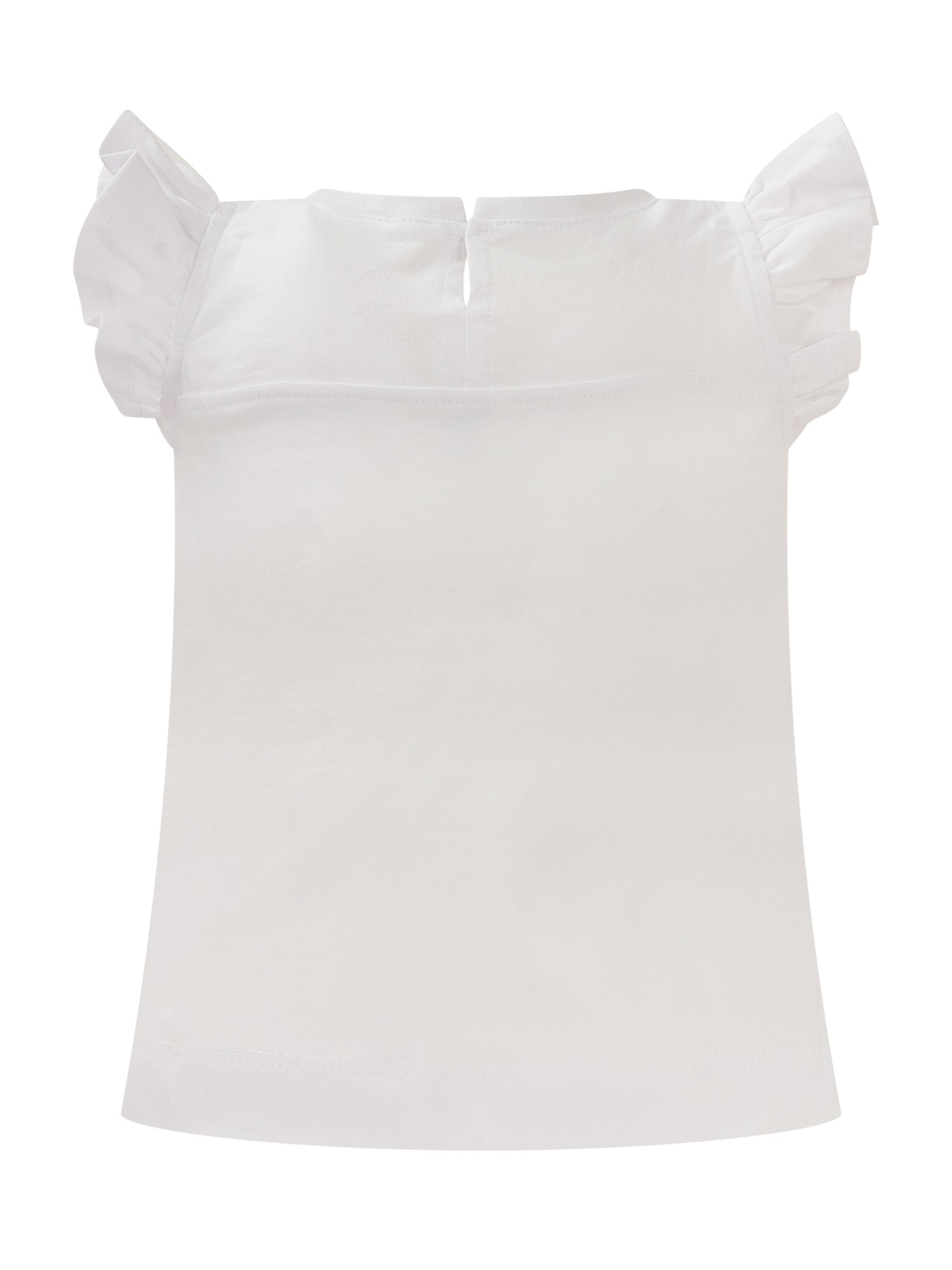 Tank top with button on the back. Ruffles on the shoulders. Logomania with glitter.