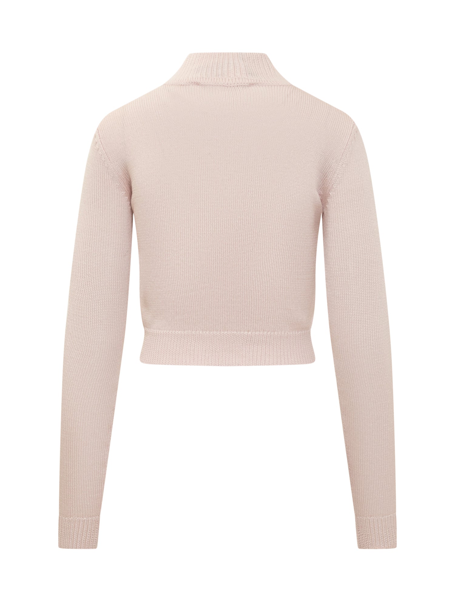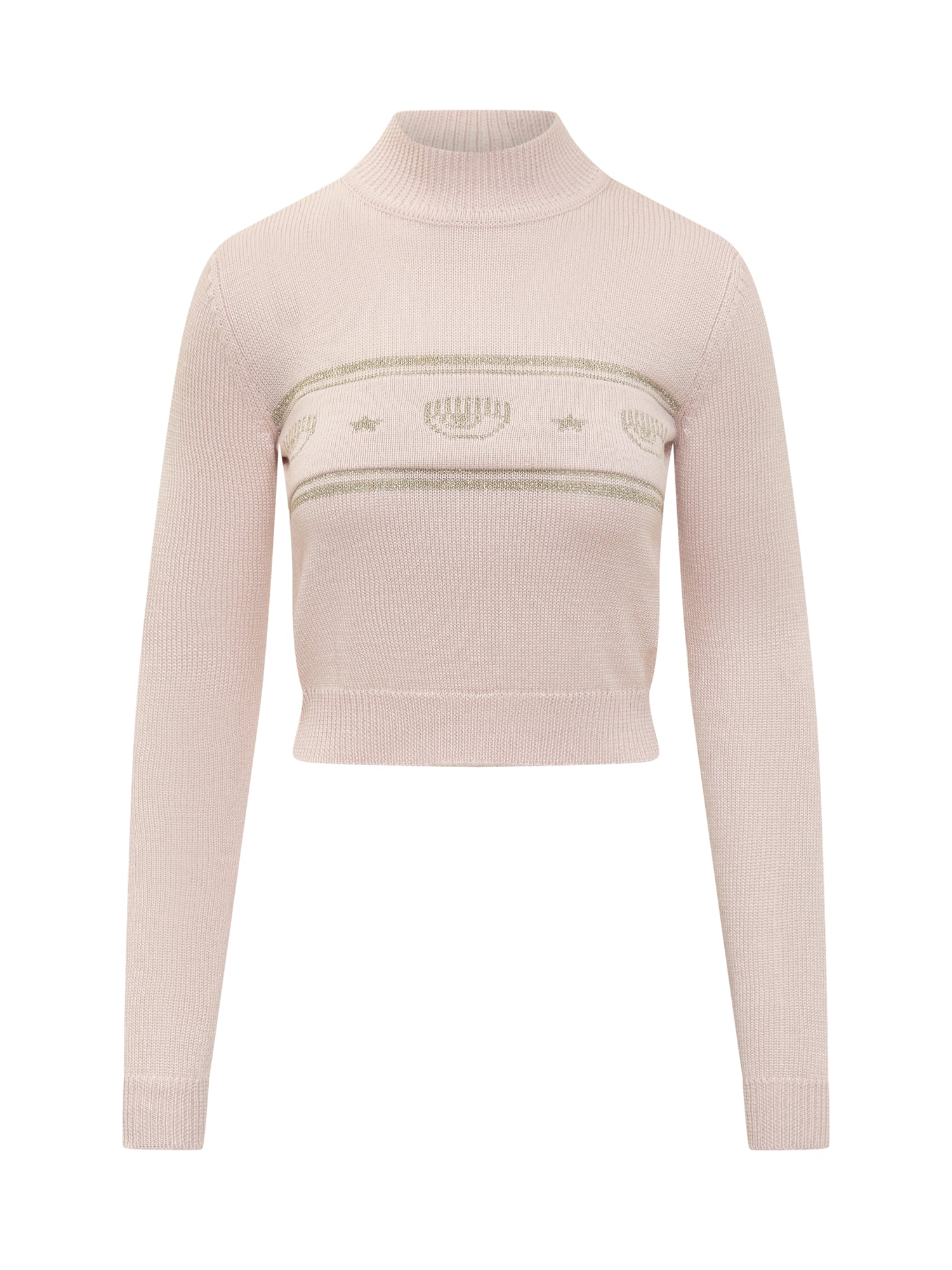 Long-sleeved sweater. High collar. Ribbed collar, bottom and cuffs. Eye motif in jacquard with glitter on the front.