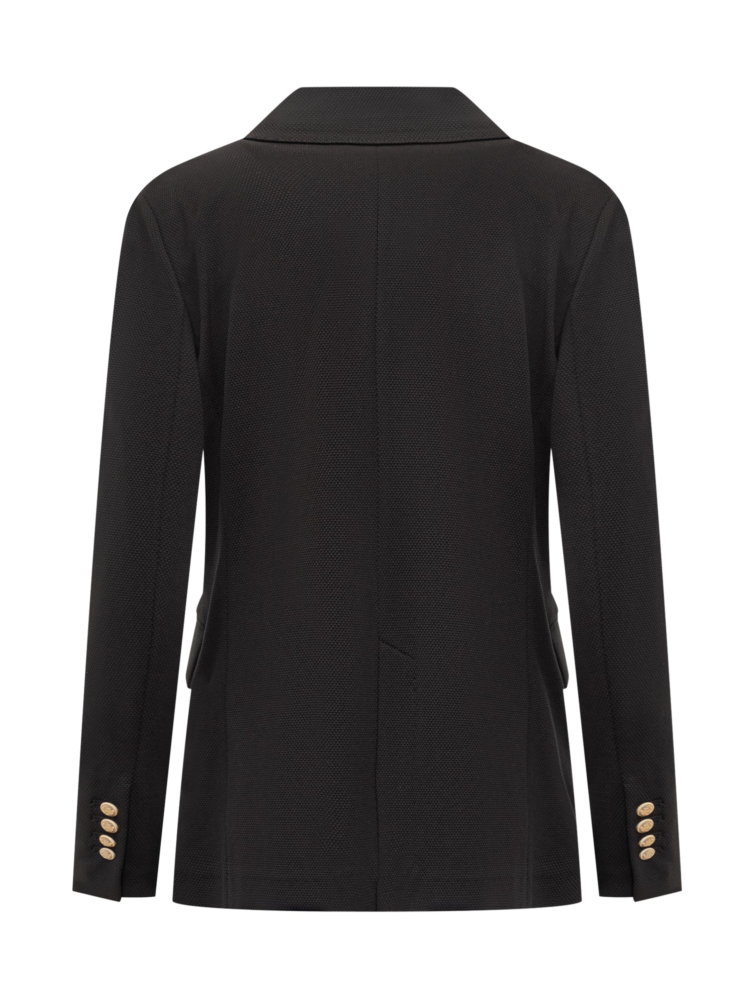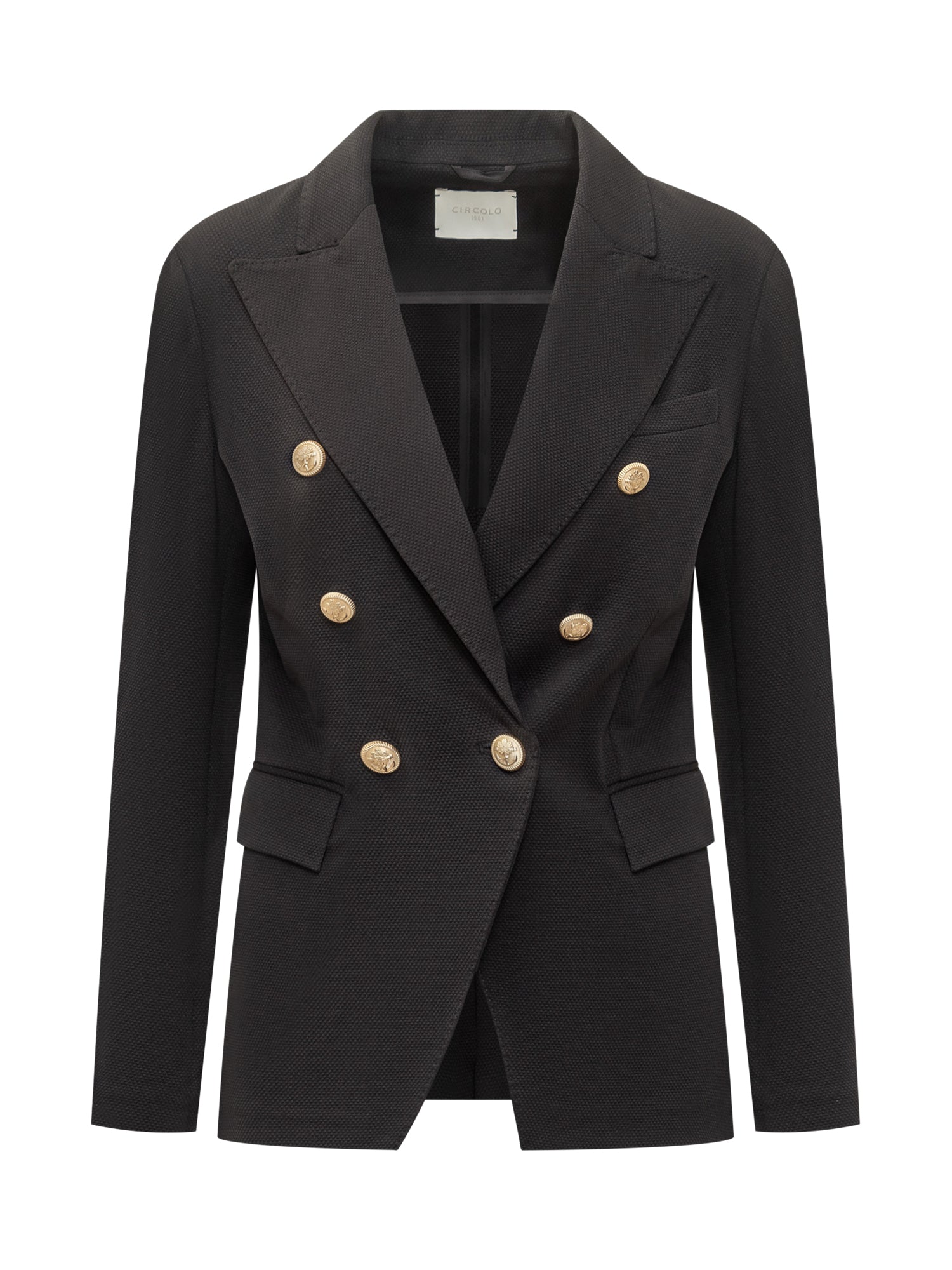 Classic lapels. Double-breasted closure with metal buttons. Cuffs with buttons. Two flap pockets and one welt pocket. Slim fit.