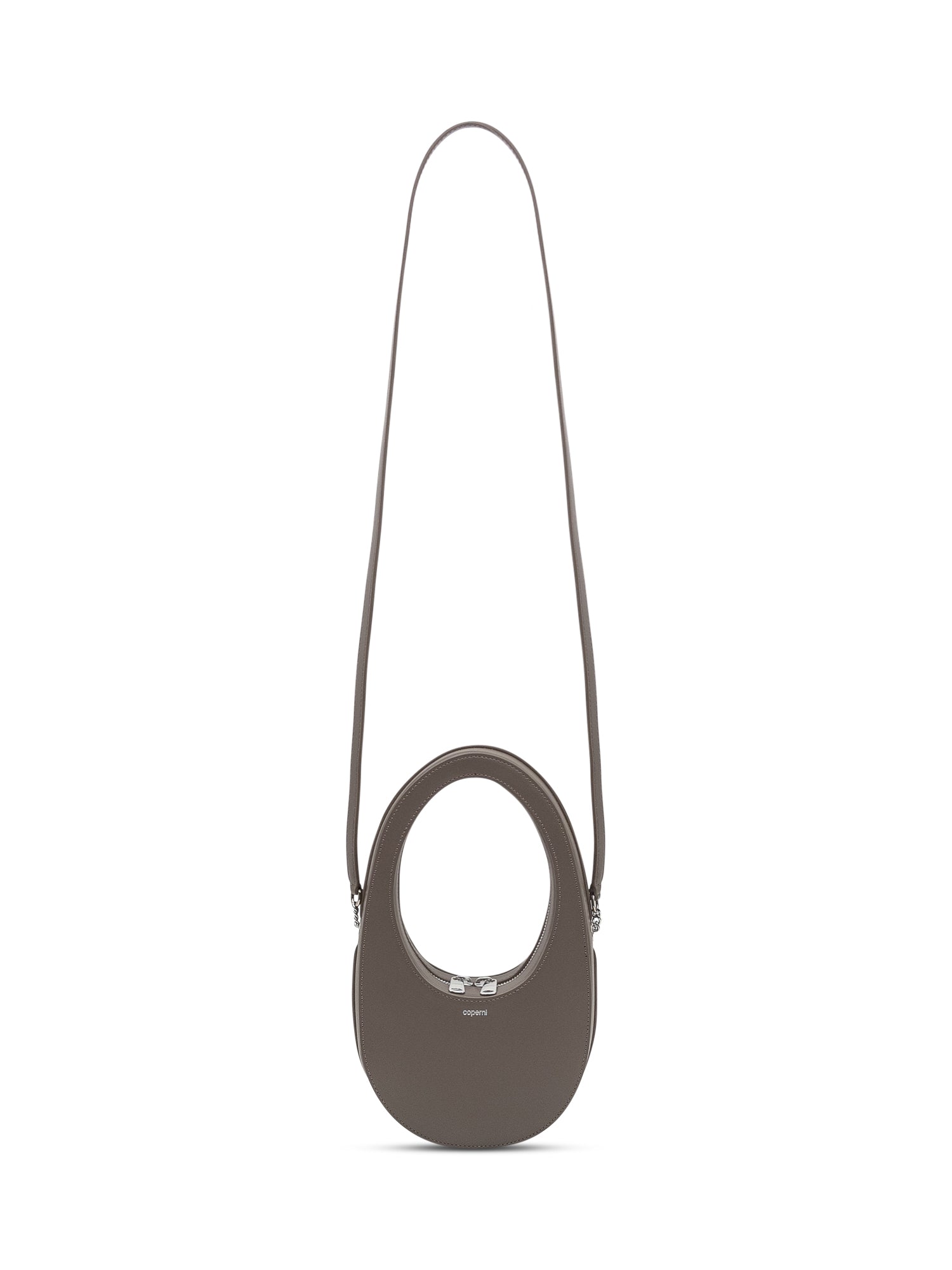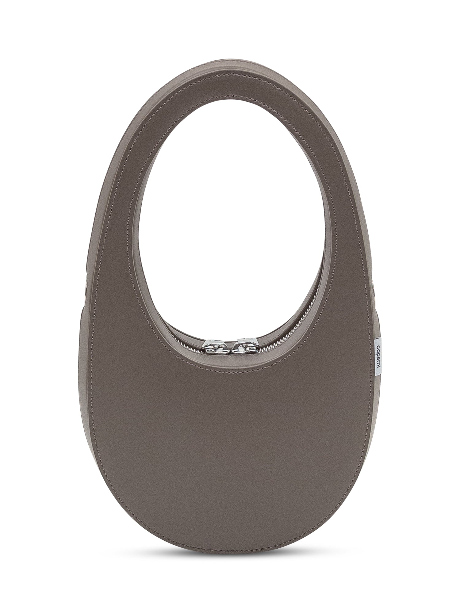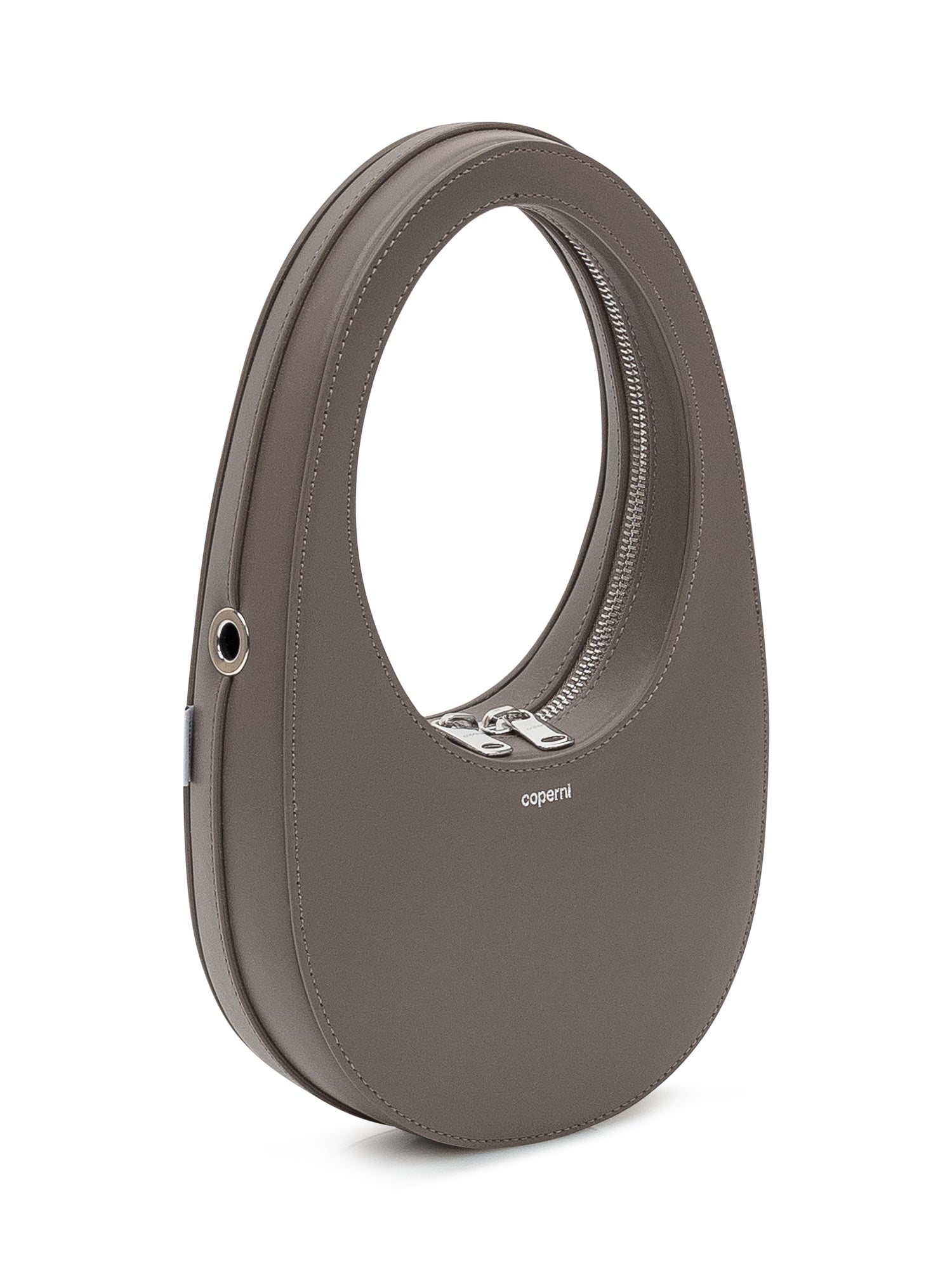 Mini shoulder bag by Coperni, Swipe model in smooth taupe leather. Double zipper closure and silver front logo.