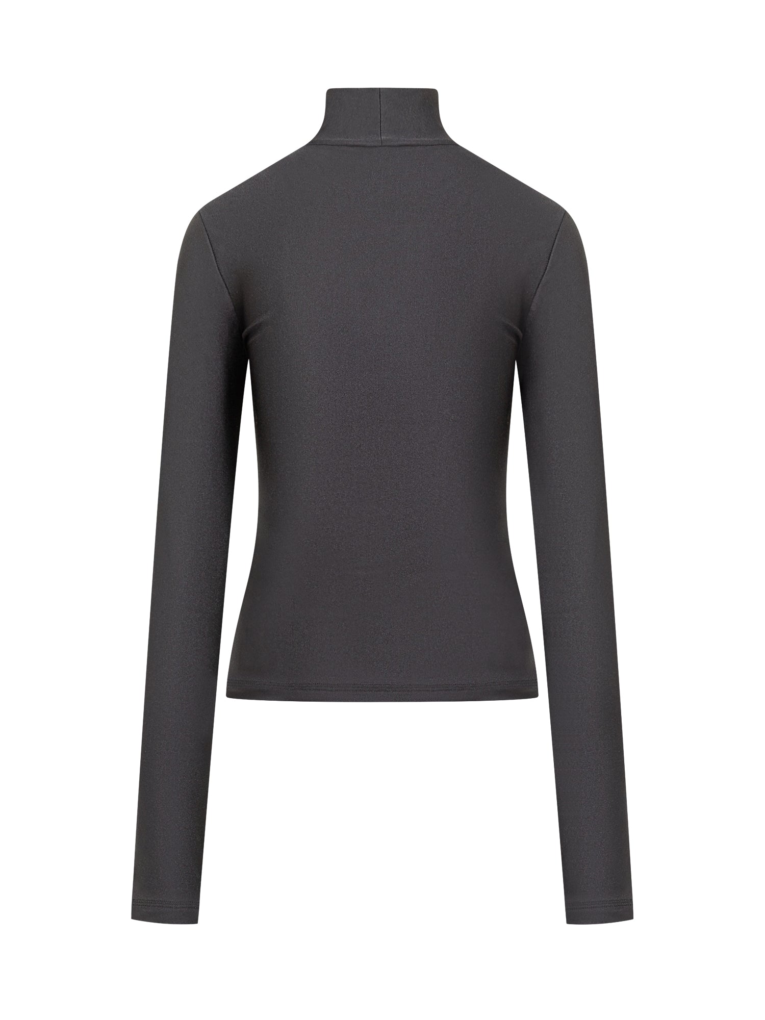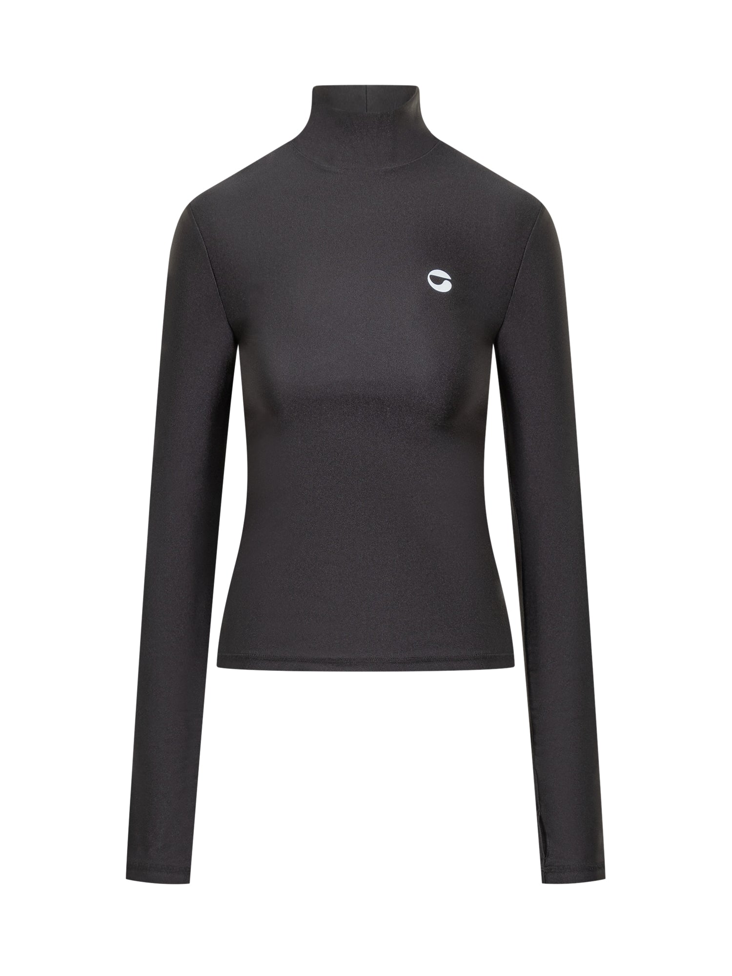 Long-sleeve top by Coperni in glossy stretch fabric, featuring a high neck and printed chest logo.