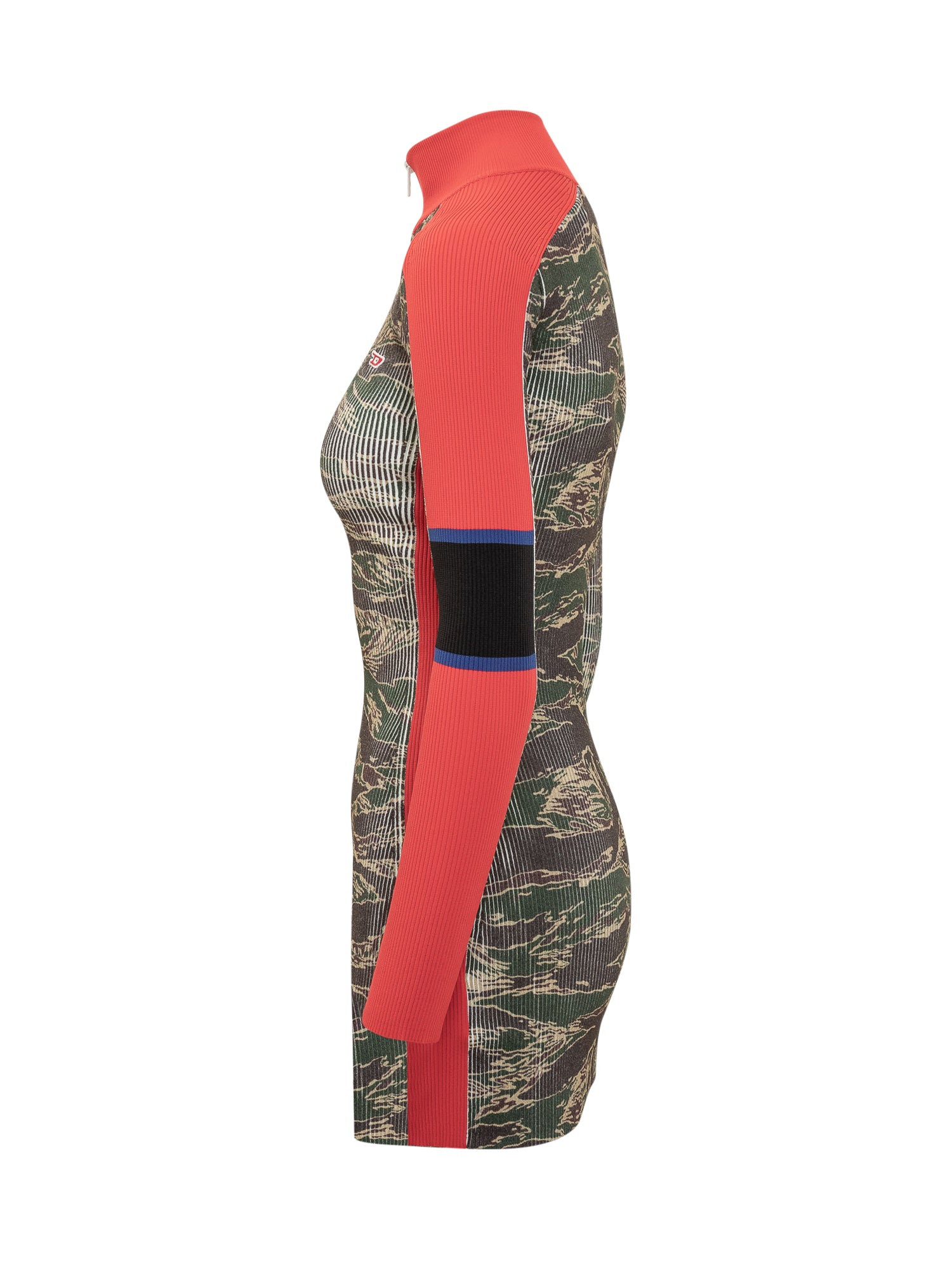 Diesel long-sleeve dress with camouflage print, high neck with zip, and contrasting red inserts.